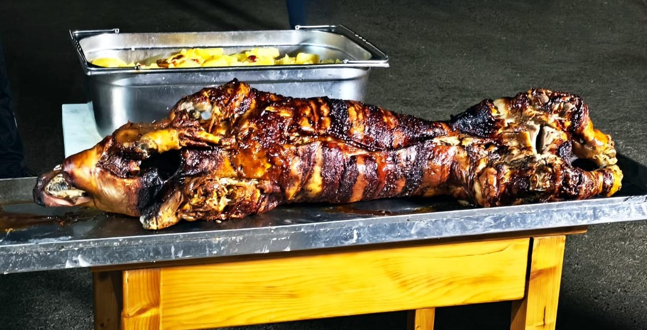 Le temps s'est amélioré, nous pouvons donc ouvrir les stores pour manger, tous ensembles, un porcelet à la broche accompagné de pommes de terre. Le "turón"que nous avons emmené d'Espagne fait fureur au moment du dessert...