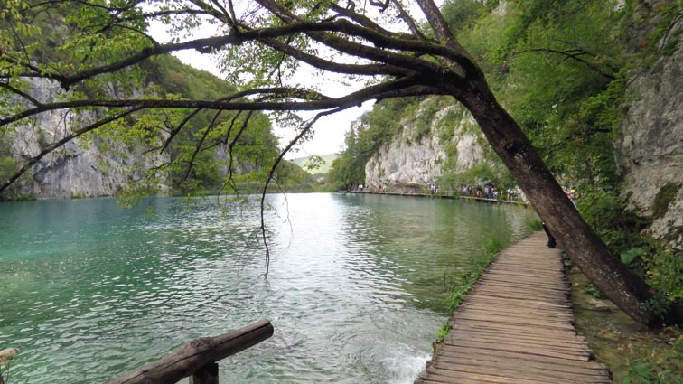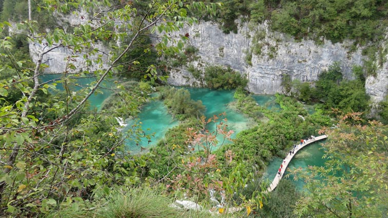 Après avoir débarqué, nous partons sur la droite jusqu'à l'extrémité du lac. Nous devons alors nous armer de beaucoup de patience pour longer la rive Est du lac Milanovak sur près de 500m, puis la rive Ouest du lac Kaluderovac. En effet, nous croisons des hordes de touristes, en particulier des asiatiques qui ne cessent d'entraver la circulation en marchant de front et en prenant des photos (ou plutôt des selfies), sans se soucier des personnes qui arrivent dans l'autre sens. Cette partie de la visite en devient même stressante, tant le site est surexploité...