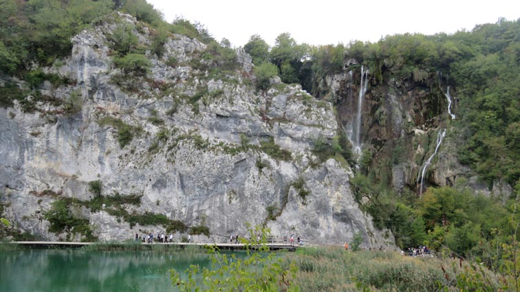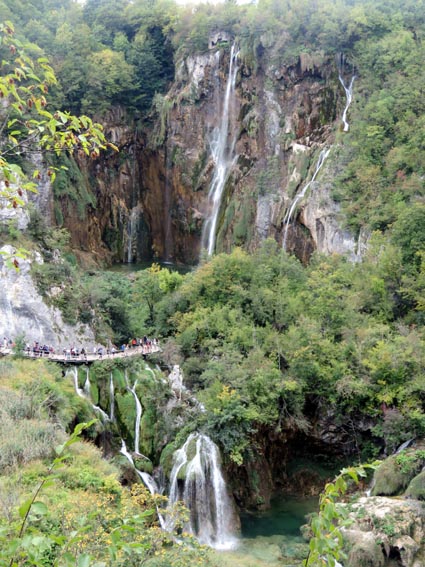 Un autobus vient nous prendre au camping à 9H00, pour aller visiter les lacs de Plitvice. Le Parc National de Plitvice comprend 16 lacs qui s'étagent de 636 à 480m d'altitude. Les eaux saturées en calcaire agglomèrent les débris végétaux, formant un dépôt solide et poreux : le travertin. Ces barrières naturelles créent des cascades spectaculaires, en particulier au printemps... Hélas, nous sommes ici à l'automne, au terme d'un été chaud où la sécheresse a sévi. Il n'y a donc que très peu d'eau dans les cascades (contrairement à celles de Krka).