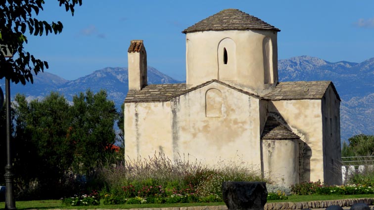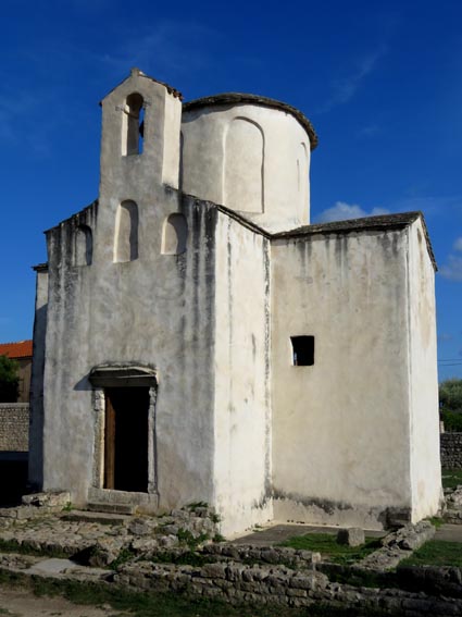 Nous visitons l’église Sainte-Croix qui se trouve juste à côté, et qui est considérée comme la plus petite cathédrale du monde : 7,80 m de long sur 7,60 m de large. Construite au IXème siècle, c'est l'église la plus ancienne de Croatie, et l'un des plus beaux exemples d'architecture paléochrétienne du pays. Elle fut le lieu de baptême des premiers rois croates. Mais, plus étonnant : cet édifice a aussi été conçu pour servir de cadran solaire et de calendrier. En effet, les rayons du soleil peuvent être observés dans l’église pendant les solstices d’été et d’hiver ainsi qu'aux équinoxes de printemps et d’automne... Nous avons la chance de la visiter seuls, et nous pouvons ainsi nous permettre de tester son admirable acoustique en chantant en basque un chant à la vierge : pur moment de bonheur que nous a probablement accordé l'évêque Grégoire..