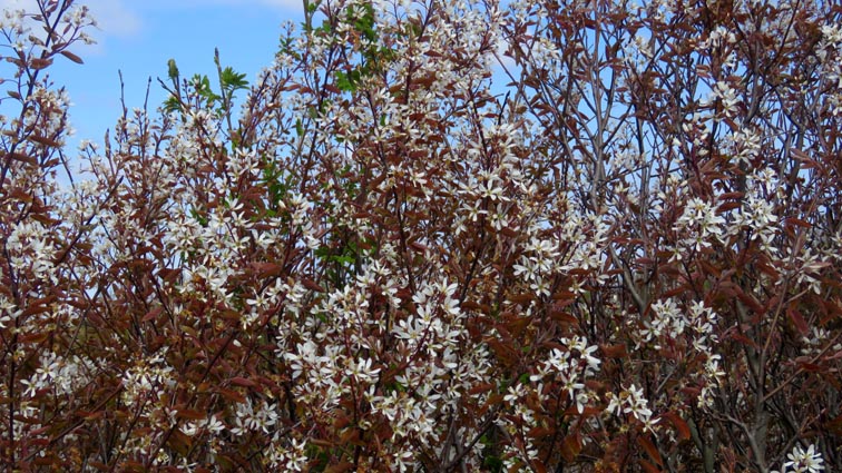 Famille des Rosacées. Arbuste très ramifié pouvant atteindre 9m de hauteur. Feuilles larges, cordiformes à elliptiques, aux bords finement dentés, 4-8cm de long, naissant bronze avant de verdir et de se colorer de rouge orangé à l'automne, . Fleurs blanches de 35 à 40 mm, étoilées, aux pétales larges, en grappes pendantes, de 6 à 12 cm de long, étamines de couleur jaune. Fruit pourpre foncé, 1cm de diamètre, comestibles, juteux et sucrés. Avril – mai. |