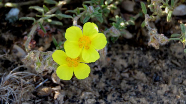 Famille des Cistacées Plante de 10-40 cm, vivace, ligneuse à la base, grisâtre, à rameaux dressés ou ascendants, velus-hérissés. Feuilles grisâtres oblongues-lancéolées ou linéaires, à bords plus ou moins enroulés, velues, blanches-tomenteuses au moins en dessous, à stipules linéaires. Fleurs jaunes marquées d'une tache orangée à l'onglet, en grappe terminale peu allongée, bractéolées, 5 pétales ovales, hispides, style allongé et genouillé, plus long que la capsule. Fruit : petite capsule ovale-trigone, tomenteuse, 1-2 fois plus courte que les sépales, à 3 graines grosses, granuleuses. Garrigues et coteaux calcaires, jusqu'à 1800m. Juin - juillet. |