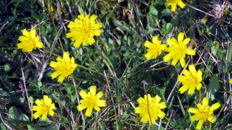 Famille des Composées Plante bisannuelle ou vivace à souche courte, fibreuse ou à racine pivotante, assez petite, légèrement poilue, tiges non ramifiées, à peine renflée sous les capitules, sans bractées foliaires. Feuilles radicales, oblongues étroites, plus larges dans la moitié supérieure, entières à pennatilobées. Capitules solitaires, jaune foncé, 12-20mm, avec des ligules périphériques violet grisâtre au revers, bractées florales lancéolées étroites, pâles, avec des poils raides. Fruit hérissé de pointes courtes et dures, surmonté d'un long bec supportant l'aigrette à soies denticulées. Prés, dunes de sable stabilisées, sur sol sablonneux ou calcaire Juin-octobre. |