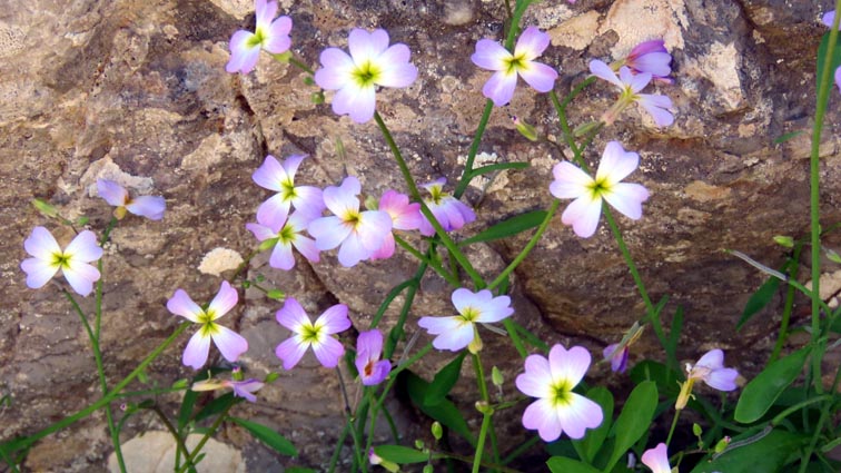 Famille des Crucifères Plante de 8-30cm de hauteur, avec des poils à 2 à 4 rayons. Feuilles inférieures lobées. Fleurs roses et blanches, avec le centre vert jaunâtre. Fruits : grappes de siliques grêles. Rochers calcaires et éboulis, jusqu'à 800m, endémique de Grèce. Avril |