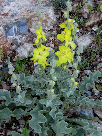Famille des Scrophulariacées Plante herbacée bisannuelle ou vivace, hermaphrodite, très poilue, à souche ligneuse, grandes tiges florifères non ramifiées émergeant d'une grande rosette de feuilles. Feuilles en rosette basale ou alternes, simples ou divisées pennatifides, densément couvertes de poils laineux blancs, gris ou jaunes, oblongues de 10 à 20cm de long, pétiolées, à bords lobés et très ondulés. Feuilles supérieures sessiles, à base atténuée, parfois sans ondulation. Bractées foliacées entières, à base tronquée. Fleurs à système radiaire jaune vif, de 15 à 50mm de diamètre, réunies par 2-5 en plusieurs petits bouquets espacés. Corolle à 5 pétales un peu inégaux, soudés en un tube court, calice à 5 sépales soudés, 5 étamines inégales à filet velu, poils des filets jaunâtres ou blancs, un style et un stigmate, ovaire supère. Fruits : capsules elliptiques à nombreuses graines de 4 à 6mm de long. Chemins, lieux incultes, pierreux ou sableux. Mars - août