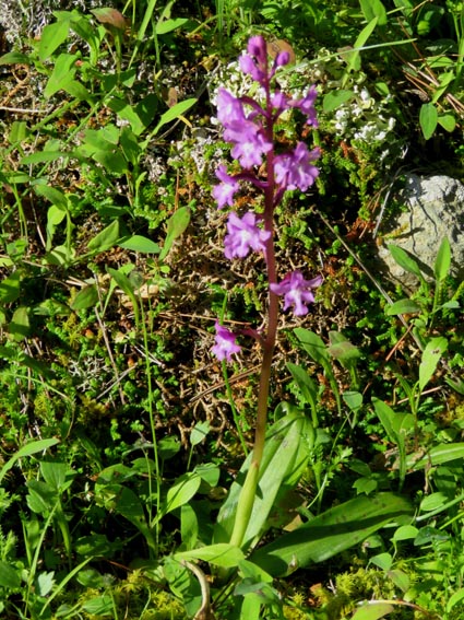 Famille des Orchidacées Plante vivace gracile, haute de 10 à 30 cm, tige rouge violacé au niveau de l'inflorescence, souvent assez flexueuse. Feuilles basales, 3-5cm, formant une rosette indistincte, largement lancéolées, quelque peu pliées ou canaliculées, vert frais avec ou sans taches foncées, les caulinaires, peu nombreuses, engainantes. Inflorescence lâche de 10-25 petites fleurs rose pâle à pourpre, plus claires au centre et ponctuées à la base de quatre petits points rouge violacé, sépales étalés, labelle trilobé, lobes latéraux étalés. Deux autres points sont cachés dans l'entrée de l'éperon. Les pétales sont regroupés en casque sur le gynostème. Éperon très fin et très long (généralement aussi long que l'ovaire), dirigé vers le bas. Sols secs et alcalins des régions méditerranéennes centrales et orientales (Italie du Sud, côte Dalmate, Albanie, Grèce, et certaines îles égéennes). Garrigues, pelouses rases, terrains caillouteux et sous-bois clairs, jusqu'à 1600 m d'altitude. Mars - mai. |