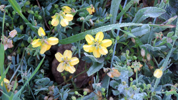 Famille des Légumineuses Plante vivace de 10-30cm, à souche ligneuse, tiges sous-ligneuses à la base, pleines, couchées-diffuses. Feuilles imparipennées, à 3-4 paires de folioles petites, obovales en coin, épaisses, la paire inférieure très rapprochée de la tige, stipules toutes soudées en une seule très petite (1 mm) et persistante. Fleurs jaunes, petites (5-7 mm), groupées par 5-10 en ombelles sur des pédoncules 2-3 fois plus longs que la feuille, pédicelles à peine plus longs que le tube du calice, à lèvre supérieure entière et tronquée. Gousses pendantes, 20-25mm, droites, à 2-5 articles oblongs, à 4 angles obtus, non ailés. Pelouses et coteaux calcaires. Mai - juillet |