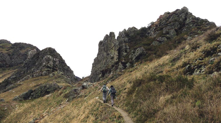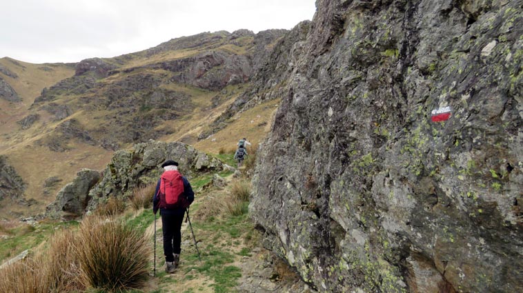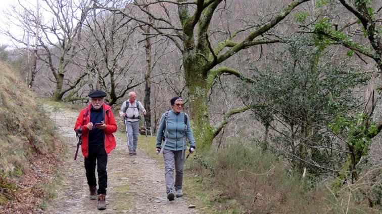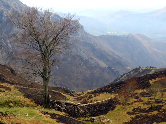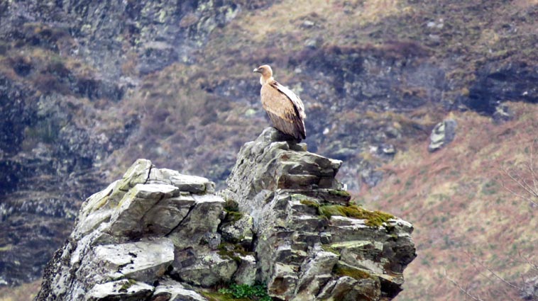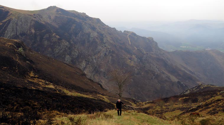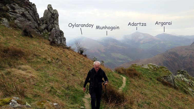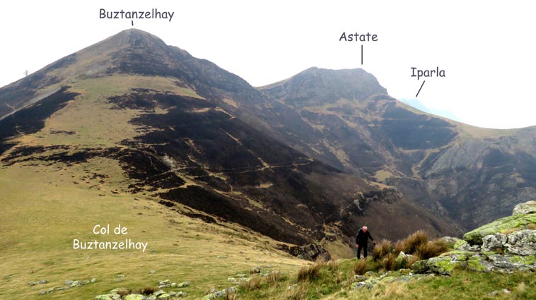 - 9H45 - 292m (AINT01) Nous démarrons en continuant sur la route qui monte vers le Nord. Il y a de l'Euphorbe des bois, des Violettes, et les Asphodèles sont en bouton. - 9H48 - 300m (AINT02) Nous prenons le chemin qui part sur la gauche en direction de la crête de Paulegi, en empruntant le tracé du GR10. - 10H02 - 309m (AINT03) Nous observons la présence d'une importante cavité sur la droite du chemin (il y en avait une plus petite un peu avant). Nous sommes un peu étonnés de démarrer sur un chemin qui descend, mais nous sommes pourtant sur le bon itinéraire. - 10H05 - 299m (AINT04) Alors que nous passons le point bas du chemin, nous trouvons de la Dorine à feuilles opposées, du Géranium Herbe à Robert et de la Pulmonaire officinale. - 10H07 - 311m (AINT05) Le chemin vire à gauche au moment où il traverse le ruisseau "Lixketako erreka". - 10H18 - 380m (AINT06) Une croix rouge et blanche sur le chemin d'en face nous indique qu'il faut suivre celui qui monte sur la droite. Nous avons le plaisir de trouver les premières Dents de chien de l'année. - 10H29 - 430m (AINT07) Nous voici à la base de la crête de Paulegi que nous allons maintenant remonter sur un bon sentier direction Nord-ouest. - 10H43 - 519m (AINT08) Après avoir dépassé un bouquet d'arbres, le sentier s'infléchit vers la gauche. Derrière nous, le panorama est déja intéressant : Hurbeleta, Larla, Baïgura, Jara, Arradoy, Belchou, Béhorléguy, Arthanolatze Gaina, Munhoa, Oylarandoy et Adartza. - 11H02 - 653m (AINT09) La pente est un peu sévère, mais nous avons quand-même le loisir d'observer un beau bouquet de Jonquilles. Nous voyons très bien en face de nous, le sommet d'Aintziaga, avec Buztanzelhay sur la droite. Beaucoup plus proche de nous, un vautour fauve est posé sur un rocher. - 11H15 - 712m (AINT10) Nous rejoignons l'extrémité d'une route au col d'Apaloy (Aphaloiko lepoa). Nous nous accordons une courte pause, avant de continuer sur le sentier qui se poursuit un peu en contre-bas sur la gauche direction Nord-ouest. Dans l'axe du sentier, le sommet d'Aintziaga nous paraît encore bien loin, avec Buztanzelhay et Astate sur la droite. - 11H23 - 707m (AINT11) Le sentier se poursuit sur la gauche sans rejoindre la ligne de crête, et nous passons une zone un peu plus rocheuse. - 11H31 - 752m (AINT12) Nous passons sur le versant Nord-est. Le sentier est très nettement tracé, mais à partir d'ici, il va partir en traversée dans des zones extrèmement pentues. L'ambiance est un peu particulière, car tout le secteur a été brulé récemment par les feux d'écobuage. L'odeur est forte et nos vêtements vont devoir passer à la machine... - 11H34 - 737m (AINT13) Nous passons au point bas du sentier, qui va maintenant remonter dans un secteur rocheux assez spectaculaire. - 11H37 - 751m (AINT14) Le sentier ne cesse de monter et de descendre dans les rochers. - 11H53 - 764m (AINT15) Le sentier vire à droite avant de repartir sur la gauche direction Sud. Nous trouvons les premières Narcisses bulbocodium de la saison. - 12H04 - 837m (AINT16) Nous obliquons vers la gauche (Sud-est) avant d'atteindre le col de Buztanzelhay, pour monter directement vers le sommet d'Aintziaga. - 12H15 - 905m (AINT17) Nous voici au sommet d'Aintziaga. Nous pouvons regretter que la visibilité ne soit pas très bonne, comme je le disais ci-dessus à cause de la brume, mais surtout de la pollution de l'air avec les fumées d'écobuage et le sable en suspension en provenance du Sahara. Le Buztanzelhay nous domine d'une centaine de mètres au Nord-ouest, avec Astate sur la droite, et le pic d'Iparla que nous devinons en arrière-plan. Larla se détache en avant-plan du Baïgura, puis nous voyons le Jara et Arradoy. Nous reconnaissons ensuite le Belchou et le Béhorléguy, mais le Pic d'Anie se perd dans la brume, et nous apercevons à peine le Pic d'Orhy. Munhoa et Oylarandoy sont bien plus proches de nous, puis viennent ensuite Munhogain, Adarza, Argarai et Laurigna. Urrizpilota et Elhorriko Kaskoa se trouvent sur la ligne de crête en face de nous au Sud, avec Autza un plus plus à l'Ouest. Seul le Mendaur se distingue à l'Ouest, et nous finissons le tour d'horizon avec Gorramendi et Otanarte. - 12H20 Nous entamons la descente sans tarder par le même chemin. - 12H25 - 836m (AINT18) Nous retrouvons le GR10 en contrebas du col de Buztanzelhay. - 12H54 - 750m (AINT19) Nous nous arrêtons pour manger avant de basculer sur le versant Sud-ouest. - 13H27 Nous nous remettons en marche. - 13H37 - 712m (AINT10) Nous repassons au col d'Apaloy, où nous empruntons la route qui descend sur notre gauche. - 13H41 - 675m (AINT20) Dans le premier virage gauche de la route, nous prenons le sentier balisé en rouge et blanc qui descend sur la droite. - 13H45 - 640m (AINT21) Nous retrouvons la route que nous empruntons en descendant sur notre droite. - 13H52 - 562m (AINT22) Nous passons devant un abreuvoir qui se trouve sur le côté droit de la route, et continuons en face en suivant le balisage du GR (sans prendre le chemin qui descend sur la gauche). - 14H00 - 512m (AINT23) Nous quittons la route pour suivre un chemin balisé en rouge et blanc sur la droite, qui va nous permettre de descendre sur la ligne de crête d'Arkazabal en obliquant direction Sud-est. Nous avons ainsi le Munhoa et Oylarandoy en face de nous. - 14H11 - 430m (AINT24) Nous laissons un sentier qui descend sur la droite en tournant à 90° vers la gauche sur le chemin principal, toujours balisé en rouge et blanc. - 14H17 - 379m (AINT25) Nous tournons à droite en face d'un gros chêne, en suivant le balisage du GR. Ce chemin est nommé sur la carte : "Ortzazabaleko bidea". Nous traversons alors une très belle forêt de bouleaux. - 14H24 - 310m (AINT26) Nous tournons à droite en arrivant à la route. - 14H27 Nous voici de retour au point de départ. La route que nous avons partiellement empruntée depuis le col d'Apaloy nous a donné des idées... Pourquoi ne pas