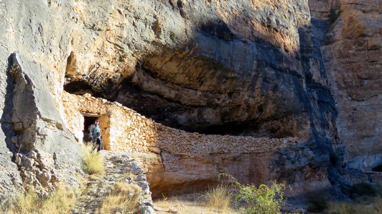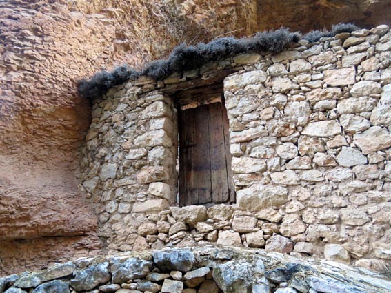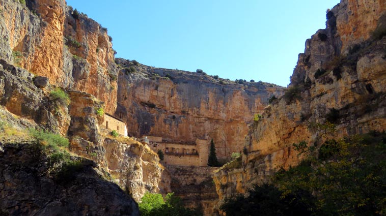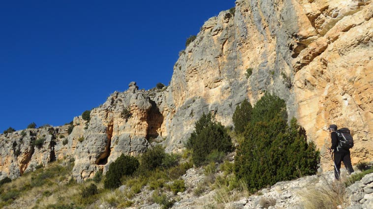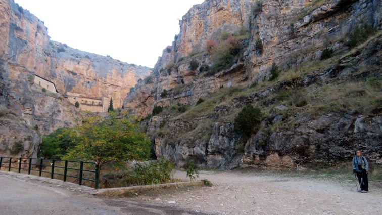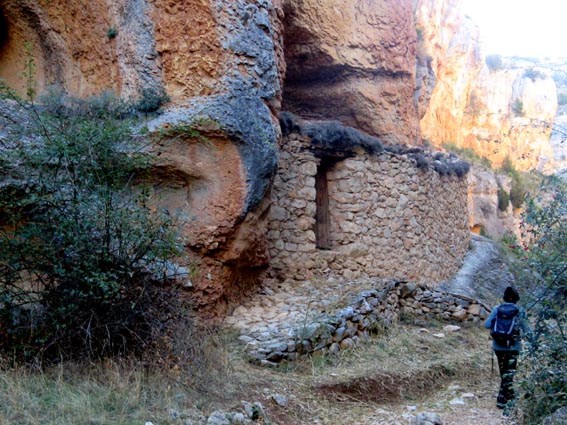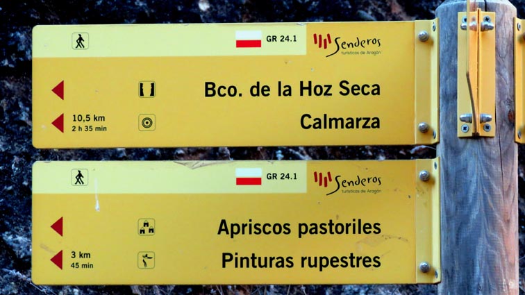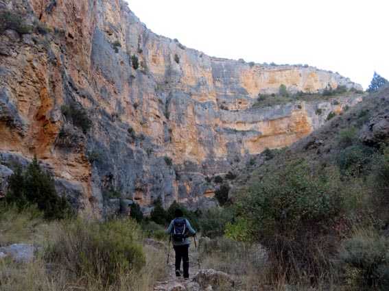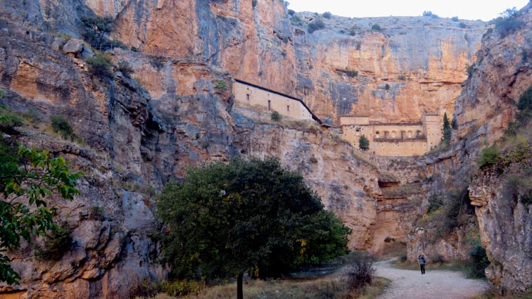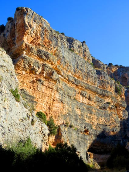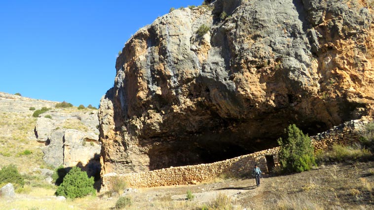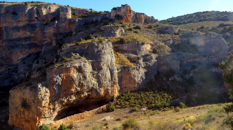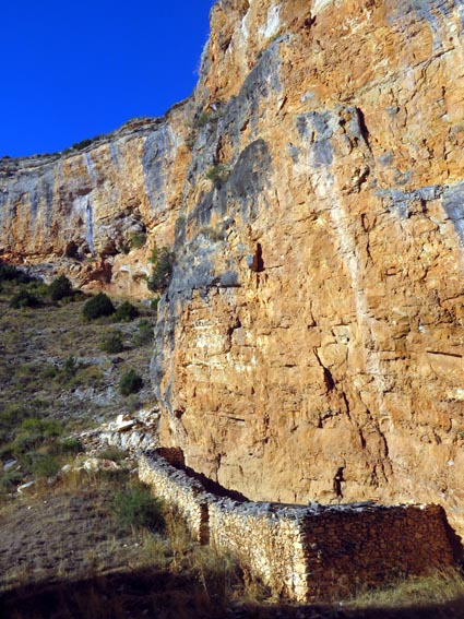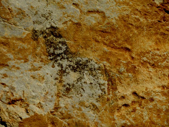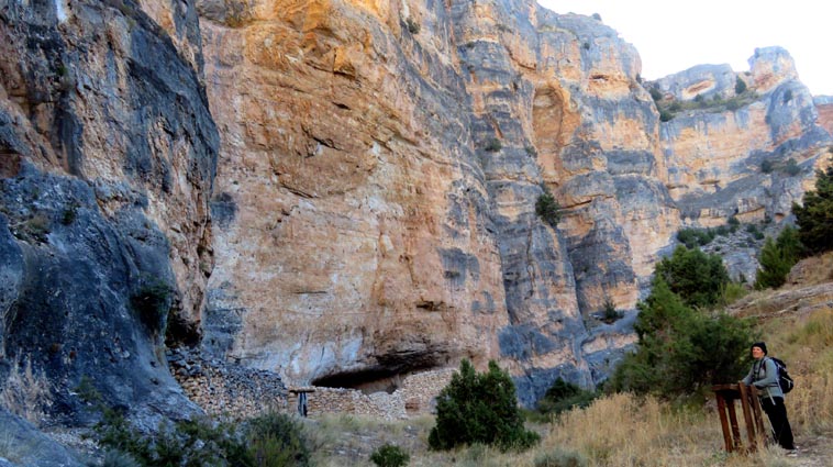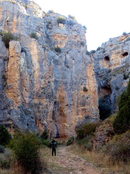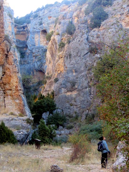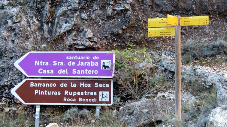 Nous sommes partis en camping-car le dimanche 26 d'Itxassou, en passant par les cols d'Otsondo et de Velate pour rejoindre Pampelune. Nous avons laissé Tafalla sur notre droite, puis Tudela sur notre gauche avant de virer à droite avant d'arriver à Saragosse pour passer à La Almunia de Doña Godina. Juste après avoir dépassé Calatayud, nous avons tourné à gauche pour passer à Munébrega, afin de rejoindre le camping Lago Resort de Nuévalos (41°13'06'' Nord - 1°47'32'' Ouest). Le gardien nous a reçu gentiment, et il nous a attribué une place sur une plateforme où nous étions tout seuls... Comme nous étions arrivés de bonne heure, nous en avons profité pour aller faire un tour jusqu'au village, dont l'église est spectaculairement perchée au sommet d'une falaise. Le lundi matin, nous rejoignons en camping-car, le village de Jaraba, qui se trouve à une quinzaine de kilomètres de notre camping. Nous contournons le village par la droite et poursuivons en direction de Campillo de Aragón, par la A-1501. Nous laissons le Balneario de la Virgen sur notre droite et allons nous stationner à côté du panneau d'entrée dans Jaraba, dans le sens inverse d'où nous arrivons. - 8H43 - 727m (NSJA01) Nous démarrons sur la piste carrossable en direction du Santuario de Nuestra Señora de Jaraba et du Barranco de la Hoz Seca, avec pour objectif de réaliser une boucle passant par la Roca Bendí, pour voir les peintures rupestres annoncées à 3km et 45 minutes de marche. Nous n'avons aucune chance de nous tromper, vu le nombre de panneaux, et sans compter le balisage rouge et blanc du GR 24.1. Immédiatement, nous découvrons le sanctuaire de Notre Dame de Jaraba qui se présente en face de nous, accroché à la falaise. L'homochromie de la roche et des murs du monastère nous plonge dans un site exceptionnel. On raconte que l’image de la Vierge de Jaraba est apparue lorsque des bergers aragonais gardaient et nourrissaient leur bétail dans la région. Les habitants ont donc décidé de placer cette image au creux de la falaise située à l'entrée du ravin de Hoz Seca. Ils y ont construit une minuscule chapelle qui s'est agrandie au fil du temps. La rumeur s'est répandue, telle une traînée de poudre, que cette vierge et les eaux environnantes donnaient lieu à des miracles : guérisons de maladies, grossesses, etc. Ainsi, en quelques années, ce sanctuaire qui date du XVIème siècle, est devenu un lieu de pèlerinage de profonde dévotion. C'est encore le cas aujourd'hui, puisque cinq villages (Campillo, Cimballa, Milmarcos, Calmarza et Cubel, selon les années) maintiennent la tradition de visiter la Vierge en pèlerinage au printemps, avec une messe commune, un grand repas et, bien sûr, une prière communautaire. - 8H48 - 766m (NSJA02) Lorsque la piste se divise en deux au pied du sanctuaire, nous prenons celle de gauche en direction des peintures rupestres. - 8H51 - 773m (NSJA03) Un panneau indique l'accès au sanctuaire sur la gauche, mais il est fermé. Nous poursuivons donc sur un bon chemin qui pénètre dans la profonde gorge de la Hoz Seca. - 9H02 - 782m (NSJA04) Nous sommes en même temps sur un sentier de découverte, et nous pouvons ainsi observer un panneau décrivant l'avifaune spécifique des lieux. Il y a bien entendu des vautours fauves avec environ 75 couples nicheurs, mais aussi des percnoptères, des faucons pèlerins, des hiboux grand-duc, des chocards à bec rouge, des choucas des tours et des hirondelles des rochers. Mais le panneau fait une mention spécifique concernant l'aigle de Bonneli qui fait l'objet d'un plan de sauvegarde, l'espèce la plus menacée d'Aragón. Au cours de la dernière décennie, sa population a connu un déclin alarmant, passant de 47 à 32 couples. - 9H07 - 796m (NSJA05) Le canyon vire brusquement à 90° vers le Sud. - 9H10 - 800m (NSJA06) Nous découvrons un enclos fermé par un mur en pierres sèches, niché au pied de la falaise. Nous constatons qu'il a été utilisé récemment car il y a encore de la paille et des crottes de brebis. Quelques mètres plus loin, une porte donne accès à une cavité. Un panneau nous explique que les agneaux y étaient placés à l'écart du troupeau, pour éviter qu'ils ne soient en contact avec la lumière, afin de préserver la blancheur de leur viande... - 9H20 - 802m (NSJA07) Un sentier part sur la gauche, mais nous continuons en face (Sud) en suivant le balisage rouge et blanc. Un panneau nous renseigne sur la végétation qui pousse dans le canyon. - 9H32 - 810m (NSJA08) Nous nous arrêtons quelques instants pour observer un splendide enclos aménagé en pied de paroi, avec des murs de 2m de haut. En pénétrant dans l'enclos, nous découvrons que l'on peut accéder dans une grotte qui devait servir de gite pour les bergers. - 9H46 - 819m (NSJA09) Nous trouvons encore un abri sous roche, puis un second juste un peu plus loin... Ces gorges visiblement ont été un lieu de pastoralisme important dans le passé. Nous trouvons quelques touffes de Fumeterre à neuf folioles. - 9H58 - 828m (NSJA10) Alors que nous arrivons à une intersection qui se trouve juste devant un grand abri sous roche, nous quittons le GR 24.1 qui continue dans la gorge en direction de Calmarza (à 7,500km), pour tourner à droite en direction des peintures rupestres. - 10H02 - 845m (NSJA11) Juste après un passage aménagé du chemin avec quelques marches d'escalier, nous faisons une halte de quelques minutes dans le virage, en nous asseyant quelques minutes sur un banc tout neuf, qui semble être tombé du ciel ! Nous profitons ainsi d'un point d'observation et de repos absolument idyllique ! Nous pouvons même enlever une couche de vêtements, car il fait très bon maintenant que nous sommes au soleil. - 10H17 - 829m (NSJA12) Après un passage protégé par un garde-corps constitué de piquets et de câbles en acier, le sentier balisé en vert et blanc vire à droite en contournant un grand éperon rocheux pa