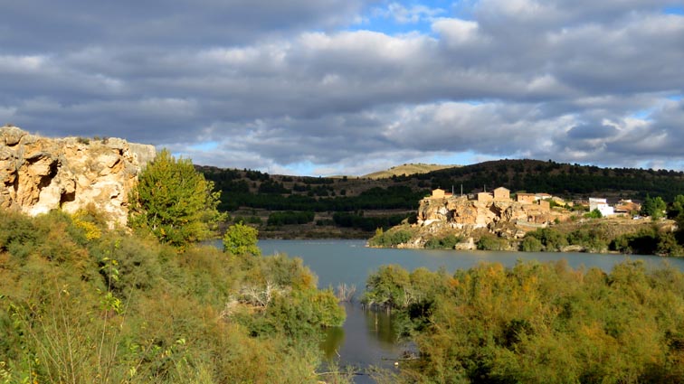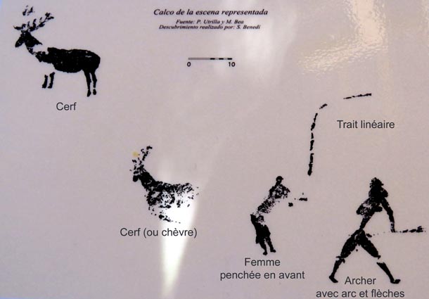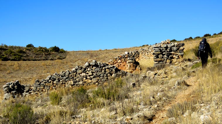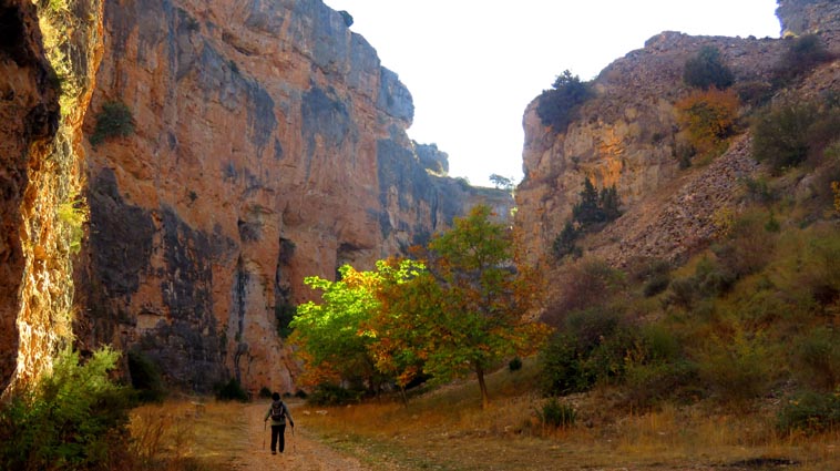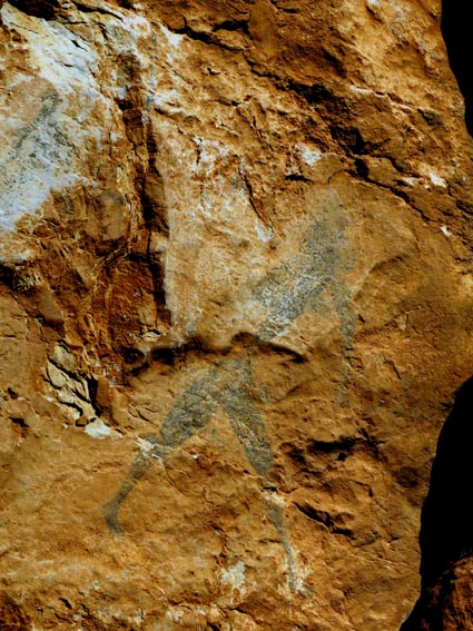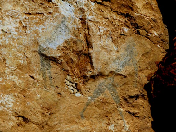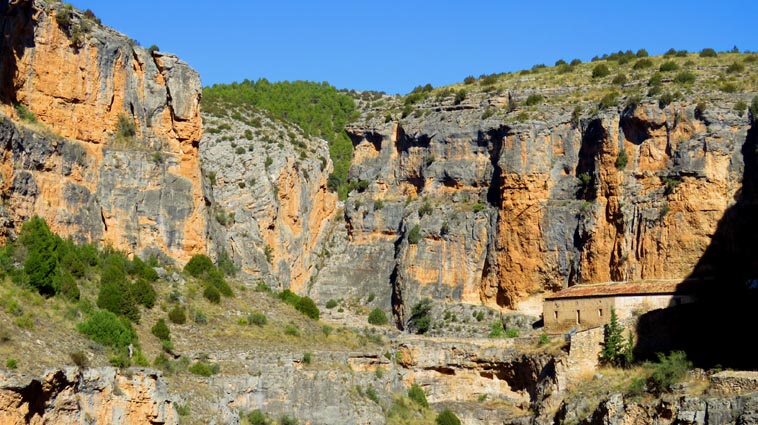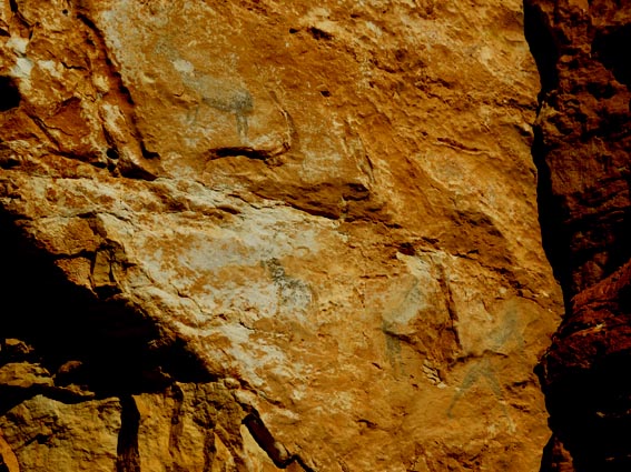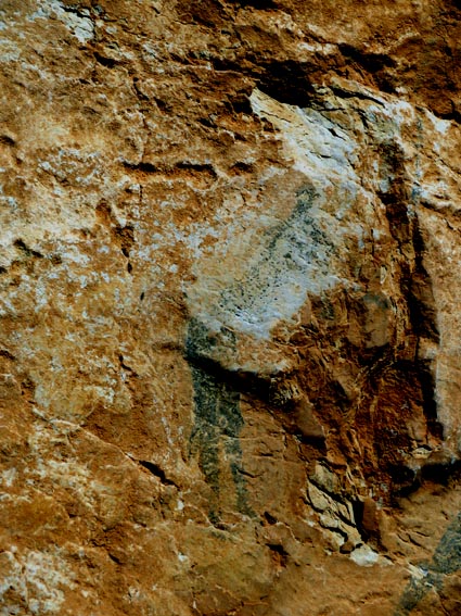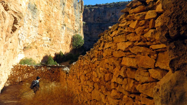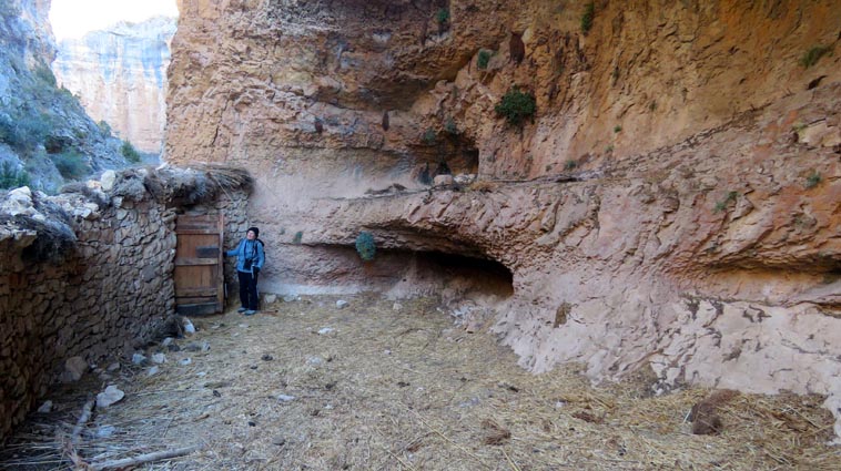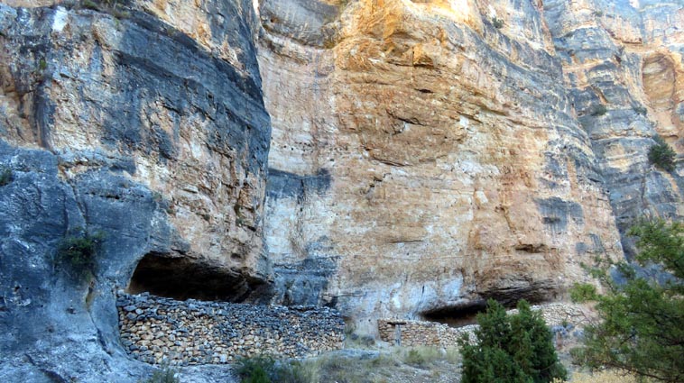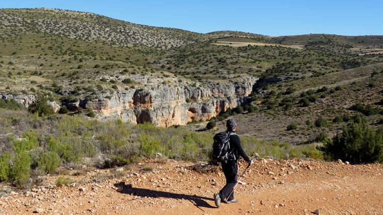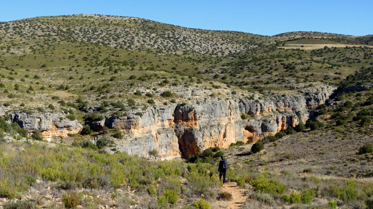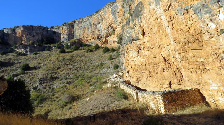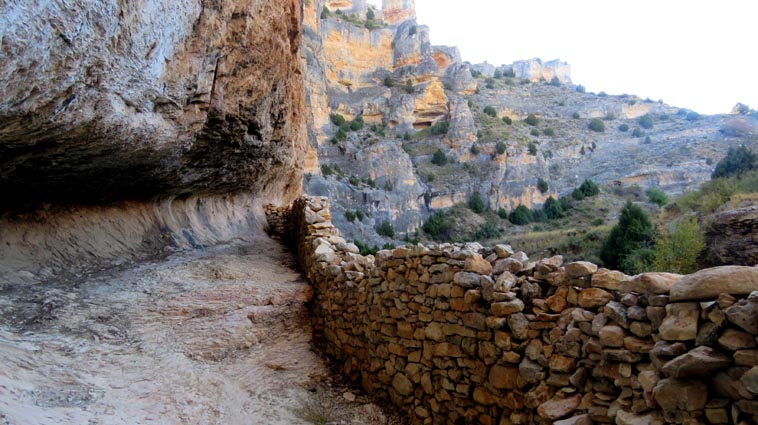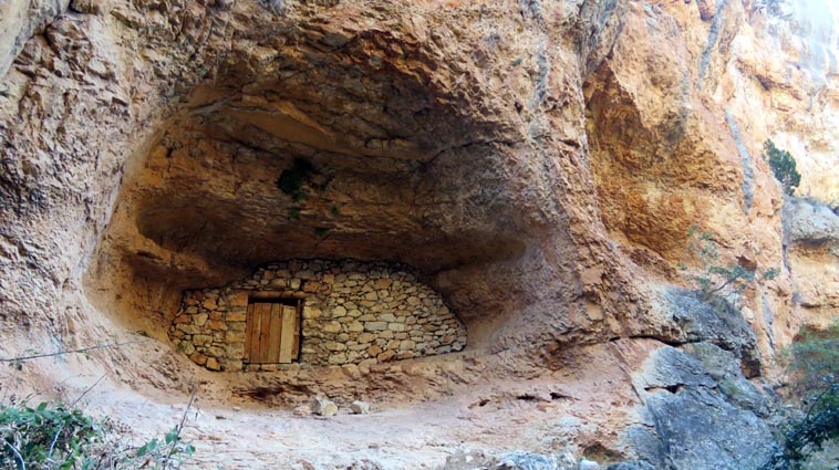 Nous sommes partis en camping-car le dimanche 26 d'Itxassou, en passant par les cols d'Otsondo et de Velate pour rejoindre Pampelune. Nous avons laissé Tafalla sur notre droite, puis Tudela sur notre gauche avant de virer à droite avant d'arriver à Saragosse pour passer à La Almunia de Doña Godina. Juste après avoir dépassé Calatayud, nous avons tourné à gauche pour passer à Munébrega, afin de rejoindre le camping Lago Resort de Nuévalos (41°13'06'' Nord - 1°47'32'' Ouest). Le gardien nous a reçu gentiment, et il nous a attribué une place sur une plateforme où nous étions tout seuls... Comme nous étions arrivés de bonne heure, nous en avons profité pour aller faire un tour jusqu'au village, dont l'église est spectaculairement perchée au sommet d'une falaise. Le lundi matin, nous rejoignons en camping-car, le village de Jaraba, qui se trouve à une quinzaine de kilomètres de notre camping. Nous contournons le village par la droite et poursuivons en direction de Campillo de Aragón, par la A-1501. Nous laissons le Balneario de la Virgen sur notre droite et allons nous stationner à côté du panneau d'entrée dans Jaraba, dans le sens inverse d'où nous arrivons. - 8H43 - 727m (NSJA01) Nous démarrons sur la piste carrossable en direction du Santuario de Nuestra Señora de Jaraba et du Barranco de la Hoz Seca, avec pour objectif de réaliser une boucle passant par la Roca Bendí, pour voir les peintures rupestres annoncées à 3km et 45 minutes de marche. Nous n'avons aucune chance de nous tromper, vu le nombre de panneaux, et sans compter le balisage rouge et blanc du GR 24.1. Immédiatement, nous découvrons le sanctuaire de Notre Dame de Jaraba qui se présente en face de nous, accroché à la falaise. L'homochromie de la roche et des murs du monastère nous plonge dans un site exceptionnel. On raconte que l’image de la Vierge de Jaraba est apparue lorsque des bergers aragonais gardaient et nourrissaient leur bétail dans la région. Les habitants ont donc décidé de placer cette image au creux de la falaise située à l'entrée du ravin de Hoz Seca. Ils y ont construit une minuscule chapelle qui s'est agrandie au fil du temps. La rumeur s'est répandue, telle une traînée de poudre, que cette vierge et les eaux environnantes donnaient lieu à des miracles : guérisons de maladies, grossesses, etc. Ainsi, en quelques années, ce sanctuaire qui date du XVIème siècle, est devenu un lieu de pèlerinage de profonde dévotion. C'est encore le cas aujourd'hui, puisque cinq villages (Campillo, Cimballa, Milmarcos, Calmarza et Cubel, selon les années) maintiennent la tradition de visiter la Vierge en pèlerinage au printemps, avec une messe commune, un grand repas et, bien sûr, une prière communautaire. - 8H48 - 766m (NSJA02) Lorsque la piste se divise en deux au pied du sanctuaire, nous prenons celle de gauche en direction des peintures rupestres. - 8H51 - 773m (NSJA03) Un panneau indique l'accès au sanctuaire sur la gauche, mais il est fermé. Nous poursuivons donc sur un bon chemin qui pénètre dans la profonde gorge de la Hoz Seca. - 9H02 - 782m (NSJA04) Nous sommes en même temps sur un sentier de découverte, et nous pouvons ainsi observer un panneau décrivant l'avifaune spécifique des lieux. Il y a bien entendu des vautours fauves avec environ 75 couples nicheurs, mais aussi des percnoptères, des faucons pèlerins, des hiboux grand-duc, des chocards à bec rouge, des choucas des tours et des hirondelles des rochers. Mais le panneau fait une mention spécifique concernant l'aigle de Bonneli qui fait l'objet d'un plan de sauvegarde, l'espèce la plus menacée d'Aragón. Au cours de la dernière décennie, sa population a connu un déclin alarmant, passant de 47 à 32 couples. - 9H07 - 796m (NSJA05) Le canyon vire brusquement à 90° vers le Sud. - 9H10 - 800m (NSJA06) Nous découvrons un enclos fermé par un mur en pierres sèches, niché au pied de la falaise. Nous constatons qu'il a été utilisé récemment car il y a encore de la paille et des crottes de brebis. Quelques mètres plus loin, une porte donne accès à une cavité. Un panneau nous explique que les agneaux y étaient placés à l'écart du troupeau, pour éviter qu'ils ne soient en contact avec la lumière, afin de préserver la blancheur de leur viande... - 9H20 - 802m (NSJA07) Un sentier part sur la gauche, mais nous continuons en face (Sud) en suivant le balisage rouge et blanc. Un panneau nous renseigne sur la végétation qui pousse dans le canyon. - 9H32 - 810m (NSJA08) Nous nous arrêtons quelques instants pour observer un splendide enclos aménagé en pied de paroi, avec des murs de 2m de haut. En pénétrant dans l'enclos, nous découvrons que l'on peut accéder dans une grotte qui devait servir de gite pour les bergers. - 9H46 - 819m (NSJA09) Nous trouvons encore un abri sous roche, puis un second juste un peu plus loin... Ces gorges visiblement ont été un lieu de pastoralisme important dans le passé. Nous trouvons quelques touffes de Fumeterre à neuf folioles. - 9H58 - 828m (NSJA10) Alors que nous arrivons à une intersection qui se trouve juste devant un grand abri sous roche, nous quittons le GR 24.1 qui continue dans la gorge en direction de Calmarza (à 7,500km), pour tourner à droite en direction des peintures rupestres. - 10H02 - 845m (NSJA11) Juste après un passage aménagé du chemin avec quelques marches d'escalier, nous faisons une halte de quelques minutes dans le virage, en nous asseyant quelques minutes sur un banc tout neuf, qui semble être tombé du ciel ! Nous profitons ainsi d'un point d'observation et de repos absolument idyllique ! Nous pouvons même enlever une couche de vêtements, car il fait très bon maintenant que nous sommes au soleil. - 10H17 - 829m (NSJA12) Après un passage protégé par un garde-corps constitué de piquets et de câbles en acier, le sentier balisé en vert et blanc vire à droite en contournant un grand éperon rocheux pa