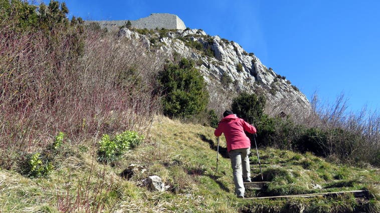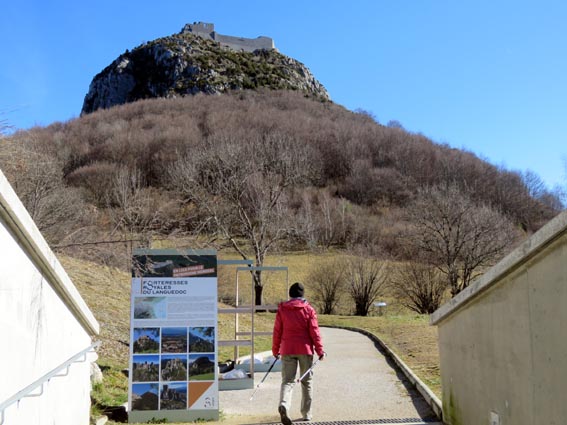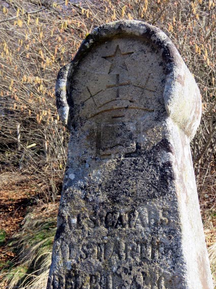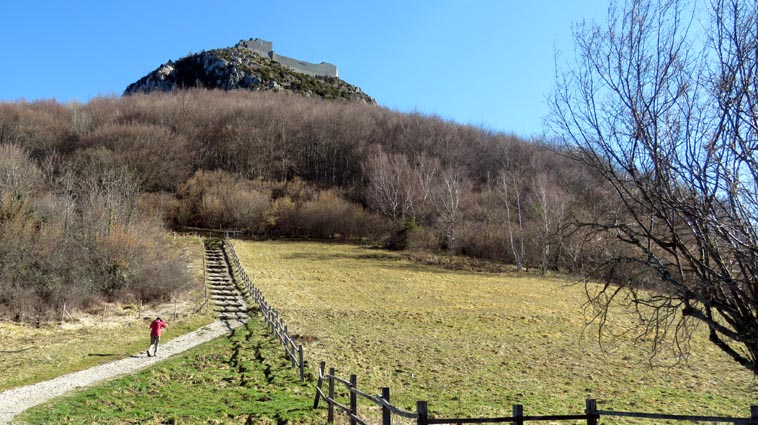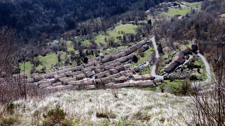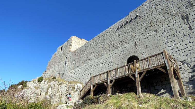 Partis la veille d'Itxassou en camping-car, nous avons dormi sur l'aire de Montferrier (42°53'33'' Nord - 1°47'32'' Est). Nous sommes montés au col de Montségur en matinée, où nous avons pu nous garer sur le grand parking devant le bâtiment d'accueil qui ouvre à 11H00 en cette saison. Il faut souligner que nous y avons été très gentiment accueillis. Le château de Montségur est implanté à 1207m d'altitude, au sommet d'un piton rocheux (un "pog" en occitan). Alors qu'il existait déjà au XIIème siècle, le château de Montségur est devenu au siècle suivant, le siège de l'église cathare, et le refuge des "faydits", les seigneurs qui avaient été dépossédés de leurs terres par la Croisade. Au moins 600 personnes vivaient alors dans ce site. La guerre contre les Albigeois mit à feu et à sang pendant plus de 30 ans une grande partie de l'Occitanie. Mais après l'assassinat de onze inquisiteurs par les "faydits", la nuit du 28 mai 1242, le pape Innocent III ordonna le siège de Montségur qui commencera un an plus tard. Le siège dura 10 mois, avec un hiver très rude. Le 16 mars 1244, plus de 220 cathares furent mis au bûcher, faute d'avoir accepté d'abjurer leur foi. - 11H13 - 1036m (MTSG01) Nous démarrons du bâtiment d'accueil en direction du château qui nous domine à l'Est. - 11H15 - 1040m (MTSG02) Nous croisons le sentier cathare qui descend vers Montferrier sur notre gauche, mais nous continuons à monter en face sur le chemin qui se prolonge par un escalier. Les Ficaires sont en fleurs. - 11H20 - 1051m (MTSG03) Alors que nous atteignons le sommet de l'escalier, nous observons une stèle qui se trouve sur la gauche et qui commémore le martyre des cathares. Nous continuons sur le chemin qui monte sur la droite, au bord duquel nous trouvons quelques Hépatiques. - 11H33 - 1117m (MTSG04) Le chemin est aménagé avec quelques madriers en bois pour servir de marches. Juste après le virage à gauche, nous observons attentivement le panneau qui nous donne des informations sur la religion cathare. Nous commençons à voir le sommet enneigé du Pic de Soularac. - 11H40 - 1144m (MTSG05) Alors que nous passons à côté d'une station d'Hellébore fétide, nous bénéficions d'un superbe point de vue plongeant sur le village de Montségur. Nous avons en face de nous, dans le même axe que le village, la montagne de la Frau. - 11H47 - 1165m (MTSG06) Un nouveau panneau nous renseigne sur les recherches qui depuis 1870 ont permis de retracer l'histoire du catharisme. Nous repérons quelques pieds de Pissenlit des Pyrénées. - 11H55 - 1194m (MTSG07) Nous voici au pied de l'escalier en bois qui va nous permettre d'accéder à l'intérieur du château. Nous constatons qu'il ne reste pas grand chose à l'intérieur et nous sortons donc par la porte Nord-est pour contourner le château. Nous accédons à la salle basse du donjon dont la voute est effondrée. L'intérêt du château de Montségur se situe donc davantage au niveau de son histoire, que sur les vestiges que l'on peut observer. Par contre le point de vue sur le Pic de Soularac et le Saint-Barthélemy est splendide, d'autant qu'ils sont abondamment enneigés. Nous apercevons également un peu plus à l'Ouest, le Rocher de Batail qui est également bien enneigé. Bien plus bas dans la vallée, nous distinguons le village de Roquefixade, dominé par son château implanté au sommet d'un éperon rocheux. Nous redescendons par le même itinéraire et arrivons au col à 12H32. Nous reprenons la route en direction du château de Quéribus. |