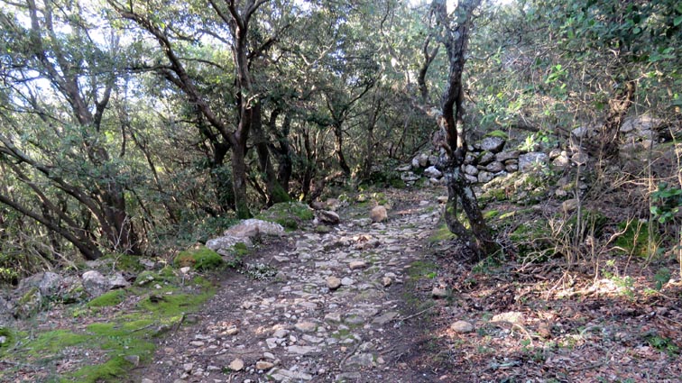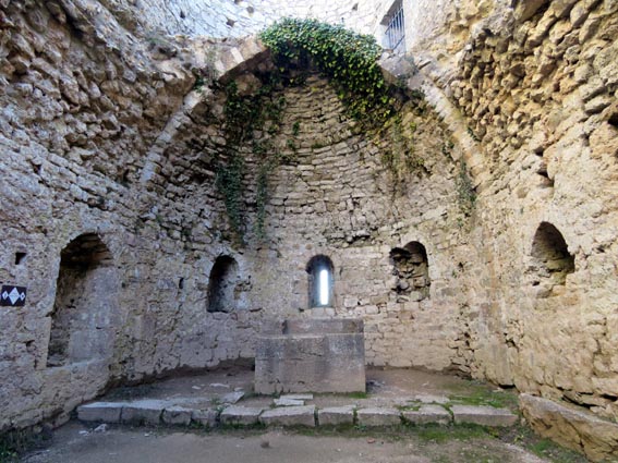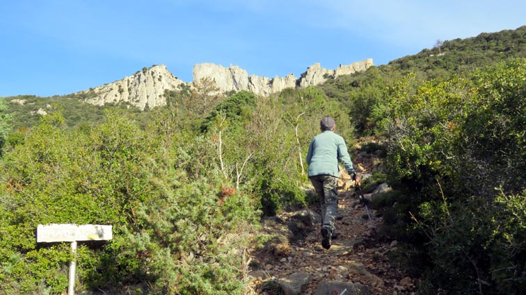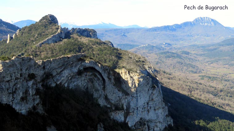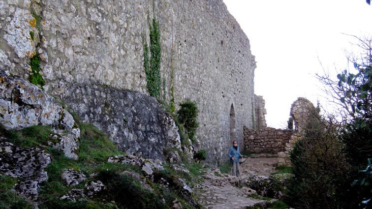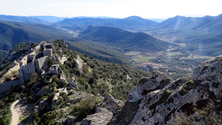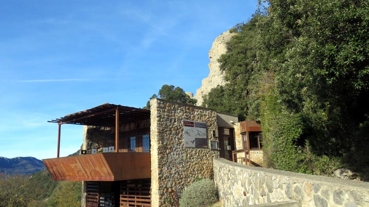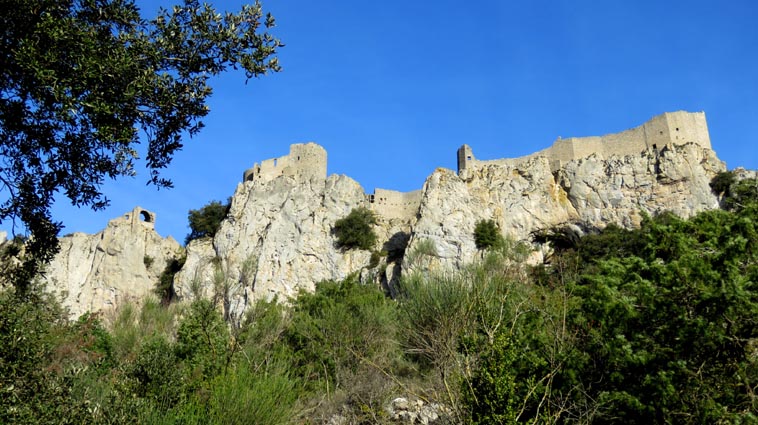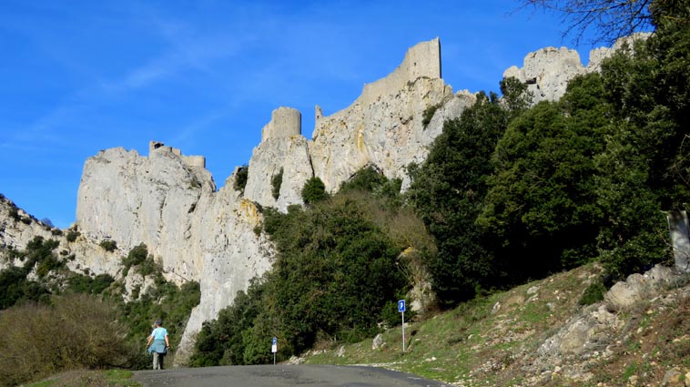 Le château de Peyrepertuse se déploie sur 300m de longueur sur la ligne de crête rocheuse, au-dessus du village de Duilhac-sous-Peyrepertuse. Il s'organise en trois grands secteurs : la première enceinte, l'enceinte médiane et le donjon de San Jordi. Déjà cité au IXème siècle, au XIème le château de Peyrepertuse appartenait au comté de Besalu, une petite contrée catalane. Pendant la croisade contre les Albigeois, Guilhem de Peyrepertuse rend hommage à Simon de Montfort, mais continue de résister, notamment en occupant le château de Puilaurens. C'est en 1240 que le roi de France Louis IX (Saint-Louis) prend réellement possession de Peyrepertuse. Son objectif était de protéger les frontières du royaume face au roi d'Aragon. Le château de Peyrepertuse fait partie d'un ensemble nommé couramment "Les Citadelles du Vertige", mais ce n'est pas véritablement un château cathare, même si les cathares ont pu momentanément s'y réfugier. - 8H43 - 361m (PEYP01) Nous démarrons du parking autorisé pour les camping-cars, de Duilhac-sous-Peyrepertuse, en prenant la voie qui se situe derrière le local sanitaire. Nous remarquons la présence importante d'une fleur blanche : la Fausse Roquette (Diplotaxis fausse-Roquette). - 8H44 - 362m (PEYP02) Nous virons à gauche pour monter en direction du château qui se détache sur la ligne de crête rocheuse. Nous nous régalons de voir les Amandiers couverts de fleurs. - 8H46 - 372m (PEYP03) Nous prenons la rue sur la droite qui pénètre dans le village (Chemin de la Batteuse). - 8H47 - 371m (PEYP04) Nous croisons une rue (Route ancienne du château) et continuons en face (Rue du Faubourg). - 8H48 - 370m (PEYP05) Nous obliquons à gauche pour continuer dans une ruelle pavée. - 8H49 - 369m (PEYP06) Nous prenons le chemin balisé en jaune qui monte sur la gauche. Au bout d'une soixantaine de mètres, nous passons entre une aire de jeux pour enfants et un terrain de basquet. - 8H53 - 388m (PEYP07) Nous rejoignons la route au niveau du parking P2, et nous l'empruntons en montant sur la droite. - 8H57 - 406m (PEYP08) Nous prenons le chemin caillouteux qui monte sur la droite en direction du château de Peyrepertuse, par le sentier cathare GR367. Nous remarquons que certains passages de ce chemin ont été pavés. - 9H05 - 442m (PEYP09) Le sentier vire à droite sous les Chênes verts, juste en-dessous de la route. - 9H06 - 442m (PEYP10) Lorsque le sentier se divise en deux, nous prenons la branche de gauche, balisée en rouge et blanc. - 9H07 - 448m (PEYP11) Nous quittons le GR en empruntant le sentier balisé en jaune qui monte sur la droite en direction du château. - 9H31 - 580m (PEYP12) À la faveur d'une éclaircie de la végétation et de quelques mètres de chemin où la pente s'assagit, nous pouvons voir le château qui se détache en face de nous, mais il nous paraît encore bien loin et bien haut ! - 9H35 - 602m (PEYP13) Nous traversons la route, et prenons le chemin qui monte en face vers la gauche, malgré une croix rouge et blanche. - 9H37 - 604m (PEYP14) Nous prenons le sentier balisé en jaune qui monte sur la droite. - 9H42 - 639m (PEYP15) Nous avons encore un superbe point de vue sur le château. - 9H49 - 672m (PEYP16) Nous rejoignons la route, et nous l'empruntons en montant sur notre gauche. Nous voyons le château de Quéribus avec la Méditerranée en arrière plan, mais nous voyons aussi très bien le massif du Madrès qui est très enneigé (direction Sud-ouest), ainsi que le Carlit qui pointe sur la droite. - 10H05 - 694m (PEYP17) Nous passons au bâtiment d'accueil pour acheter les billets d'entrée et pour prendre des audio-guides. Nous suivons le sentier qui commence par descendre légèrement avant de virer à gauche pour monter versant Nord en direction du château. Le chemin est relativement escarpé, et légèrement glissant à cause des nombreuses pluies qui se sont abattues ces dernières semaines. Quelques passages sont aménagés avec des escaliers en pierres. Nous dominons le village de Rouffiac-des-Corbières. Nous passons une première porte qui donne accès à la loge du portier, puis nous observons la longue muraille de 120m de long qui ferme l'enceinte de la partie inférieure du château côté Nord. Nous accédons ensuite au donjon vieux, où nous voyons en particulier les restes de l'église Sainte-Marie, datée du XIème siècle. Nous passons la porte du donjon vieux pour rejoindre l'enceinte médiane. Le bâtiment polygonal comprenait deux niveaux, le rez-de-chaussée pour les animaux et l'étage pour le grain. On voit encore un orifice dans le sol pour accéder à une glacière naturelle où pouvaient être conservées les denrées alimentaires. - 10H54 - 755m (PEYP18) Nous voici au pied de l'escalier de Saint-Louis, qui va nous permettre d'accéder au donjon "San Jordi", un ensemble qui dote la forteresse de bâtiments modernes (en 1242) et lui confère un caractère puissant, véritable arme de dissuasion... - 11H06 - 782m (PEYP19) Nous voici au sommet du donjon de San Jordi où nous trouvons les vestiges d'une chapelle. Mais c'est le point de vue qui s'offre à nous qui récompense les efforts de notre ascension : château de Quéribus, Puig Neulós, Madrès, Pech de Bugarach, et même le Pic Saint-Loup au Nord-est. - 11H25 - 694m (PEYP17) Nous repassons au bâtiment d'accueil et descendons par le même itinéraire. Au cours de la descente nous trouvons des Hépatiques, des Véroniques petit-chêne, des Pâquerettes vivaces, de l'Euphorbe des bois et de l'Hellébore fétide. - 11H25 Nous voici de retour au point de départ. Nous repartons par Cucugnan, Padern, Tuchan, Villeneuve-les-Corbières, Durban-les-Corbières, Thézan-des-Corbières, Ferrals-les-Corbières, Foncouverte, Capendu, Marseillette, Aigues-Vives et Laure-Minervois pour rejoindre le gouffre géant de Cabrespine : 43°21'28.0'' Nord - 2°27'23.2'' Est. Nous nous installons sur le premier parking ombragé pour y passer la nu
