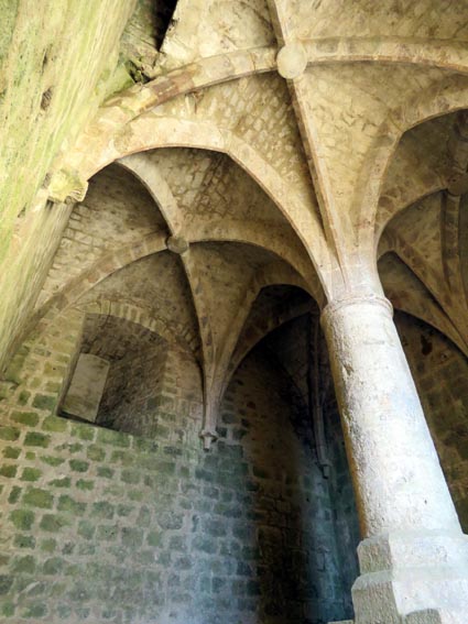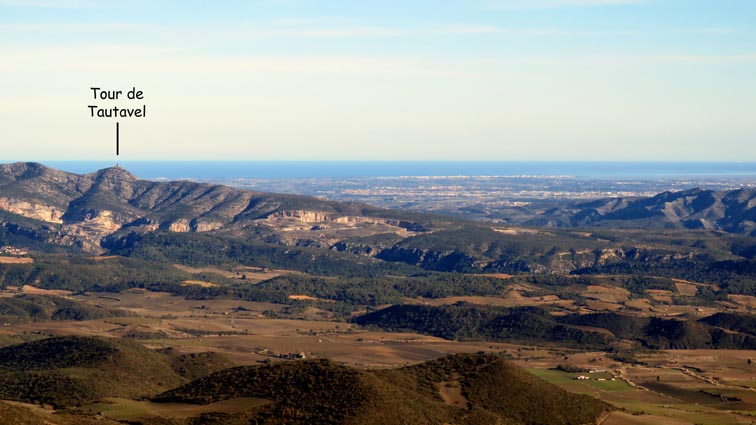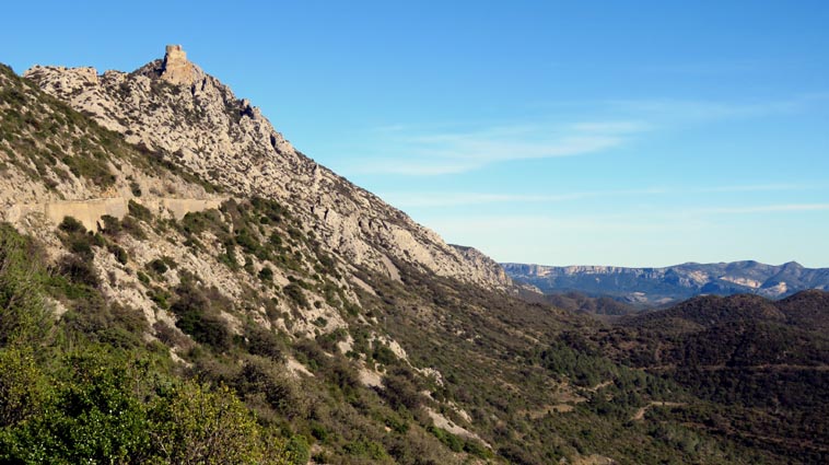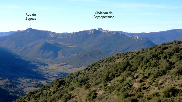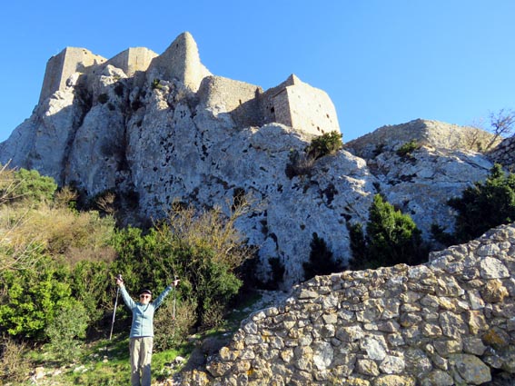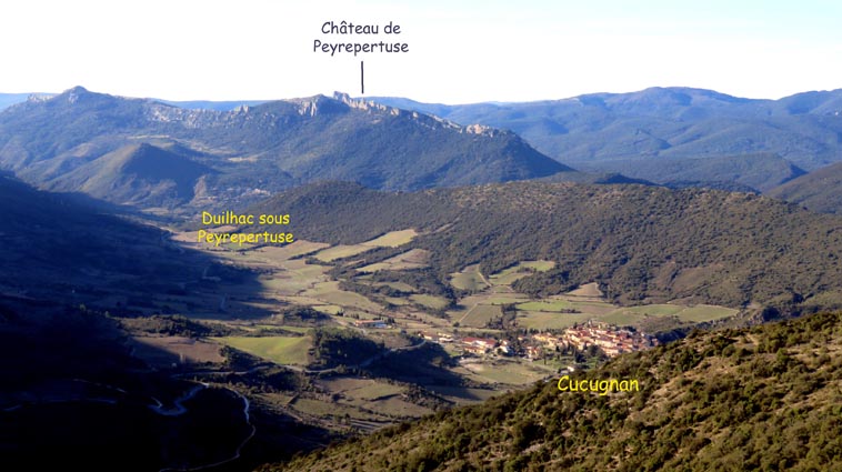 Après avoir visité le château de Montségur, nous sommes repartis en camping-car par Belosta, Puivert et Quillan. Nous sommes passés à Saint-Paul-de-Fenouillet pour rejoindre Maury où nous avons tourné à gauche en direction de Cucugnan et des Châteaux de Quéribus et de Peyrepertuse. Avant d'arriver à Cucugnan, nous avons tourné à droite au niveau du col, en direction du château de Quéribus. Nous avons pu nous garer sans problème sur le parking situé en-dessous du château, à proximité du bâtiment d'accueil : 42°50'20.7'' Nord - 2°37'16.5'' Est. Le château de Quéribus est implanté à un peu plus de 700m d'altitude, au sommet d'un piton rocheux. Quéribus est mentionné pour la première fois au XIème siècle. Après sa prise en 1255, il est intégré au dispositif de défense de la frontière de la France avec l'Aragon. Contrairement à ce que l'on pourrait penser, il n'a rien de cathare, malgré le fait qu'il en fut l'un des derniers refuges... L'annexion du Roussillon par la France en 1659, dans le cadre du traité des Pyrénées, a repoussé la frontière jusqu'aux Pyrénées, diminuant fortement son importance stratégique. Le château s'est dégradé jusqu'en 1951, date à partir de laquelle il a été progressivement restauré. D'une enceinte à l'autre, Quéribus dévoile l'organisation d'une forteresse importante. Les éléments du Moyen-âge s'enchevêtrent avec ceux de la Renaissance, formant un ensemble homogène garantissant l'efficacité des défenses et la qualité de vie pour ses occupants. - 16H07 - 606m (QUER01) Nous démarrons du bâtiment d'accueil sur un chemin parfaitement bien aménagé. - 16H08 - 610m (QUER02) Le chemin vire à droite en direction du château. En nous retournant, nous distinguons déjà très bien le château de Peyrepertuse, implanté sur une ligne de crête rocheuse, direction Nord-ouest. - 16H15 - 651m (QUER03) Nous voici déjà au pied de l'escalier d'accès au château. - 16H22 - 666m (QUER04) Nous franchissons la porte d'entrée de la première enceinte, et bénéficions déjà d'un splendide point de vue qui s'étend jusqu'à la Méditerranée. Nous repérons en particulier la Tour de Tautavel et le Puig Neulós. Il nous faut monter un escalier aux marches particulièrement hautes pour accéder à la troisième enceinte, où nous pénétrons par une porte surmontée d'une bretèche. Nous traversons une étonnante salle dont le plafond est constitué de quatre voutes en croisées d'ogive, réparties au sommet d'un imposant pilier central. Ce système architectural contribuait à rendre l'ouvrage quasi indestructible. - 16H40 - 706m (QUER05) Nous voici au sommet du donjon. Le point de vue sur les Pyrénées est splendide, avec en particulier le Canigou qui est particulièrement enneigé. Nous dominons le village de Cucugnan et apercevons Duilhac-sous-Peyrepertuse. - 16H54 Nous sommes de retour au parking. Nous redescendons jusqu'au col où nous tournons à droite pour rejoindre le village de Duilhac-sous-Peyrepertuse où nous allons nous installer sur un parking où les camping-cars ont le droit de rester pour la nuit (il y a même une aire de vidange et un point d'eau) : 42°51'41.8'' Nord - 2°33'54.4'' Est).