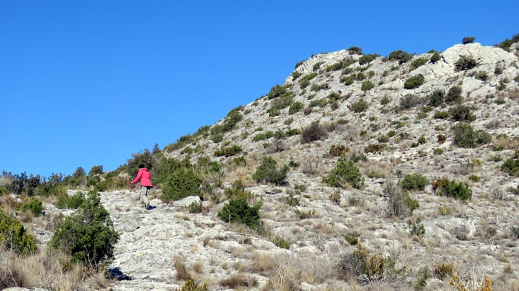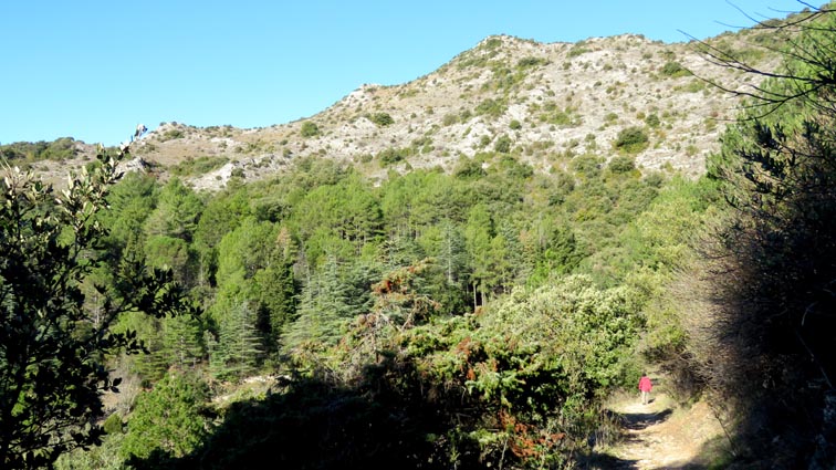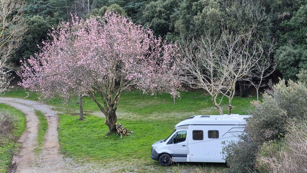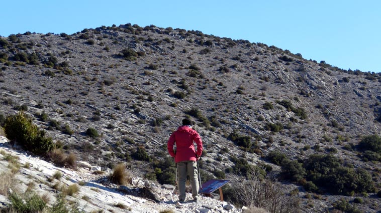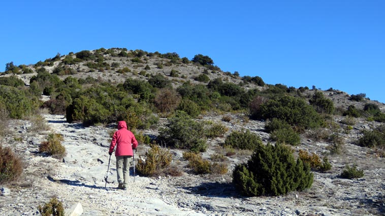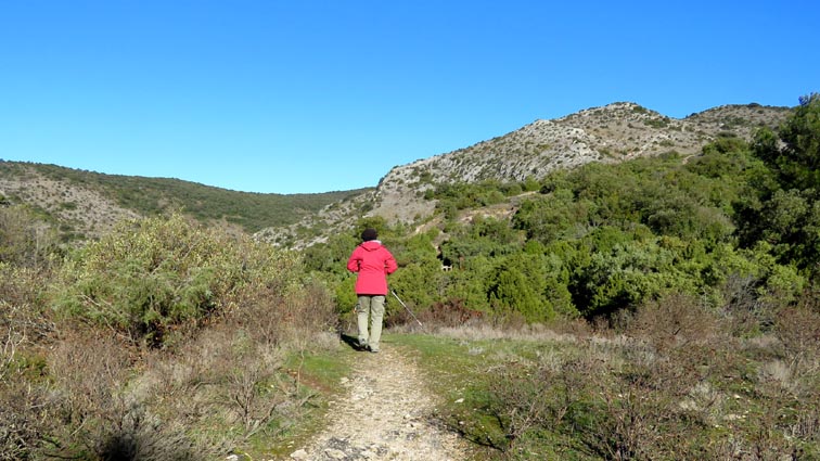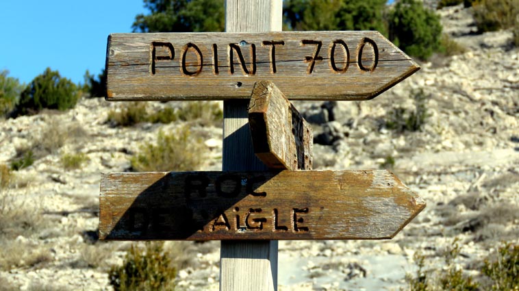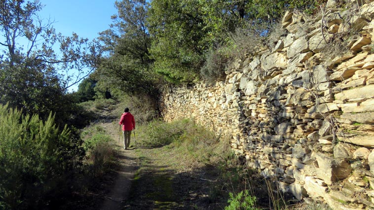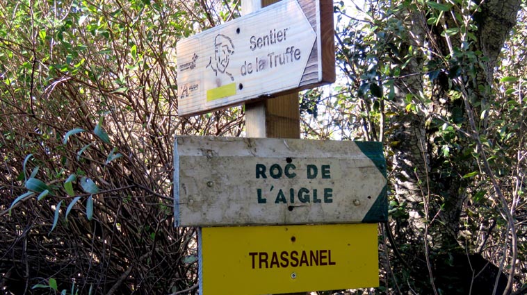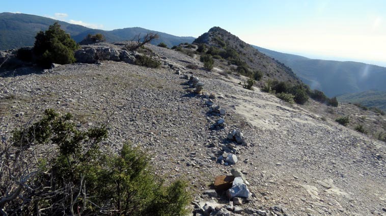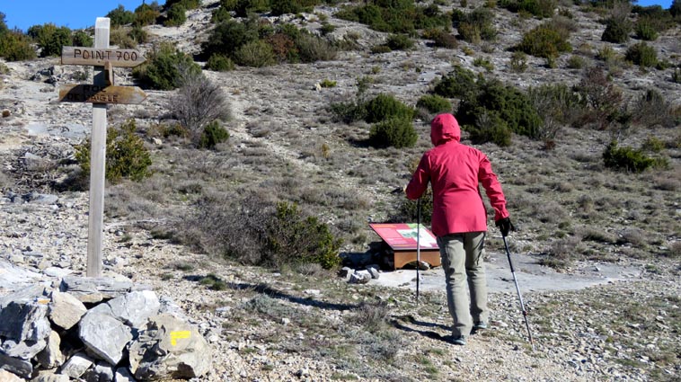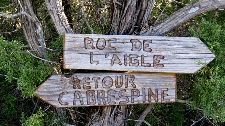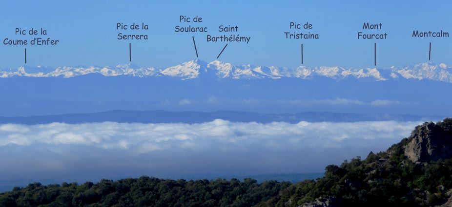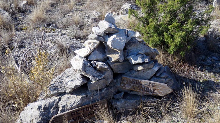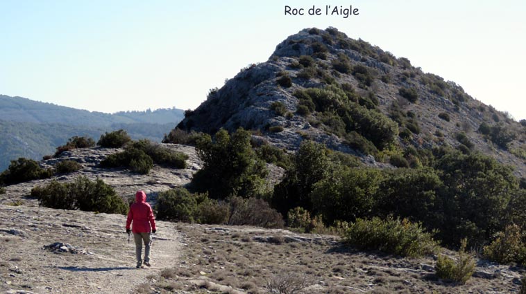 Après avoir visité le magnifique gouffre géant de Cabrespine, nous avons passé une nuit parfaitement calme sur le parking. - 9H08 - 416m (ROCA01) Nous démarrons du parking inférieur du gouffre géant de Cabrespine en montant sur la route. - 9H13 - 427m (ROCA02) Nous passons devant l'entrée du gouffre, et continuons en face, en longeant le mur parapet qui se trouve sur la droite. - 9H15 - 429m (ROCA03) Nous tournons à gauche pour emprunter la piste en béton qui monte en direction de l'arbre aux racines. - 9H17 - 433m (ROCA04) Nous prenons le chemin qui monte sur la droite. - 9H18 - 439m (ROCA05) Nous nous arrêtons pour lire les explications concernant l'arbre aux racines. Il s'agit d'un simple chêne vert, dont les racines plongent à 7m sous terre, et que nous avons pu voir lorsque nous avons visité le gouffre. Nous pouvons donc réaliser à quel point la couche de roche qui nous sépare du gouffre est mince... Quand on pense que la profondeur du gouffre est de l'ordre de 250m, on peut imaginer la chute que pourrait provoquer un effondrement de la voûte de cette spectaculaire cavité... Nous apprenons que nous sommes sur le chemin des "Escoles", et qu'avant 1850, c'était la seule voie qui permettait de rejoindre la plaine. Il reliait le village de Cabrespine à Tramassel. Des générations de Cabrespinois sont donc passées ici avec des chariots lourdement chargés, durant des siècles et des siècles, sans se douter de l'existence du gouffre. Nous découvrons aussi que nous sommes en Montagne Noire, au pays de la truffe. Ce fameux chêne aux racines est lui-même un chêne truffier. - 9H28 - 468m (ROCA06) Nous laissons une ruine de bergerie sur notre gauche, alors qu'un nouveau panneau d'information nous en apprend un peu plus sur la récolte de la truffe au mois de février, et sur l'élevage ovin qui fut important autrefois dans le secteur. - 9H32 - 489m (ROCA07) Lorsque le chemin se divise en deux branches, nous continuons sur celle de droite, bien balisée en jaune. - 9H38 - 518m (ROCA08) Nous arrivons à un carrefour, lieu dit : "Tressanel", et justement le sentier de la truffe nous y rejoint par la gauche. Nous continuons en descendant en face de nous en direction du Roc de l'Aigle. - 9H41 - 510m (ROCA09) Nous franchissons un portail qui nous permet de passer une clôture destinée à protéger les plantations des dégâts causés par les sangliers. - 9H46 - 503m (ROCA10) Le chemin vire à gauche après une grange. - 9H47 - 496m (ROCA11) Nous laissons un sentier qui descend sur la gauche en direction d'une grotte, et nous continuons à monter en face de nous, toujours en direction du Roc de l'Aigle. Nous laissons rapidement un second sentier sur la gauche et continuons notre progression sous les chênes verts. - 9H48 - 500m (ROCA12) Nous franchissons un second portail. - 9H52 - 516m (ROCA13) Et voici un troisième portail... - 9H54 - 516m (ROCA14) Nous laissons un sentier qui descend sur la gauche en direction de Trassanel, pour continuer en face de nous en franchissant une chicane en rondins. Nous accédons ainsi à une portion d'itinéraire où la pente est un peu plus sévère. - 9H58 - 546m (ROCA15) Le sentier vire à gauche au sommet d'une petite butte. - 10H04 - 576m (ROCA16) Au niveau d'un cairn, le sentier balisé en jaune se poursuit sur la gauche (une croix jaune interdit de monter sur la droite pour éviter d'amplifier l'érosion du terrain). - 10H10 - 605m (ROCA17) Un panneau nous renseigne sur l'évolution du paysage des Escoles depuis 1948. Il y avait peu de végétation au niveau où nous nous trouvons, et en contrebas, il y avait des terrasses cultivées. Progressivement abandonnées, ces terrasses furent colonisées, en particulier par les Genévriers de Phénicie. Le sentier que nous avons parcouru s'est divisé en plusieurs branches sur certains tronçons, et l'érosion a progressé en même temps que la fréquentation du massif. C'est pour cette raison qu'il est recommandé de ne pas sortir des itinéraires balisés. - 10H15 - 631m (ROCA18) Le chemin se poursuit sur la ligne de crête en direction du Roc de l'Aigle. - 10H21 - 657m (ROCA19) Un panneau nous dirige vers la droite, en direction du "Point 700" et du Roc de l'Aigle. - 10H26 - 670m (ROCA20) Un alignement de cairns attire notre attention. Un panneau nous indique qu'ils ont été ainsi placés pour protéger une station de Minuartie à fleurs de Lin. Bien évidemment, elles ne sont pas en fleurs actuellement... Nous continuons en suivant la ligne de crête direction Est, accompagnés d'un rougequeue noir. - 10H32 - 681m (ROCA21) Nous voici au sommet du Roc de l'Aigle, d'où nous dominons le village de Cabrespine. Au Nord, la Montagne Noire est en majorité couverte de forêt, alors qu'au Sud, le Canigou est très enneigé. Plus à droite se détachent le Madrès et le Tarbésou, puis le Pic de Soularac et le Saint-Barthélemy. Viennent ensuite le massif du Montcalm, le Mont Valier, et nous apercevons même tout au bout de la chaîne, le Pic du Midi de Bigorre. Ce petit sommet est véritablement un beau belvédère sur les Pyrénées. Nous redescendons par le même itinéraire, et en arrivant à proximité de notre lieu de bivouac, nous trouvons de l'Erodium à feuilles de Cigüe, du Romarin et des Soucis des champs. Nous observons également un très beau papillon aux ailes colorées : le Paon du jour. - 11H37 Nous voici de retour au point de départ. Nous mangeons dans le camping-car avant de reprendre la route, pour arriver en fin d'après-midi à Itxassou.