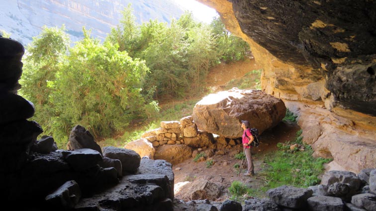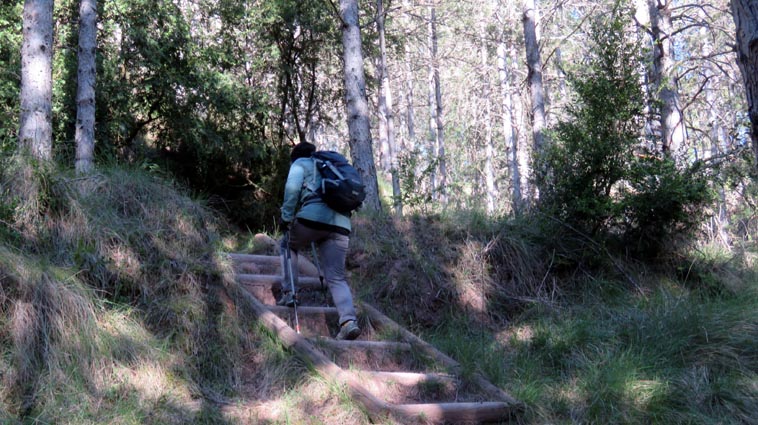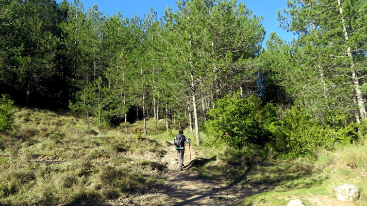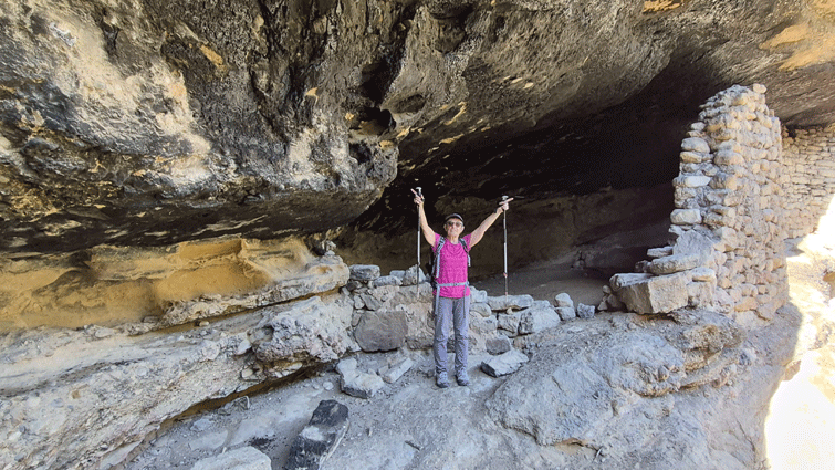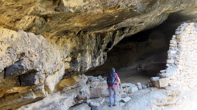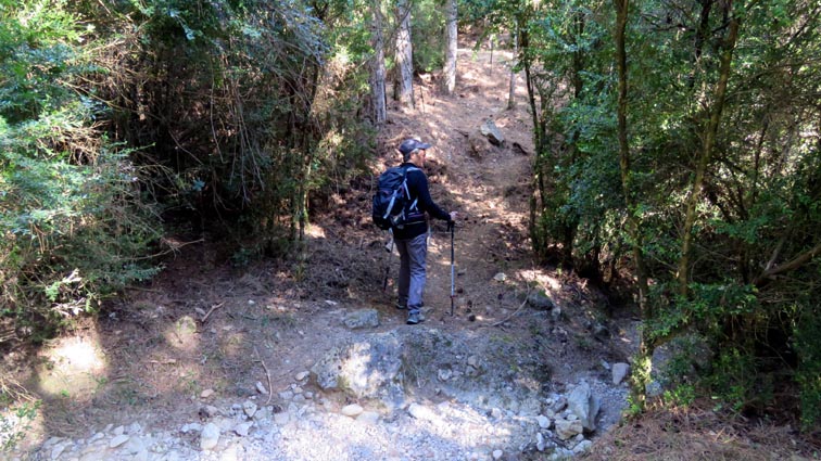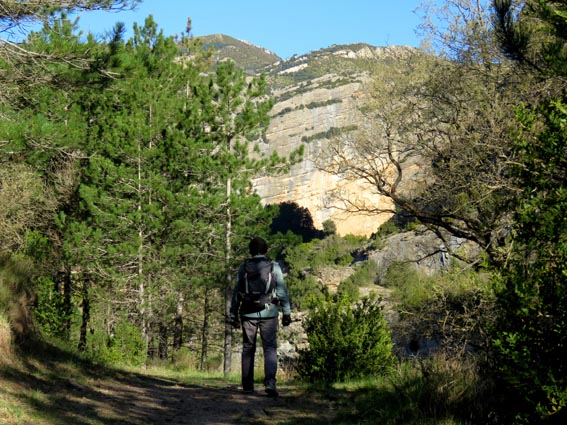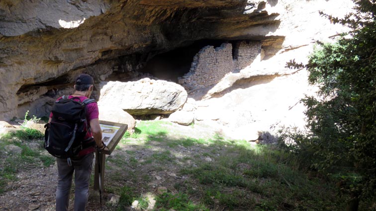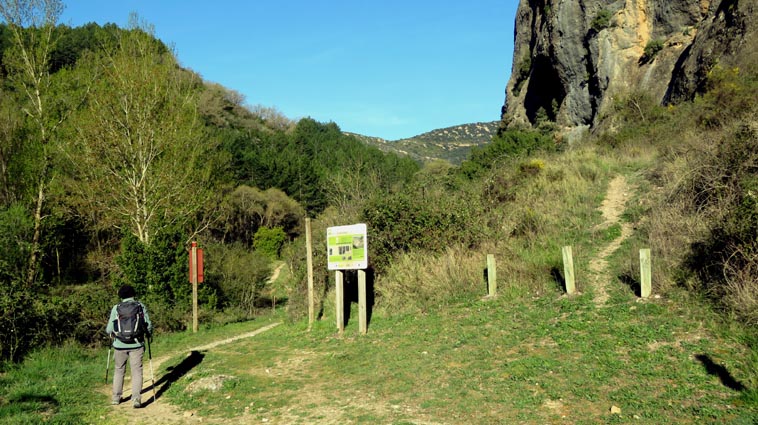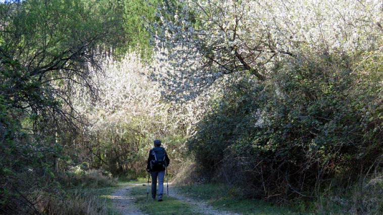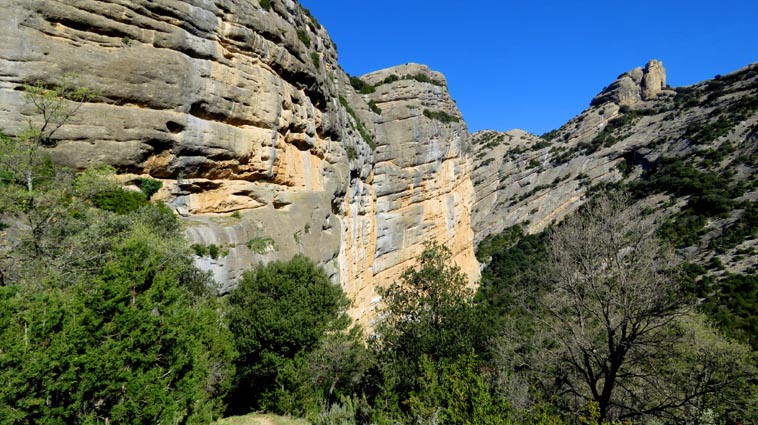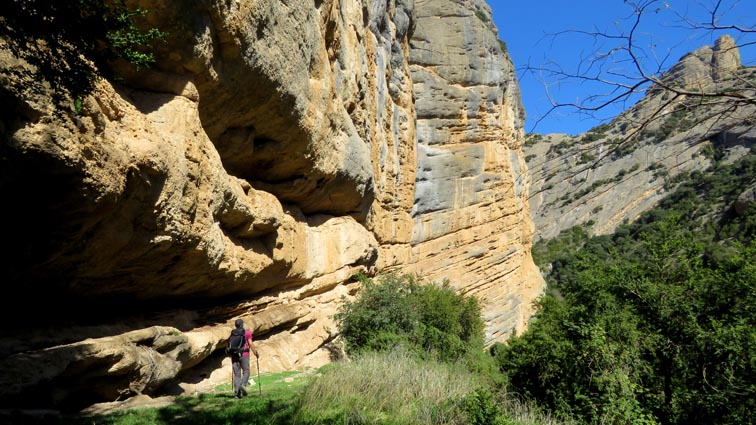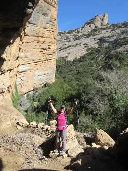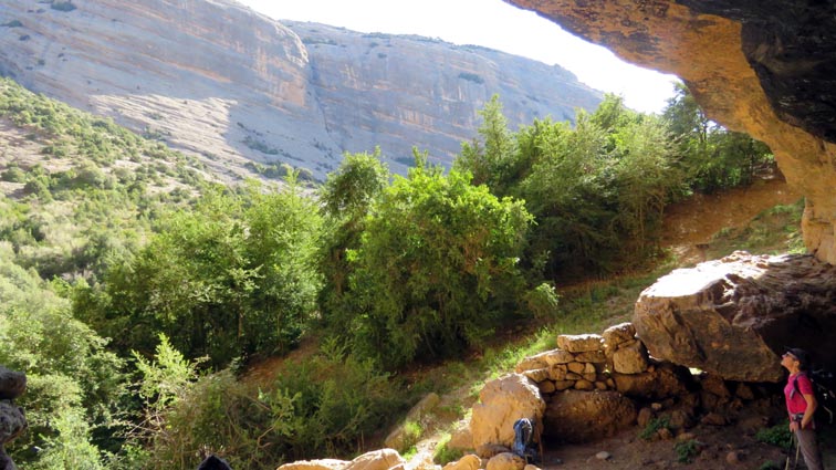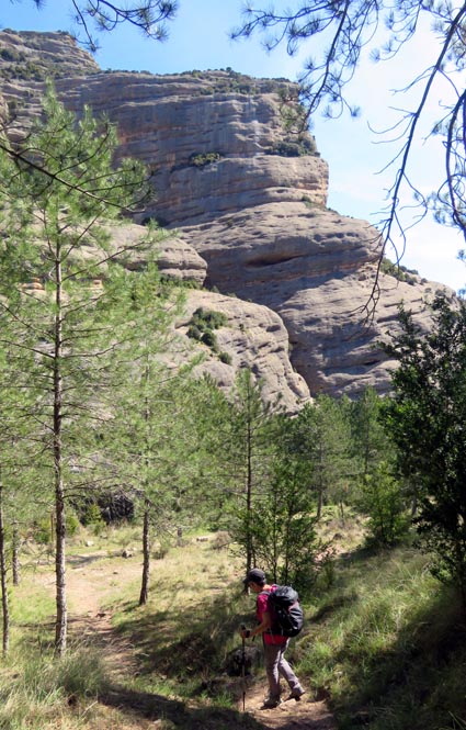 - 9H25 - 717m (ESCH01) Nous démarrons du "parking del Canal del Palomo", en empruntant un sentier en direction de Santa Eulalia la Mayor. Au départ du sentier, un panneau donne des explications sur l'ermitage San Chinés et son environnement. Il nous indique que cet ermitage d'origine hispano-wisigothique est situé au pied de Peña Foratata, sous une impressionnante paroi rocheuse. Ce fut un lieu de pèlerinage pour les fidèles jusqu'au XIXème siècle. Il y a des Pâquerettes vivaces, du Muscari en grappe, des Asphodèles, du Genêt scorpion, des Violettes des bois et du Romarin. Nous prenons le temps d'observer des chèvres qui escaladent les parois rocheuses. - 9H31 - 713m (ESCH02) Nous tournons à gauche en direction de Santa Eulalia la Mayor et nous traversons le barranco de Vadiello. Nous franchissons quelques marches d'escalier avant de poursuivre sur un chemin qui monte assez raide sous le couvert de la forêt. Nous observons des chenilles processionnaires qui se déplacent à la queue leu leu sur un rondin couché sur le sol. - 9H41 - 745m (ESCH03) Après une portion de chemin relativement horizontale, nous virons à gauche, toujours en direction du village de Santa Eulalia la Mayor annoncé à 6,200km. Nous trouvons maintenant des Hépatiques trilobées, des Primevères vraies et de l'Hellébore fétide. - 9H50 - 768m (ESCH04) Nous cheminons sur un sentier très agréable en forêt, et franchissons encore quelques marches d'escalier. - 9H53 - 775m (ESCH05) Nous tournons à gauche sur une piste, toujours en direction du village de Santa Eulalia la Mayor annoncé maintenant à 5,600km. - 9H58 - 780m (ESCH06) Après une zone humide, nous trouvons enfin un panneau annonçant la direction de San Chinés en face de nous. Nous remarquons que les Prunelliers sont en fleurs. - 10H01 - 785m (ESCH07) Un abreuvoir adossé à une réserve d'eau se trouve sur la gauche de notre chemin. Un panneau d'information nous renseigne sur la formation des roches conglomératiques qui caractérisent l'environnement qui nous entoure. - 10H04 - 797m (ESCH08) Nous passons devant une prise d'eau, et la piste se poursuit à l'horizontale. - 10H10 - 815m (ESCH09) Un panneau nous invite à emprunter le chemin qui part sur notre droite, en direction de l'ermitage San Chinés annoncé à 1,400km. Nous passons sous des Merisiers qui sont en pleine floraison. Le sentier se poursuit à l'ombre de la forêt, ce que nous apprécions beaucoup car il fait déjà chaud. Nous constatons que tout le secteur a été labouré par les sangliers, à l'exception du sentier qui étonnamment n'a absolument pas été dégradé... - 10H26 - 874m (ESCH10) Au niveau d'un cairn, nous laissons un sentier qui part sur la gauche, pour continuer sur celui qui descend en face de nous (direction Nord-ouest). Quelques mètres plus loin, nous remarquons que le panneau indicateur qui devait se trouver sur un piquet a disparu. C'est bien dommage car c'est un des rares points où la direction à prendre n'est pas forcément évidente (à moins d'avoir préparé comme nous l'itinéraire sur un GPS). Cependant, très vite, nous trouvons quelques cairns. - 10H34 - 844m (ESCH11) Nous franchissons un passage un petit peu escarpé, sur des rochers à découvert. Nous avons ainsi un beau point de vue sur les falaises qui se dressent en face de nous. Mais, rapidement, le sentier redevient confortable sous le couvert de la forêt. - 10H40 - 806m (ESCH12) Nous traversons le lit du "Barranco de Vadiello" qui est à sec. Juste après, le sentier remonte assez sévèrement. Nous trouvons quelques pieds de Crépide de Nîmes. - 10H46 - 840m (ESCH13) Nous nous retrouvons dans un décor minéral somptueux au sommet d'un raidillon. Un percnoptère d'Egypte et quelques vautours fauves passent au-dessus de nos têtes. C'est l'occasion de faire une courte pause pour les observer, avant de continuer sur le sentier qui descend sur la gauche, au pied d'une immense paroi rocheuse. - 11H00 - 807m (ESCH14) Le GPS a des difficultés à définir notre position, mais l'itinéraire en pied de paroi est évident. Nous arrivons ainsi à l'ermitage San Chinés, niché en pied de falaise sous un surplomb, et dont il ne reste qu'un seul mur. L'ermitage San Chinés et le ravin de Vadiello forment un ensemble d'un grand intérêt, grâce à la beauté spectaculaire du ravin et au charme patrimonial de l'ermitage, empreint d'un sentiment d'isolement et de recueillement. - 11H18 Nous nous remettons en route pour revenir par le même itinéraire. - 12H20 Nous voici de retour au point de départ. Nous prenons le temps de manger dans le camping-car avant de repartir en direction de Castilsabás. Mais nous nous arrêtons un peu avant le village pour aller voir la Piedra de los Moros. |
