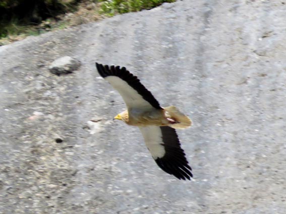 Après avoir passé une nuit parfaitement calme sur l'aire de stationnement des camping-cars de Boléa, nous sommes partis par Puiboléa et Banastás pour rejoindre la A-22 au niveau de Huesca, en direction de Barbastro. Nous sommes sortis à la sortie 99, pour prendre la A-1227/HU-330. Nous sommes passés à Loporzano et nous avons laissé Castilsabás sur notre droite. Un sanglier a traversé la route juste devant nous au niveau de Castilsabás. 7km après Castilsabás nous nous sommes garés sur le "Parking del Canal del Palomo" qui se trouve sur la gauche dans un virage en lacet de la route (500m environ après le refuge du Vadiello). Juste avant d'arriver, nous avons eu la chance d'observer un percnoptère d'Egypte qui planait à très basse altitude. |