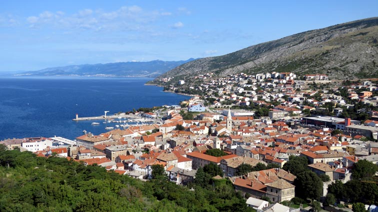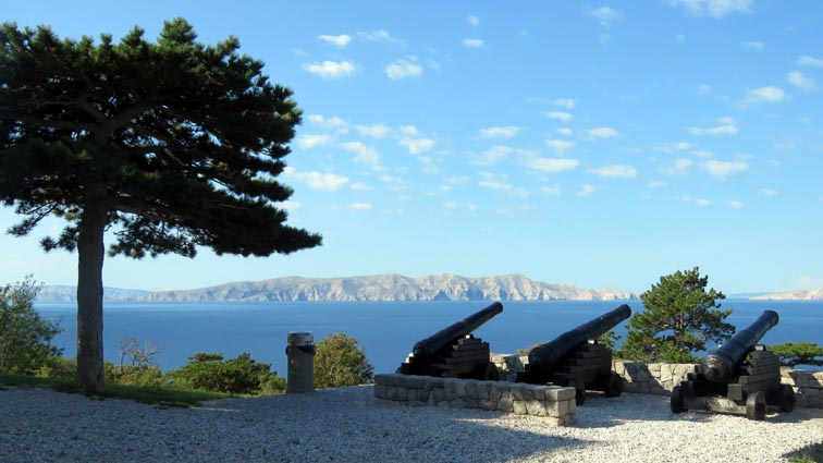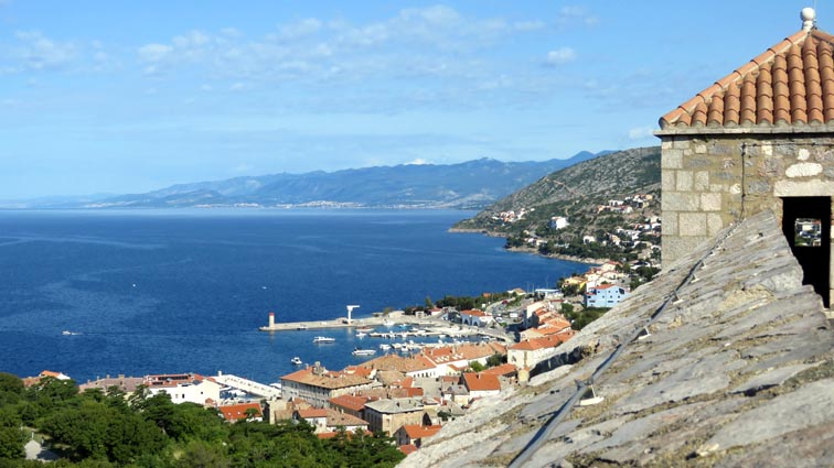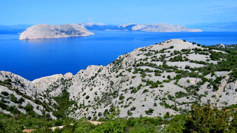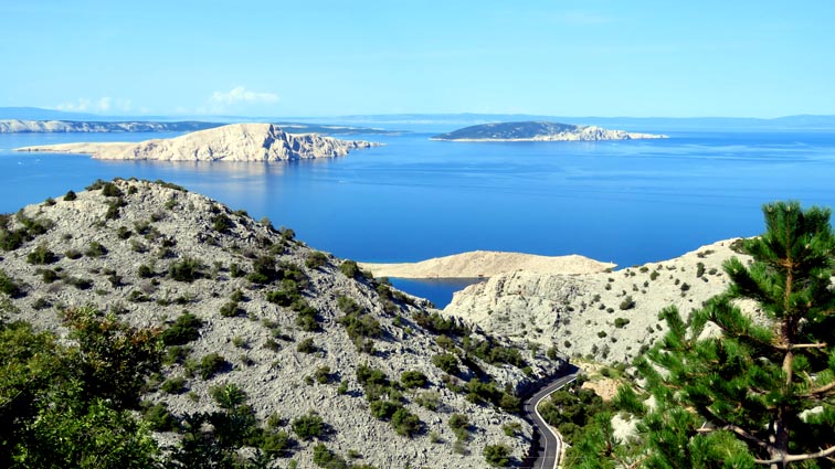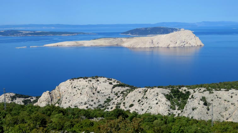 Nous descendons ensuite vers le Sud par une splendide route qui longe les canaux de Vinodol et de Velebitski : des bras de mer du golfe du Kvarner, séparant le continent de l'île de Krk, puis de l'île de Rab plus au Sud. Nous sommes surpris par l'aspect minéral que présente l'île de Krk sur notre droite.
