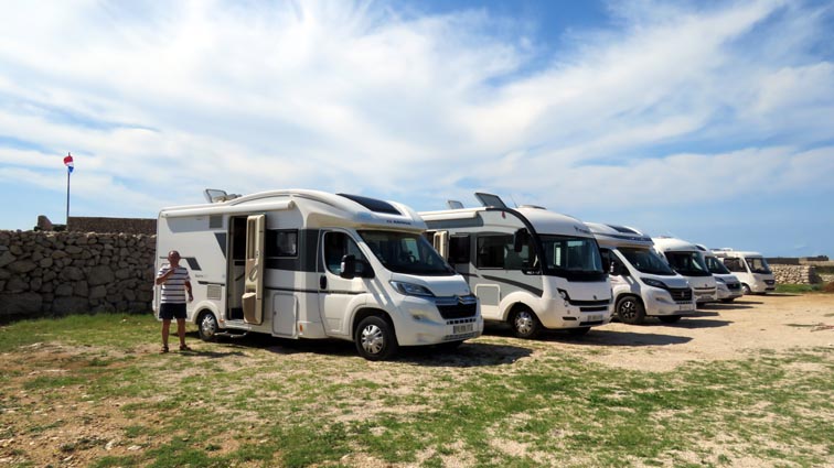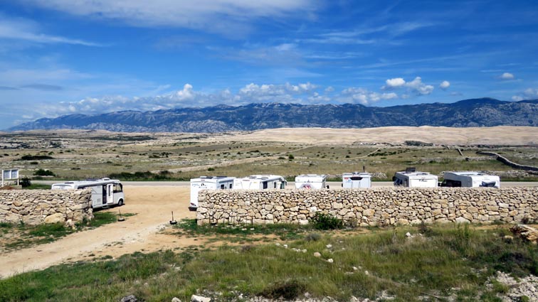 Nous prenons la direction de Pag, et nous nous arrêtons à 13H00 pour manger sur un des rares parkings possibles le long de la route (44°31'26.4'' Nord - 14°55'43.5'' Est). De nombreux équipages nous rejoignent sur ce parking, un peu perdu au milieu de nulle part...