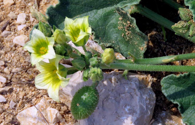 En faisant un petit tour à proximité de notre point de stationnement, je découvre la présence de plusieurs pieds de Concombre d'âne... Cette plante est remarquable par le mode de dispersion de ses graines. Le fruit est littéralement « sous pression » (6 bars, soit nettement plus qu'un pneu de voiture), de telle sorte que l'ouverture provoquée par le détachement du fragile pédoncule provoque une puissante explosion qui permet la projection des graines à plusieurs mètres. Certaines sources donnent les valeurs suivantes : projection jusqu'à 12 mètres, à une vitesse de 10 mètres par seconde ! Cette particularité lui vaut de posséder également d'autres patronymes très imagés tels que Cornichon sauteur, Concombre du diable ou Concombre explosif... Son nom latin "Ecballium" vient du grec "ekbalein": "je lance au dehors"...
