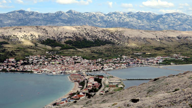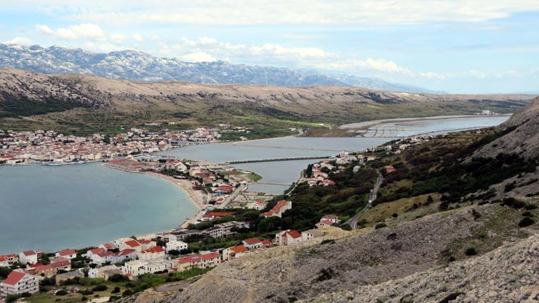 Avant d'arriver à Pag, nous nous arrêtons sur le parking d'un belvédère qui nous offre un beau point de vue sur la cité, et ses salines, qui depuis des siècles ont contribué à la prospérité de l'île. Pag produit annuellement 33 000 tonnes de sel, soit près des 2/3 de la production croate.