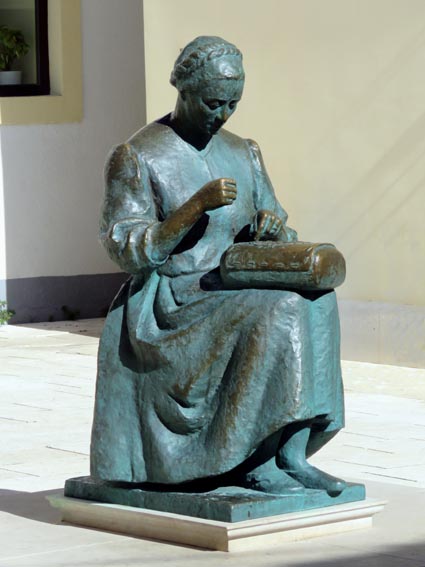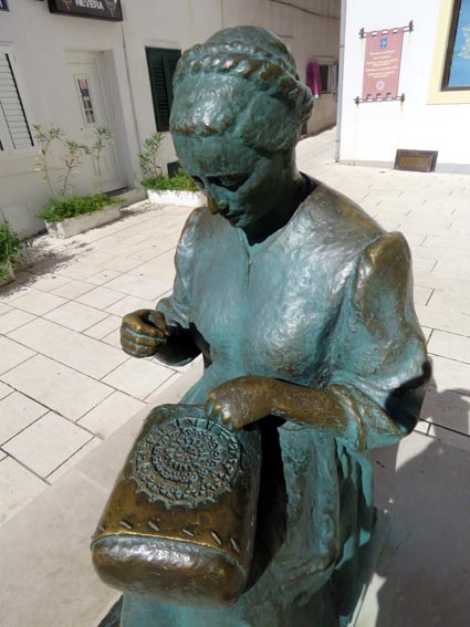 Nous arrivons à Pag vers 15H00, et nous partons à pied faire un tour en ville, avec l'espoir de trouver une pièce de dentelle artisanale. La pratique de la dentelle à l'aiguille est attestée depuis le milieu du XVème siècle à Pag. Le travail de ces dentellières était particulièrement apprécié à la cour d'Autriche, et par l'impératrice Marie Thérèse en particulier. Encore de nos jours, les femmes du village passent des heures à broder des motifs complexes au moyen de fils très fins, et cette pratique est inscrite au patrimoine de l'humanité par l'Unesco. La dentelle est réalisée sans aucun modèle. Les femmes apprennent en prenant exemple sur leurs mères et grand-mères, et ajoutent progressivement des petites touches personnelles. Nous passons justement devant une statue en bronze qui leur est dédiée...