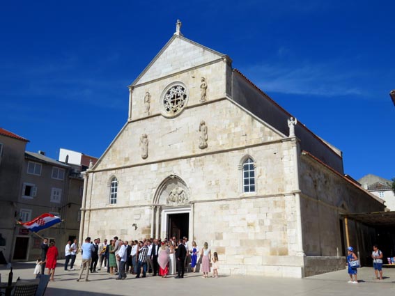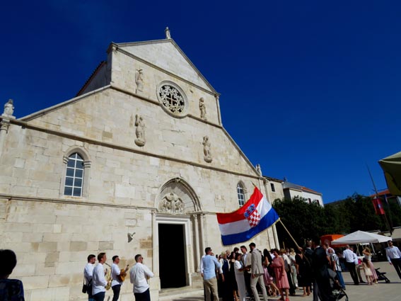 Nous allons jusqu'à la grand-place où se trouve l'église de l’Assomption-de-la-Vierge, et nous avons la chance d'assister à la sortie d'un mariage. Nous remarquons que les invités sont habillés de façon particulièrement élégante. Un groupe de musiciens accompagne l'évènement, et un monsieur fait consciencieusement flotter le drapeau Croate sur le parvis de l'église.