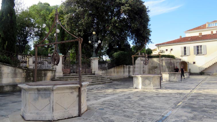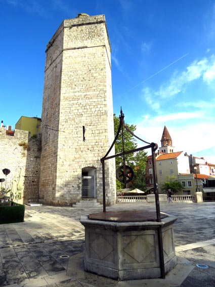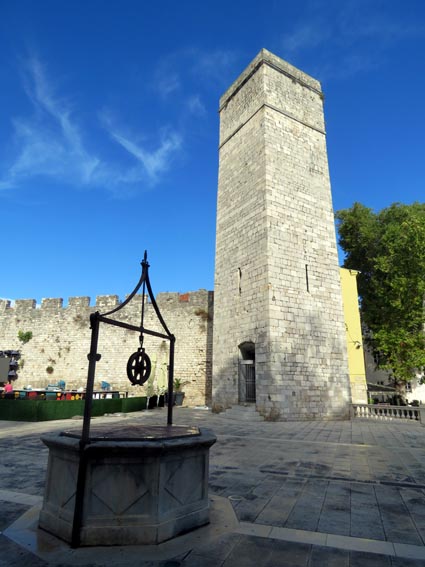 Nous rejoignons "Marina", une excellente guide francophone, à 9H30 sur la place des 5 puits. Cette place se trouve au-dessus d'une immense citerne aménagée au XVIème siècle dans un ancien fossé de la muraille médiévale. Ces puits permettaient à la ville, lors des sièges menés par l’armée ottomane notamment, de subvenir à ses besoins en eau. Nous sommes également au pied de la tour du Capitaine, un bel ouvrage défensif du XIIIème siècle.