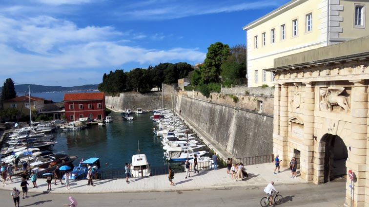 Marina commence pour nous résumer l'histoire mouvementée de la Croatie, avant de nous emmener voir la porte de la Terre-Ferme, juste à côté du charmant petit port de Foša. Nous pouvons voir en haut de la porte, le Lion de Venise, placé au-dessus de la clé de voute où figure Saint-Chrysogone sur son cheval, emblème de Zadar.