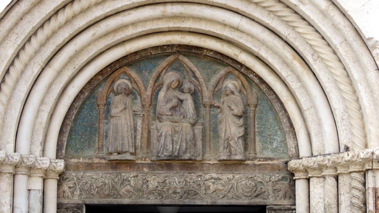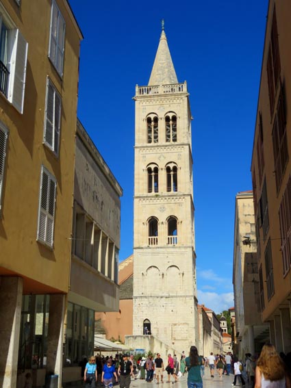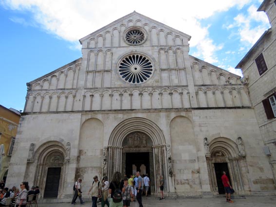 Nous passons au pied de la cathédrale Sainte-Anastasie qui fut édifiée au IVème siècle en lisière de l'antique forum. Sa façade de style roman est composée de trois portails surmontés de quatre étages d'arcatures aveugles, soutenues par de gracieuses colonnettes à la manière des églises de Toscane. La grande rosace date du XIIème siècle, mais celle de dessus est plus tardive (XIVème), et de style gothique. Sur le tympan du portail central, on peut observer une Vierge à l'enfant, entourée des Saint Chrysogone et de Sainte Anastasie.