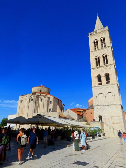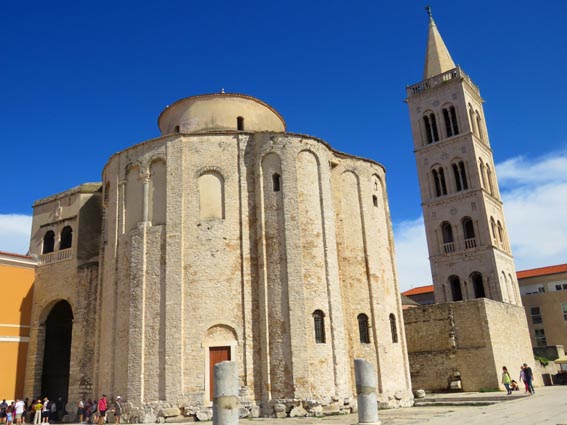 Mais, l'église Saint-Donat, emblème de Zadar, qui se trouve juste à côté, attire particulièrement notre attention. De style préroman, elle date du début du IXème siècle. C'est l’un des édifices religieux les plus intéressants de Croatie, en particulier en raison de son plan circulaire qui révèle l'influence des premières églises carolingiennes et des sanctuaires byzantins. Marina nous fait remarquer qu'on peut nettement voir à sa base, des fragments de colonnes, frontons et corniches romaines, récupérés sur le forum pour réaliser les fondations.