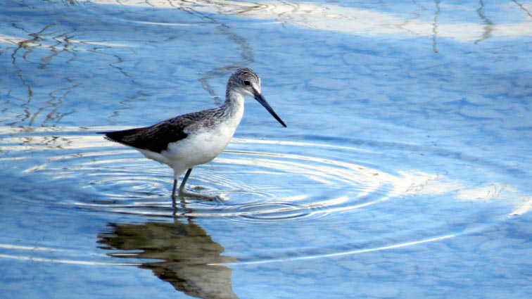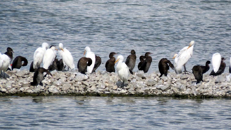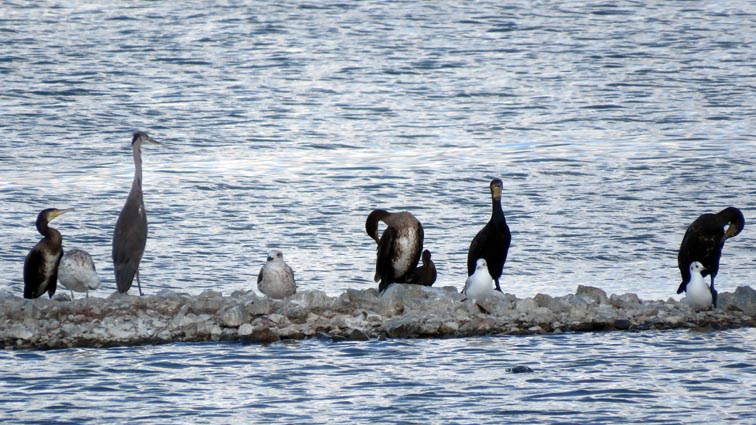 Nous observons des goélands, des foulques macroule, des hérons pourpres, des aigrettes garzette, des vanneaux huppés, des cormorans pygmée, des canards colvert et des chevaliers aboyeurs.