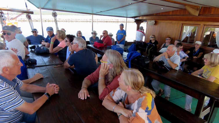 Nous naviguons entre les îlots désertiques, parfois plantés d'oliviers ou de vignes, ou même des vergers de figuiers, généralement délimités par des murs de pierres sèches. Une petite collation nous est servie à bord, avec du jambon et du fromage, accompagnés d'olives et de cornichons.