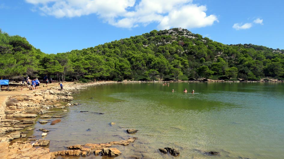 Nous allons ensuite voir le lac salé de "Mir" qui signifie "paix" en croate. Ce lac de 900m de long pour 300m de large a une profondeur de 6m. Il communique avec la mer par des canaux souterrains, et à l'extrémité Sud-est du lac, lorsqu'il y a des tempêtes, la mer peut déborder jusque dans le lac. Les variations de température du lac sont très importantes : jusqu'à 33° en été, et 5° en hiver. De ce fait, le lac est plus chaud que la mer en été et plus froid en hiver en raison de sa faible profondeur. Sa salinité est supérieure à celle de la mer.
