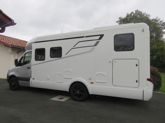 L/l/h : 7.39m / 2,29m (hors tout)/ 2,98m - Empattement 3.924m Poids à vide 2,975T Châssis SLC, le « Super Light Chassis », développé par Mercedes en association avec Al-ko. Le double plancher accueille l’ensemble des zones techniques : chauffage, réservoirs d’eau, batterie, etc. P.T.A.C. : 3,500T 4 places route - 4 places nuit |