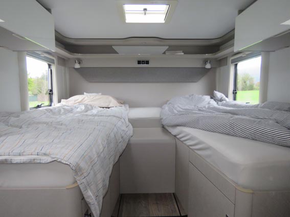 Toit en polyester renforcé de fibre de verre servant de protection supplémentaire contre les intempéries et la grêle, empêchant les dommages sur le toit. Soute- garage (chauffée) traversante à 2 portes : droite 108*79, gauche 75*85 Fixation des vélos à l'intérieur de la soute-garage, et 2 prises 220 volts reliées au convertisseur pour charger les batteries des vélos à assistance électrique. Porte cellule confort à fermeture 2 points avec baie, store occultant et poubelle intégrés Store extérieur 4m Panneau solaire 160W Antarion Batterie de service au lithium-ion 200A ANTARES Régulateur de tension Infosec R2PRO / 2000VA Convertisseur "pur-sinus" 2000W TV LED 22" connectée Réfrigérateur Jumbo 160 litres avec congélateur, à sélection automatique d'énergie Réservoirs isolés et chauffés (eau propre 110l - eaux usées 100l) Plaque de cuisson 3 feux, alimentée par une bouteille de camping-gaz (2 bouteilles modèle 207 placées dans le compartiment gaz) Salle de bain avec douche séparée à portes rigides battantes. Le cabinet de toilette est séparable de la partie avant avec la porte des toilettes. WC à cassette Lit de pavillon électrique au-dessus de la dînette Lits jumeaux à l'arrière (202 x 83 cm et 202 x 83 cm), avec draps-housses sur mesure, adaptés aux contours du matelas