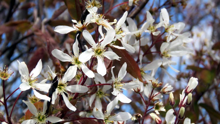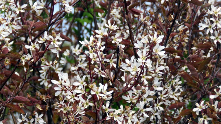 Famille des Rosacées. Arbuste très ramifié pouvant atteindre 9m de hauteur. Feuilles larges, cordiformes à elliptiques, aux bords finement dentés, 4-8cm de long, naissant bronze avant de verdir et de se colorer de rouge orangé à l'automne, . Fleurs blanches de 35 à 40 mm, étoilées, aux pétales larges, en grappes pendantes, de 6 à 12 cm de long, étamines de couleur jaune. Fruit pourpre foncé, 1cm de diamètre, comestibles, juteux et sucrés. Avril – mai. |
