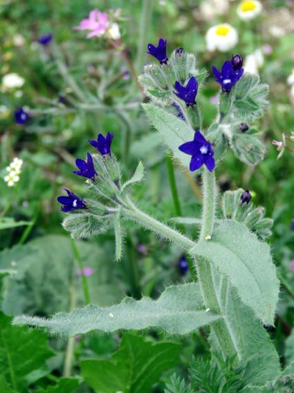 Famille des Borraginacées Plante vivace, parfois bisannuelle, petite à grande, aux soies rugueuses, tiges érigées, non ramifiées. Longues feuilles lancéolées1-2cm de large, les inférieures pétiolées. Fleurs rouge bleuté ou violettes, rarement blanches ou jaunâtres, 7-15mm, en cymes allongées, renflées, calice fendu jusqu'au milieu. Nucules coniques, sessiles. Talus, rochers, terrains vagues, souvent sur sol calcaire, jusqu'à 1800m. Avril - septembre |