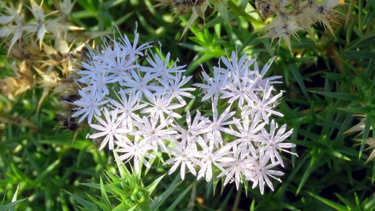 Famille des Caryophyllacées. Plante vivace cespiteuse, 10-30cm, très ramifiée, aux tiges tétragones. Feuilles opposées, sessiles, lancéolées, à l'apex aigu à épineux. Fleurs 8-10mm, groupées en corymbes sub-terminaux, présentant une symétrie axiale parfaite, bisexuées, avec 5 sépales, 5 pétales libres d'un blanc rosé, 5 étamines et un ovaire supère à une seule loge. Éboulis et lieux rocailleux dans la Péninsule des Balkans et en Italie. Juin - septembre. |