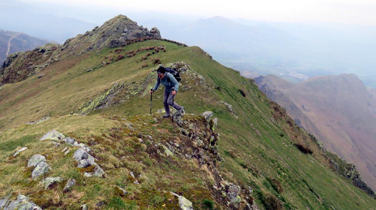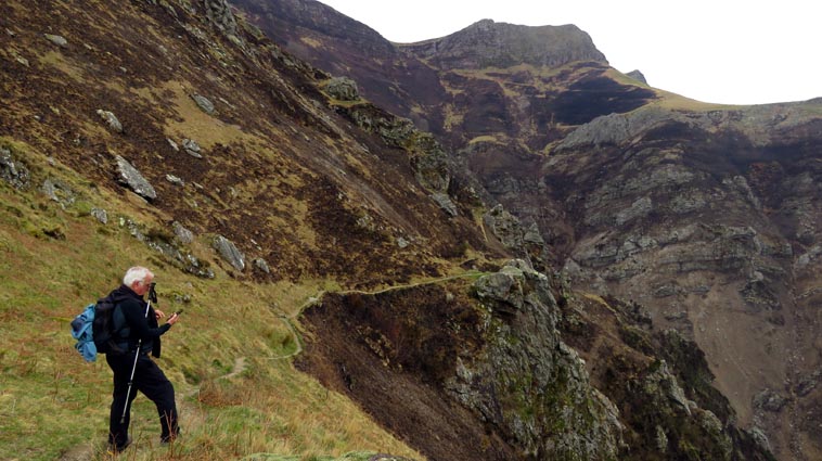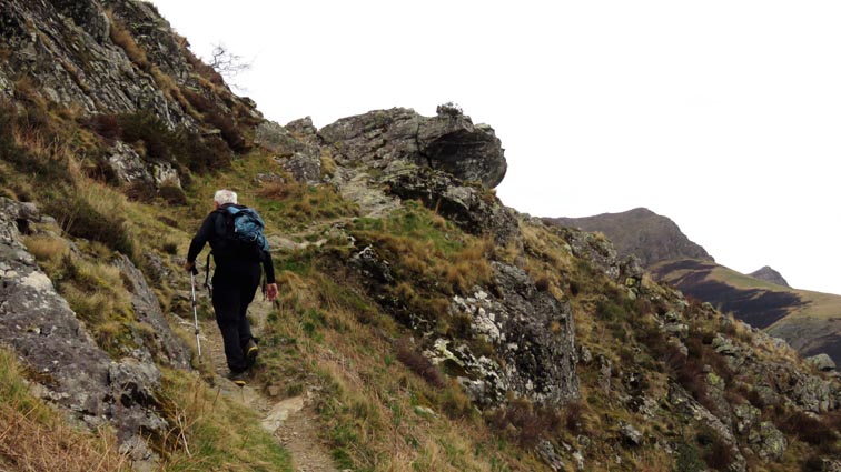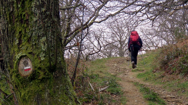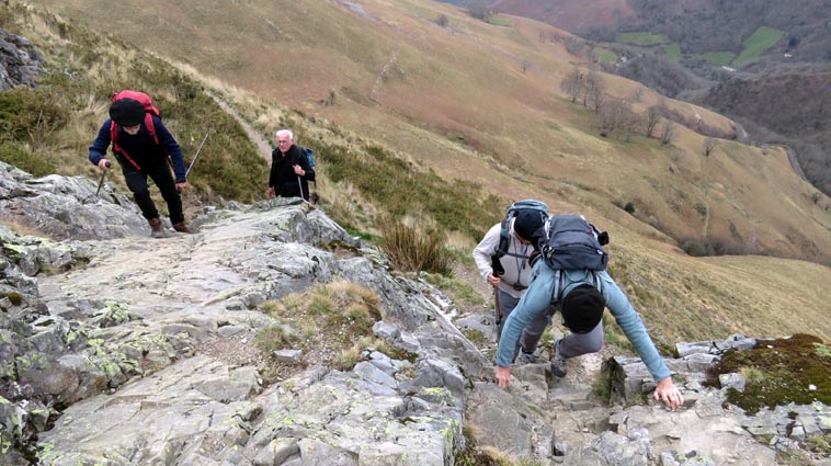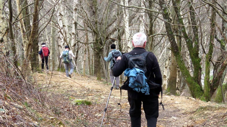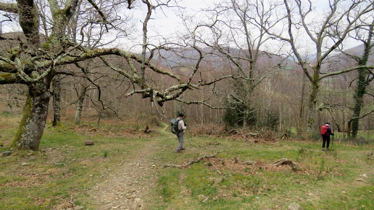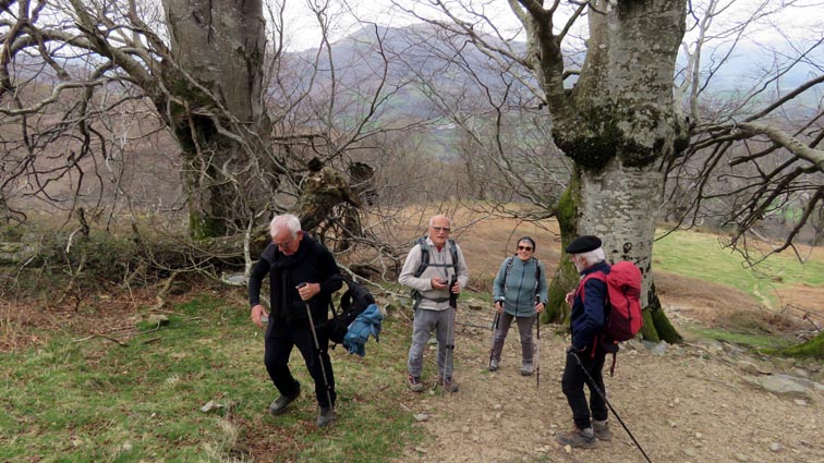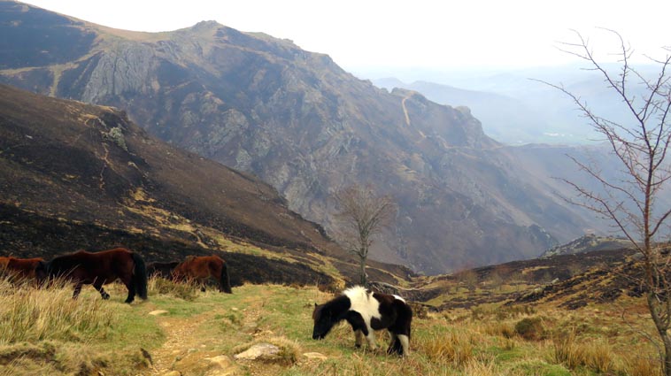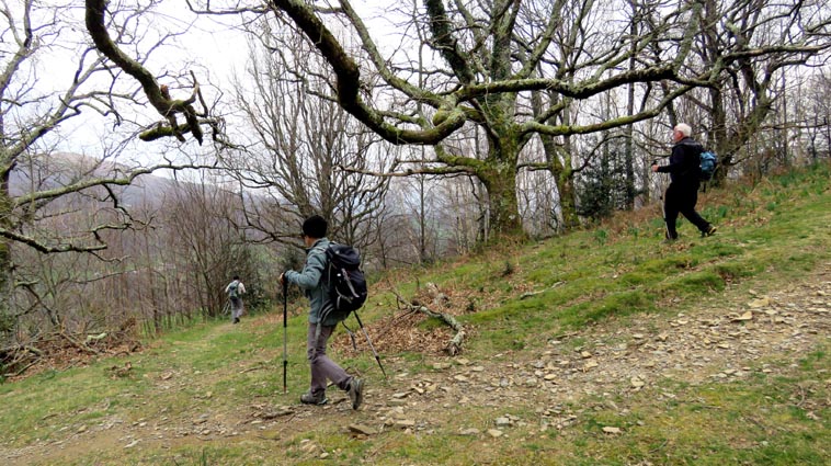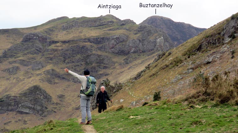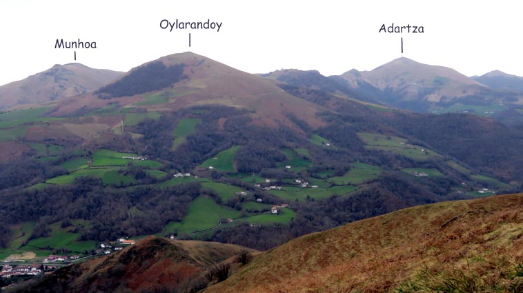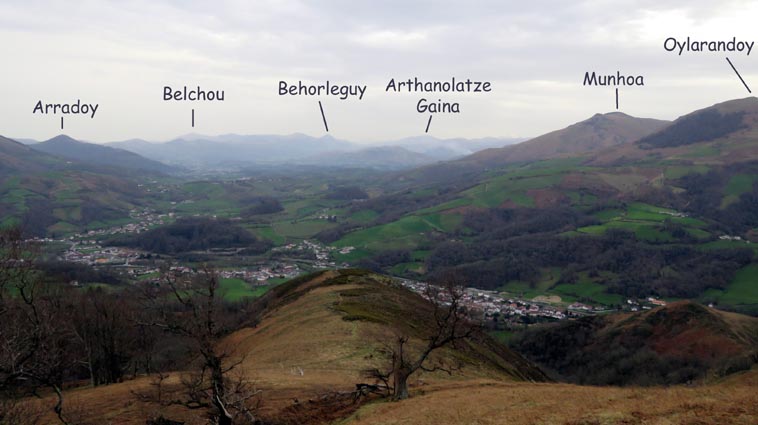 - 9H45 - 292m (AINT01) Nous démarrons en continuant sur la route qui monte vers le Nord. Il y a de l'Euphorbe des bois, des Violettes, et les Asphodèles sont en bouton. - 9H48 - 300m (AINT02) Nous prenons le chemin qui part sur la gauche en direction de la crête de Paulegi, en empruntant le tracé du GR10. - 10H02 - 309m (AINT03) Nous observons la présence d'une importante cavité sur la droite du chemin (il y en avait une plus petite un peu avant). Nous sommes un peu étonnés de démarrer sur un chemin qui descend, mais nous sommes pourtant sur le bon itinéraire. - 10H05 - 299m (AINT04) Alors que nous passons le point bas du chemin, nous trouvons de la Dorine à feuilles opposées, du Géranium Herbe à Robert et de la Pulmonaire officinale. - 10H07 - 311m (AINT05) Le chemin vire à gauche au moment où il traverse le ruisseau "Lixketako erreka". - 10H18 - 380m (AINT06) Une croix rouge et blanche sur le chemin d'en face nous indique qu'il faut suivre celui qui monte sur la droite. Nous avons le plaisir de trouver les premières Dents de chien de l'année. - 10H29 - 430m (AINT07) Nous voici à la base de la crête de Paulegi que nous allons maintenant remonter sur un bon sentier direction Nord-ouest. - 10H43 - 519m (AINT08) Après avoir dépassé un bouquet d'arbres, le sentier s'infléchit vers la gauche. Derrière nous, le panorama est déja intéressant : Hurbeleta, Larla, Baïgura, Jara, Arradoy, Belchou, Béhorléguy, Arthanolatze Gaina, Munhoa, Oylarandoy et Adartza. - 11H02 - 653m (AINT09) La pente est un peu sévère, mais nous avons quand-même le loisir d'observer un beau bouquet de Jonquilles. Nous voyons très bien en face de nous, le sommet d'Aintziaga, avec Buztanzelhay sur la droite. Beaucoup plus proche de nous, un vautour fauve est posé sur un rocher. - 11H15 - 712m (AINT10) Nous rejoignons l'extrémité d'une route au col d'Apaloy (Aphaloiko lepoa). Nous nous accordons une courte pause, avant de continuer sur le sentier qui se poursuit un peu en contre-bas sur la gauche direction Nord-ouest. Dans l'axe du sentier, le sommet d'Aintziaga nous paraît encore bien loin, avec Buztanzelhay et Astate sur la droite. - 11H23 - 707m (AINT11) Le sentier se poursuit sur la gauche sans rejoindre la ligne de crête, et nous passons une zone un peu plus rocheuse. - 11H31 - 752m (AINT12) Nous passons sur le versant Nord-est. Le sentier est très nettement tracé, mais à partir d'ici, il va partir en traversée dans des zones extrèmement pentues. L'ambiance est un peu particulière, car tout le secteur a été brulé récemment par les feux d'écobuage. L'odeur est forte et nos vêtements vont devoir passer à la machine... - 11H34 - 737m (AINT13) Nous passons au point bas du sentier, qui va maintenant remonter dans un secteur rocheux assez spectaculaire. - 11H37 - 751m (AINT14) Le sentier ne cesse de monter et de descendre dans les rochers. - 11H53 - 764m (AINT15) Le sentier vire à droite avant de repartir sur la gauche direction Sud. Nous trouvons les premières Narcisses bulbocodium de la saison. - 12H04 - 837m (AINT16) Nous obliquons vers la gauche (Sud-est) avant d'atteindre le col de Buztanzelhay, pour monter directement vers le sommet d'Aintziaga. - 12H15 - 905m (AINT17) Nous voici au sommet d'Aintziaga. Nous pouvons regretter que la visibilité ne soit pas très bonne, comme je le disais ci-dessus à cause de la brume, mais surtout de la pollution de l'air avec les fumées d'écobuage et le sable en suspension en provenance du Sahara. Le Buztanzelhay nous domine d'une centaine de mètres au Nord-ouest, avec Astate sur la droite, et le pic d'Iparla que nous devinons en arrière-plan. Larla se détache en avant-plan du Baïgura, puis nous voyons le Jara et Arradoy. Nous reconnaissons ensuite le Belchou et le Béhorléguy, mais le Pic d'Anie se perd dans la brume, et nous apercevons à peine le Pic d'Orhy. Munhoa et Oylarandoy sont bien plus proches de nous, puis viennent ensuite Munhogain, Adarza, Argarai et Laurigna. Urrizpilota et Elhorriko Kaskoa se trouvent sur la ligne de crête en face de nous au Sud, avec Autza un plus plus à l'Ouest. Seul le Mendaur se distingue à l'Ouest, et nous finissons le tour d'horizon avec Gorramendi et Otanarte. - 12H20 Nous entamons la descente sans tarder par le même chemin. - 12H25 - 836m (AINT18) Nous retrouvons le GR10 en contrebas du col de Buztanzelhay. - 12H54 - 750m (AINT19) Nous nous arrêtons pour manger avant de basculer sur le versant Sud-ouest. - 13H27 Nous nous remettons en marche. - 13H37 - 712m (AINT10) Nous repassons au col d'Apaloy, où nous empruntons la route qui descend sur notre gauche. - 13H41 - 675m (AINT20) Dans le premier virage gauche de la route, nous prenons le sentier balisé en rouge et blanc qui descend sur la droite. - 13H45 - 640m (AINT21) Nous retrouvons la route que nous empruntons en descendant sur notre droite. - 13H52 - 562m (AINT22) Nous passons devant un abreuvoir qui se trouve sur le côté droit de la route, et continuons en face en suivant le balisage du GR (sans prendre le chemin qui descend sur la gauche). - 14H00 - 512m (AINT23) Nous quittons la route pour suivre un chemin balisé en rouge et blanc sur la droite, qui va nous permettre de descendre sur la ligne de crête d'Arkazabal en obliquant direction Sud-est. Nous avons ainsi le Munhoa et Oylarandoy en face de nous. - 14H11 - 430m (AINT24) Nous laissons un sentier qui descend sur la droite en tournant à 90° vers la gauche sur le chemin principal, toujours balisé en rouge et blanc. - 14H17 - 379m (AINT25) Nous tournons à droite en face d'un gros chêne, en suivant le balisage du GR. Ce chemin est nommé sur la carte : "Ortzazabaleko bidea". Nous traversons alors une très belle forêt de bouleaux. - 14H24 - 310m (AINT26) Nous tournons à droite en arrivant à la route. - 14H27 Nous voici de retour au point de départ. La route que nous avons partiellement empruntée depuis le col d'Apaloy nous a donné des idées... Pourquoi ne pas