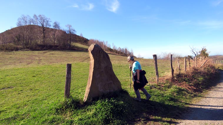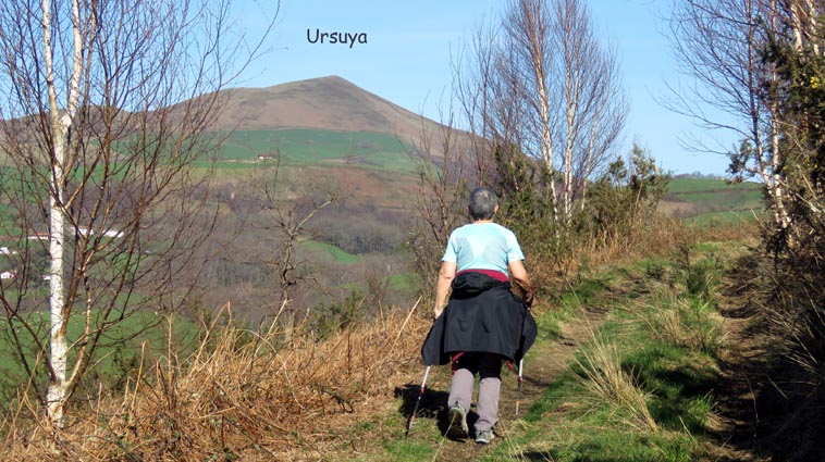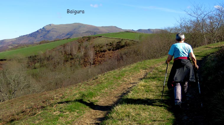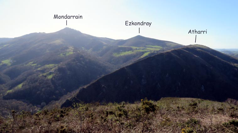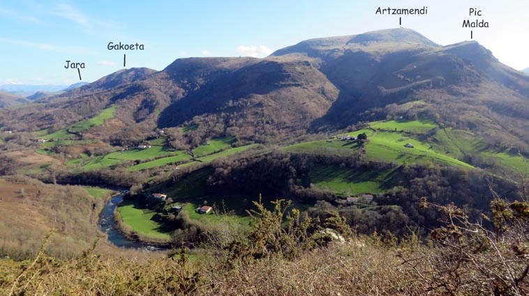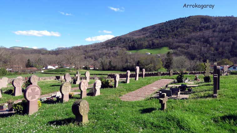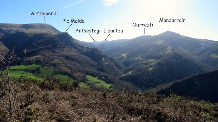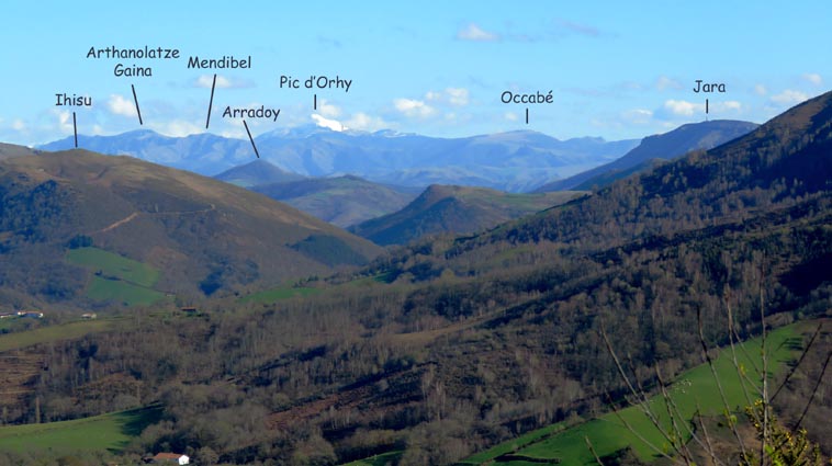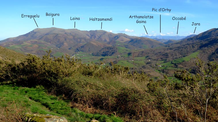 - 15H01 - 60m (ARRB01) Nous démarrons en pénétrant dans le cimetière par le petit portail qui se trouve juste en face du parking de l'église. Nous traversons le cimetière en laissant l'église sur notre droite. Nous passons ainsi dans la partie plus récente du cimetière où il y a de nombreuses stèles discoïdales. Nous voyons Arrokagaray sur notre droite. - 15H03 - 55m (ARRB02) Nous sortons du cimetière par le portail Ouest et continuons sur la petite route "Todoeneko bidea". Nous commençons déjà notre relevé botanique : Géranium à feuilles découpées, Géranium herbe à Robert, Primevère à grandes fleurs, Potentille faux-fraisier, Pâquerette vivace, Ficaire, Euphorbe des bois et Stellaire hollostée. - 15H06 - 43m (ARRB03) Au croisement de la D349, nous continuons en face sur Uhaldeko bidea. Il y a du Laiteron maraîcher, des Campanules des murailles, des Arums d'Italie, des Violettes de Rivin, de la Pulmonaire officinale et des Pâquerettes des murailles. - 15H13 - 46m (ARRB04) En arrivant au stop de la D249, nous tournons à droite, devant l'ancienne maison de retraite de la Nive. Nous remarquons, sur le côté gauche de la route, une croix implantée sur un mur de clôture, célébrant la mémoire de Sauveur Nogues, décédé le 19 septembre 1943. Nous trouvons maintenant du Muscari en grappe, des Pissenlits, des Jacinthes d'Espagne, du Géranium à feuilles molles, des Pervenches et de la Chélidoine. - 15H21 - 38m (ARRB05) Nous traversons la Nive sur un pont dont la structure est constituée de deux grandes arches et d'un tablier en béton armé. Conçu par un ingénieur russe (Basile Potapov) en 1928, ce pont a une particularité... Quatre niches placées en des points névralgiques ont été aménagées pour pouvoir placer des charges explosives destinées à la destruction de l'ouvrage en cas de guerre... Ce pont a remplacé un pont suspendu, avec un tablier en planches mis en service en 1844, mais qui avait la particularité d'être à péage... Même les piétons devaient s'acquitter d'un droit de passage, en particulier les paroissiens du quartier Olhasur, lorsqu'ils se rendaient à la messe. Par conséquent, la messe et les vêpres furent carrément désertées, au point que l'évêché sollicita une franchise pour les fidèles, mais cette demande fut rejetée... Ce pont fut finalement emporté par la grande crue du 2 juin 1913... Après le pont, nous traversons la voie ferrée, et continuons en face, sur l'ancienne route de Saint-Jean-Pied-de-Port. Nous trouvons maintenant de la Cardamine des prés, du Lamier maculé, des Renoncules rampantes, de la Dorine à feuilles opposées et de la Consoude tubéreuse. - 15H26 - 50m (ARRB06) Avant de rejoindre la D918, nous prenons le chemin de Domingoenborda qui monte sur la droite. Nous repérons la présence de la Cardamine des bois, de l'Oxalis des bois, des Scilles printanières et du Compagnon rouge. - 15H36 - 108m (ARRB07) Nous laissons un chemin qui monte sur la droite vers Domingoenborda, pour prendre celui de gauche. Voici un papillon jaune pâle qui virevolte de fleur en fleur : le citron. - 15H41 - 138m (ARRB08) Nous tournons à droite devant une maison isolée que nous laissons sur notre gauche. - 15H43 - 147m (ARRB09) Lorsque le chemin vire à gauche à la sortie de la forêt, nous trouvons une station d'Anémones sylvie. - 15H48 - 184m (ARRB10) Nous avons passé la portion la plus raide de l'itinéraire. Le chemin oblique vers la gauche, plus ou moins horizontal, et nous avons l'Ursuya pratiquement en face de nous (légèrement sur la gauche). - 15H59 - 226m (ARRB11) Un chemin nous rejoint par la gauche, alors que le massif du Baïgura se dégage parfaitement en face de nous. - 16H02 - 232m (ARRB12) Un chemin autre nous rejoint par la droite, nous l'empruntons en continuant direction Sud-est. - 16H03 - 242m (ARRB133) Lorsque nous rejoignons une route (Urrizmeheko bidea) à l'extrémité du chemin de Xanfarinea, nous tournons à droite en nous faufilant entre une grande stèle en pierre et un piquet de clôture. Nous empruntons ainsi un petit sentier bien tracé, qui monte dans la prairie vers l'Ouest. Comme nous nous y attendions, nous trouvons des Dents de chien. - 16H08 - 270m (ARRB14) Nous rejoignons une piste que nous empruntons en montant sur notre droite. Un panneau indique que dans le cadre d'études scientifiques, des captures de vautours sont réalisées sur Arrokagaray. Ainsi, pour ne pas perturber ces opérations, il est demandé aux randonneurs de ne pas fréquenter le site entre le 8 mai et le 31 juillet, ainsi qu'entre le 1er septembre et le 30 novembre. Nous sommes donc dans la bonne période pour poursuivre notre randonnée. Cependant, les installations correspondant à ces captures, que nous avions vues lors de l'un de nos précédents passages, ne sont plus en place... Ce panneau semble donc obsolète... - 16H25 - 354m (ARRB15) Nous passons au point culminant du chemin, tout en constatant que les sangliers ont labouré le sol... Nous avons une belle vue plongeante sur Itxassou, Cambo et tout le littoral basque. Nous remarquons un pied d'Asphodèle en fleur, c'est le premier de la saison. - 16H32 - 338m (ARRB16) Nous voici à l'extrémité Ouest de la ligne de crête d'Arrokagaray, où nous grimpons sur une petite éminence rocheuse qui nous offre un beau point de vue sur la vallée du Laxia. L'Artzamendi nous domine au Sud, avec le Pic Malda un peu plus bas sur la droite. En fond de vallée nous distinguons Antsestegi, Lizartzu et Bizkailuze, avec Ourrezti et le Mondarrain plus à droite. Vers l'Ouest, nous pouvons voir Ezcondray et Atharri, ainsi que l'Ursuya au Nord-est. Vers le Sud-est se présente le massif du Baïgura : Erréguélu, Baïgura, Laina et Haltzamendi, avec Ihisu un petit peu plus à droite. Mais nous voyons aussi plus éloignés : Arthanolatze Gaina, le Pic d'Orhy et l'Occabé, avec le Jara qui pointe sur la droite, en-dessous de Gakoeta. - 16H35 - 336m (ARRB17) No