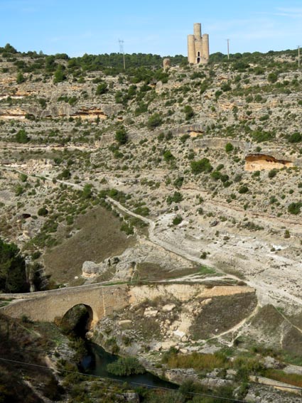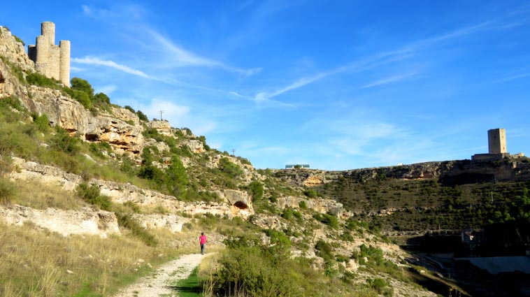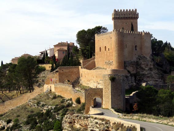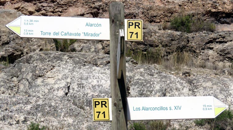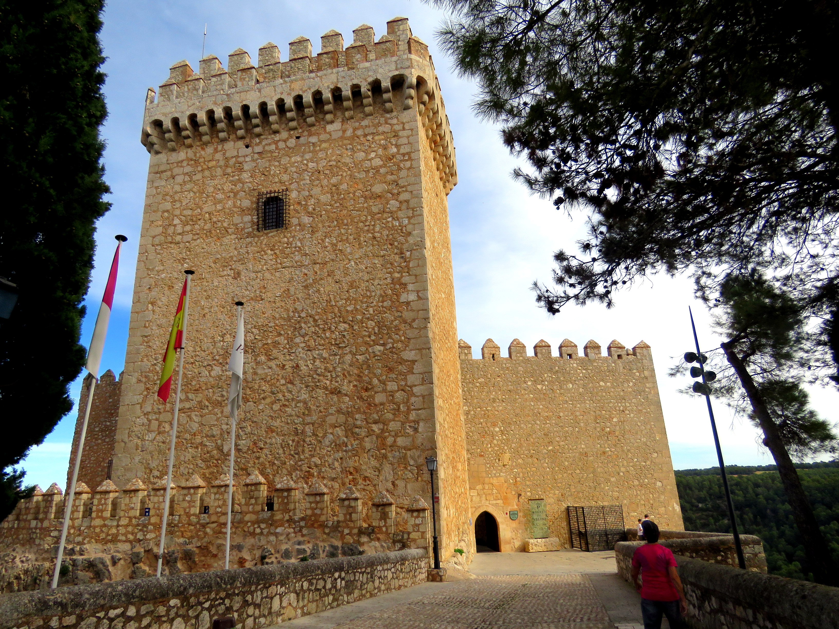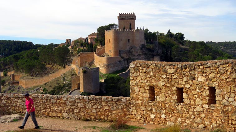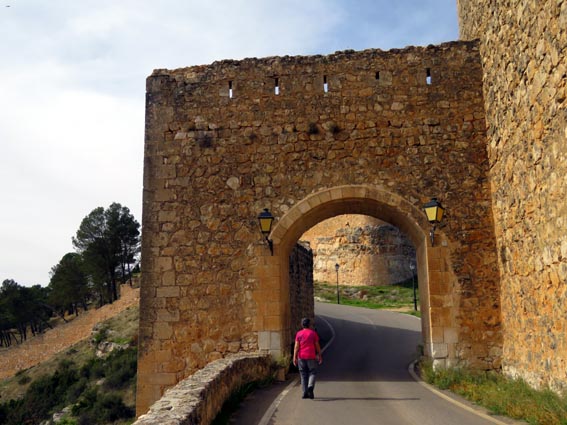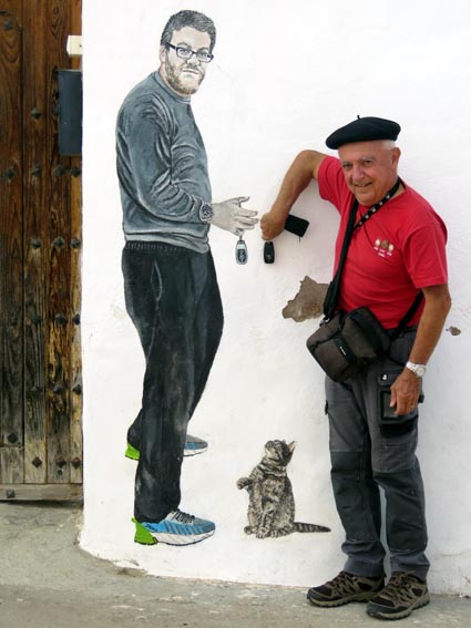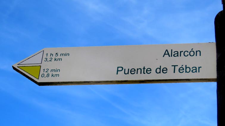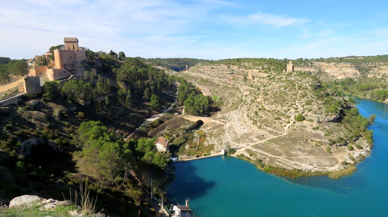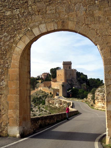 Après avoir fait une jolie balade sur la Route des Visages de Buendía, nous repartons en camping-car vers le Sud. Nous passons à Huete, Carrascosa del Campo, Montalbo et Honrubia, pour rejoindre Alarcón, une commune de la province de Cuenca, dans la communauté autonome de Castilla la Mancha. La cité, implantée dans un méandre du Río Júcar, a conservé la presque totalité de ses remparts. Ce fut successivement un site ibère, romain et visigoth, mais ce n’est seulement que sous domination arabe qu'Alarcon commença à prendre de l’importance. Après un long siège, elle fut conquise par Alfonso VIII qui la fit dépendre du Royaume de Tolède qu’elle ne quittera plus de toute son histoire, devenant un des bastions militaires de la Mancha en y gagnant le surnom de «l’Imprenable». Nous stationnons sur une plateforme sur la droite de la route, un petit kilomètre avant l'entrée dans le village, et nous commençons par manger dans le camping-car avant d'entamer notre randonnée. Depuis ce splendide belvédère, nous avons un point de vue de carte postale sur Alarcón, le río Júcar, et la péninsule de "Los Alarconcillos", formée par un méandre du cours d'eau. Nous sommes juste à côté de la Torre de las Armas, mais nous voyons aussi très bien l'étonnante Torre de Los Alarconcillos, et plus loin la Torre del Cañavate. - 13H18 - 818m (HOAL01) Nous démarrons du parking en direction de la Torre de las Armas. - 13H22 - 821m (HOAL02) Nous passons au pied de la tour où il n'est pas possible de monter, mais nous profitons d'un beau point de vue sur le château et les fortifications de la cité versant Sud. Nous prenons le sentier qui descend sur notre droite en ressortant de l'enceinte fortifiée. - 13H25 - 805m (HOAL03) Nous tournons à droite en arrivant à la route, en franchissant une première porte. Rapidement, nous voyons en contre-bas sur notre droite le Puente de Tébar et la Torre de los Alarconcillos. - 13H32 - 803m (HOAL04) Nous franchissons la Puerta del Calabozo. - 13H35 - 813m (HOAL05) Nous laissons le mirador de la Reina Doña Leonor de Plantagenet sur la gauche, pour franchir une troisième porte au pied du château. - 13H39 - 824m (HOAL06) Nous empruntons la calle "La Solana" qui monte sur la droite. - 13H41 - 835m (HOAL07) Nous tournons à droite sur la "calle Conde Alvaro de Lara", pour rejoindre la "Plaza de la Autonomia". Nous arrivons ainsi aux portes du château d'Alarcón, qui est aujourd'hui devenu un parador. - 13H48 - 836m (HOAL08) Nous allons voir le "Mirador de la Peña" qui se trouve au Nord de la place, et qui nous offre un beau point de vue sur la Torre de los Alarconcillos en particulier, et sur la Torre de las Armas. Mais, nous apercevons aussi, un peu en-dessous à droite de la tour, deux grottes ornées de peintures : l'une représentant des bouquetins ibériques et l'autre un chat (sauvage ?)... Nous repartons par la Calle Julio Poveda. Nous découvrons alors une peinture murale représentant un monsieur qui joue avec un chat, en lui présentant la clé de sa Mercédès... La situation est d'autant plus amusante que, juste à côté se trouve un chat ressemblant beaucoup à celui de la peinture, mais aussi que la clé est plus vraie que nature, identique à celle de notre nouveau camping-car. Il n'en faut pas moins pour que nous devenions aussitôt amis... Nous tournons à gauche pour aller voir le portail Sud de l'église Santa Maria del Campo, conçu comme un grand arc de triomphe de style plateresque par Esteban Jamete (13H52 - 842m (HOAL09)). - 14H00 - 842m (HOAL10) Nous passons devant l'église Santo Domingo de los Silos qui est en cours de restauration. Désacralisée, elle est utilisée aujourd'hui comme salle d'exposition et de réception. - 14H05 - 842m (HOAL11) Nous rejoignons la Plaza Infante Don Juan Manuel, où se trouve la mairie, à côté de l'église Saint Jean Baptiste. Elle aussi est désacralisée, mais les murs intérieurs sont peints par l'artiste contemporain Jesús Mateo. Son œuvre exprime la présence de l'homme sur Terre, les origines de la vie, les rêves, la voûte céleste, l'angoisse, la vie et sa finitude, avec un langage formel contemporain expressif d’une grande intensité dramatique. Ces peintures murales qui couvrent toute la surface de l'église ont été reconnues d'intérêt artistique et culturel par l'UNESCO. Hélas, nous ne pourrons pas la visiter car elle n'est ouverte que du vendredi au dimanche... Nous nous engageons dans la petite rue en face de l'église pour repartir vers le Sud. - 14H08 - 841m (HOAL12) Nous traversons la Calle Alvaro de Lara entre deux nouvelles fresques murales. Un âne qui nous regarde passer au travers de la porte de son écurie, et un tracteur, d'un beau vert "John Deere", dont on aperçoit la remorque au travers de la porte d'une cour... Nous arrivons ainsi à un parking, où nous prenons le temps de discuter un moment avec des camping-caristes de notre département. - 14H17 - 834m (HOAL13) À l'extrémité Ouest du parking, nous prenons un chemin qui descend en direction del l'Ermita Nuestra Señora de la Orden (Camino del cementerio - GR64). - 14H18 - 829m (HOAL14) Nous prenons le sentier qui part sur la gauche en direction du Sendero Hóz de Alarcón / Puente de El Picazo. Il est nommé Camino de las Moreras sur les cartes OpenTopoMap et OpenStreetMap. - 14H20 - 792m (HOAL15) Nous franchissons les murailles de fortification de la cité en passant la Puerta de Chinchilla, également connue sous le nom de porte El Picazo. C'est l'une des six portes encore debout de la cité. Elle servait d'entrée Sud, sur l'itinéraire reliant Alarcón à Chinchilla de Monte Aragón, dans la province d'Albacete, d'où son nom. Sa construction remonte au XVème siècle, avec des rénovations effectuées sous le règne de Juan Pacheco, marquis de Villena. Aussitôt après, nous remarquons que le sentier (balisé en jaune et blanc) a été partiellement taillé dans la roche. -