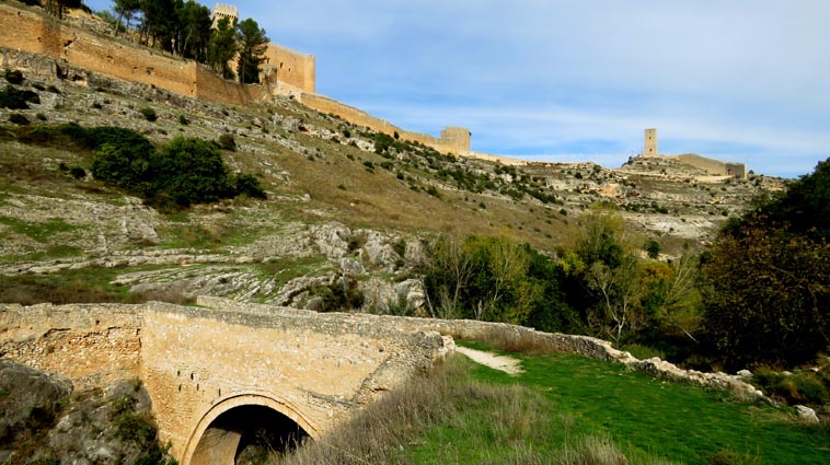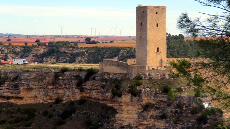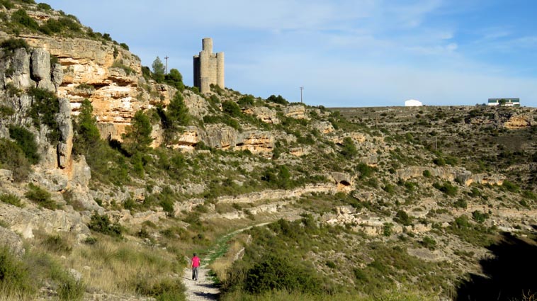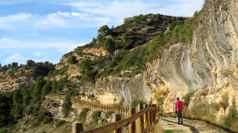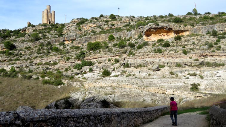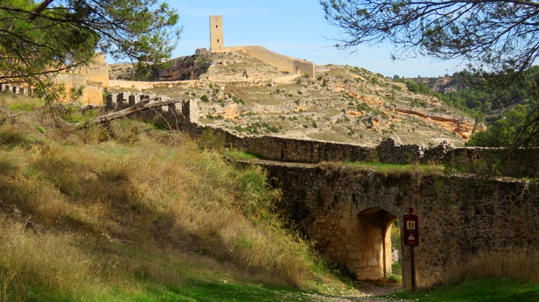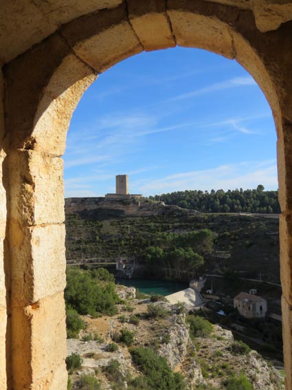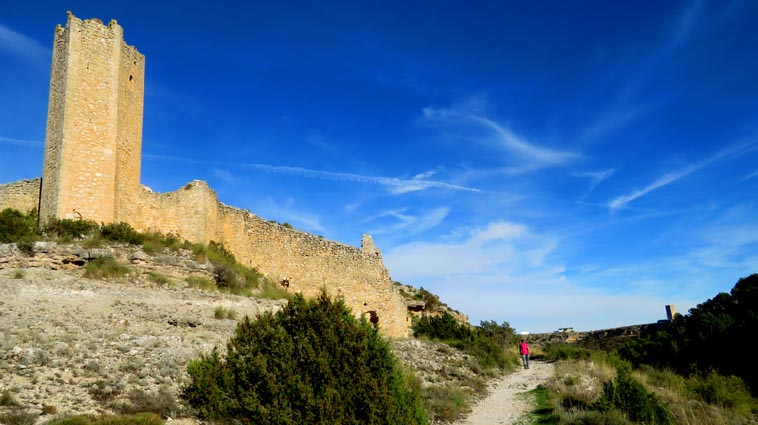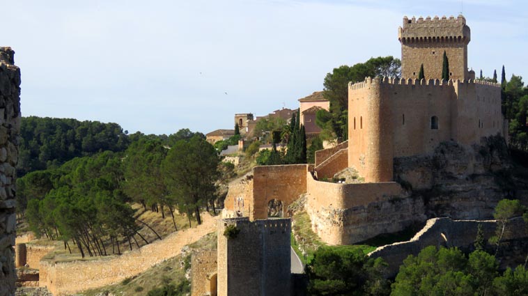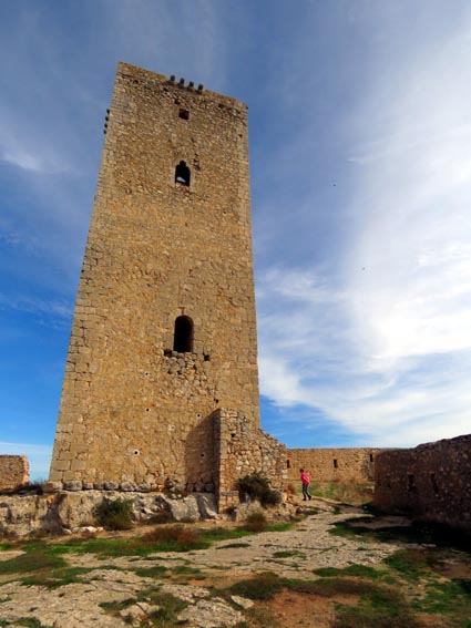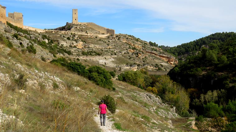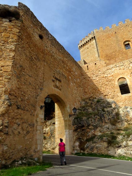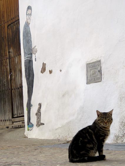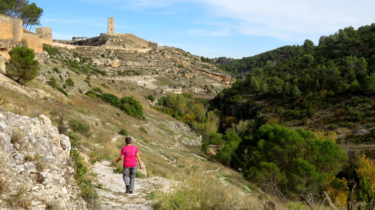 Après avoir fait une jolie balade sur la Route des Visages de Buendía, nous repartons en camping-car vers le Sud. Nous passons à Huete, Carrascosa del Campo, Montalbo et Honrubia, pour rejoindre Alarcón, une commune de la province de Cuenca, dans la communauté autonome de Castilla la Mancha. La cité, implantée dans un méandre du Río Júcar, a conservé la presque totalité de ses remparts. Ce fut successivement un site ibère, romain et visigoth, mais ce n’est seulement que sous domination arabe qu'Alarcon commença à prendre de l’importance. Après un long siège, elle fut conquise par Alfonso VIII qui la fit dépendre du Royaume de Tolède qu’elle ne quittera plus de toute son histoire, devenant un des bastions militaires de la Mancha en y gagnant le surnom de «l’Imprenable». Nous stationnons sur une plateforme sur la droite de la route, un petit kilomètre avant l'entrée dans le village, et nous commençons par manger dans le camping-car avant d'entamer notre randonnée. Depuis ce splendide belvédère, nous avons un point de vue de carte postale sur Alarcón, le río Júcar, et la péninsule de "Los Alarconcillos", formée par un méandre du cours d'eau. Nous sommes juste à côté de la Torre de las Armas, mais nous voyons aussi très bien l'étonnante Torre de Los Alarconcillos, et plus loin la Torre del Cañavate. - 13H18 - 818m (HOAL01) Nous démarrons du parking en direction de la Torre de las Armas. - 13H22 - 821m (HOAL02) Nous passons au pied de la tour où il n'est pas possible de monter, mais nous profitons d'un beau point de vue sur le château et les fortifications de la cité versant Sud. Nous prenons le sentier qui descend sur notre droite en ressortant de l'enceinte fortifiée. - 13H25 - 805m (HOAL03) Nous tournons à droite en arrivant à la route, en franchissant une première porte. Rapidement, nous voyons en contre-bas sur notre droite le Puente de Tébar et la Torre de los Alarconcillos. - 13H32 - 803m (HOAL04) Nous franchissons la Puerta del Calabozo. - 13H35 - 813m (HOAL05) Nous laissons le mirador de la Reina Doña Leonor de Plantagenet sur la gauche, pour franchir une troisième porte au pied du château. - 13H39 - 824m (HOAL06) Nous empruntons la calle "La Solana" qui monte sur la droite. - 13H41 - 835m (HOAL07) Nous tournons à droite sur la "calle Conde Alvaro de Lara", pour rejoindre la "Plaza de la Autonomia". Nous arrivons ainsi aux portes du château d'Alarcón, qui est aujourd'hui devenu un parador. - 13H48 - 836m (HOAL08) Nous allons voir le "Mirador de la Peña" qui se trouve au Nord de la place, et qui nous offre un beau point de vue sur la Torre de los Alarconcillos en particulier, et sur la Torre de las Armas. Mais, nous apercevons aussi, un peu en-dessous à droite de la tour, deux grottes ornées de peintures : l'une représentant des bouquetins ibériques et l'autre un chat (sauvage ?)... Nous repartons par la Calle Julio Poveda. Nous découvrons alors une peinture murale représentant un monsieur qui joue avec un chat, en lui présentant la clé de sa Mercédès... La situation est d'autant plus amusante que, juste à côté se trouve un chat ressemblant beaucoup à celui de la peinture, mais aussi que la clé est plus vraie que nature, identique à celle de notre nouveau camping-car. Il n'en faut pas moins pour que nous devenions aussitôt amis... Nous tournons à gauche pour aller voir le portail Sud de l'église Santa Maria del Campo, conçu comme un grand arc de triomphe de style plateresque par Esteban Jamete (13H52 - 842m (HOAL09)). - 14H00 - 842m (HOAL10) Nous passons devant l'église Santo Domingo de los Silos qui est en cours de restauration. Désacralisée, elle est utilisée aujourd'hui comme salle d'exposition et de réception. - 14H05 - 842m (HOAL11) Nous rejoignons la Plaza Infante Don Juan Manuel, où se trouve la mairie, à côté de l'église Saint Jean Baptiste. Elle aussi est désacralisée, mais les murs intérieurs sont peints par l'artiste contemporain Jesús Mateo. Son œuvre exprime la présence de l'homme sur Terre, les origines de la vie, les rêves, la voûte céleste, l'angoisse, la vie et sa finitude, avec un langage formel contemporain expressif d’une grande intensité dramatique. Ces peintures murales qui couvrent toute la surface de l'église ont été reconnues d'intérêt artistique et culturel par l'UNESCO. Hélas, nous ne pourrons pas la visiter car elle n'est ouverte que du vendredi au dimanche... Nous nous engageons dans la petite rue en face de l'église pour repartir vers le Sud. - 14H08 - 841m (HOAL12) Nous traversons la Calle Alvaro de Lara entre deux nouvelles fresques murales. Un âne qui nous regarde passer au travers de la porte de son écurie, et un tracteur, d'un beau vert "John Deere", dont on aperçoit la remorque au travers de la porte d'une cour... Nous arrivons ainsi à un parking, où nous prenons le temps de discuter un moment avec des camping-caristes de notre département. - 14H17 - 834m (HOAL13) À l'extrémité Ouest du parking, nous prenons un chemin qui descend en direction del l'Ermita Nuestra Señora de la Orden (Camino del cementerio - GR64). - 14H18 - 829m (HOAL14) Nous prenons le sentier qui part sur la gauche en direction du Sendero Hóz de Alarcón / Puente de El Picazo. Il est nommé Camino de las Moreras sur les cartes OpenTopoMap et OpenStreetMap. - 14H20 - 792m (HOAL15) Nous franchissons les murailles de fortification de la cité en passant la Puerta de Chinchilla, également connue sous le nom de porte El Picazo. C'est l'une des six portes encore debout de la cité. Elle servait d'entrée Sud, sur l'itinéraire reliant Alarcón à Chinchilla de Monte Aragón, dans la province d'Albacete, d'où son nom. Sa construction remonte au XVème siècle, avec des rénovations effectuées sous le règne de Juan Pacheco, marquis de Villena. Aussitôt après, nous remarquons que le sentier (balisé en jaune et blanc) a été partiellement taillé dans la roche. -