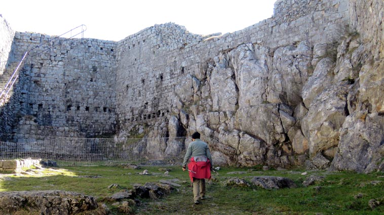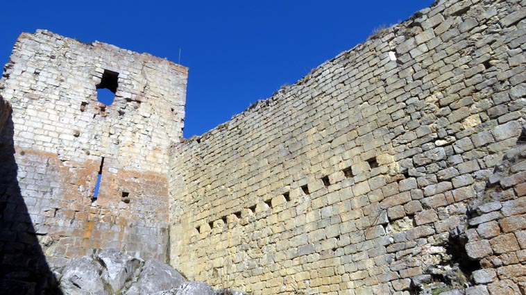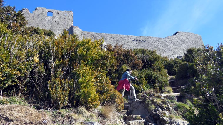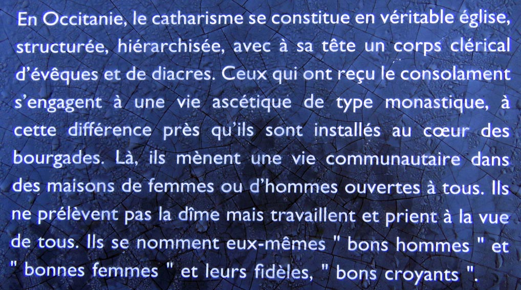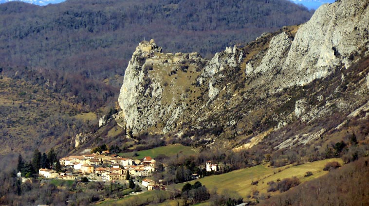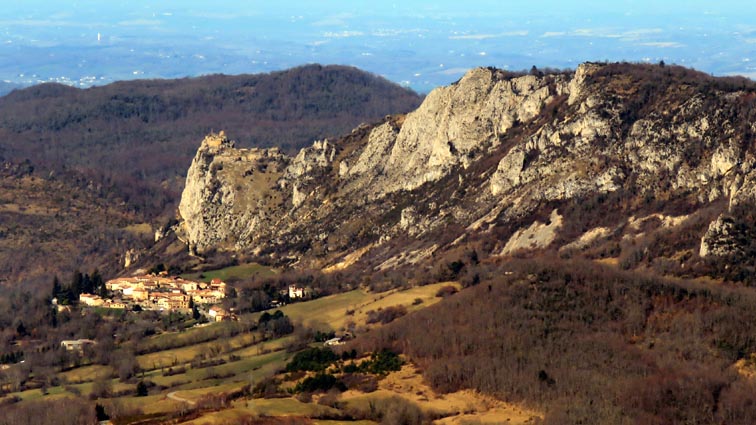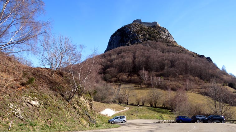 Partis la veille d'Itxassou en camping-car, nous avons dormi sur l'aire de Montferrier (42°53'33'' Nord - 1°47'32'' Est). Nous sommes montés au col de Montségur en matinée, où nous avons pu nous garer sur le grand parking devant le bâtiment d'accueil qui ouvre à 11H00 en cette saison. Il faut souligner que nous y avons été très gentiment accueillis. Le château de Montségur est implanté à 1207m d'altitude, au sommet d'un piton rocheux (un "pog" en occitan). Alors qu'il existait déjà au XIIème siècle, le château de Montségur est devenu au siècle suivant, le siège de l'église cathare, et le refuge des "faydits", les seigneurs qui avaient été dépossédés de leurs terres par la Croisade. Au moins 600 personnes vivaient alors dans ce site. La guerre contre les Albigeois mit à feu et à sang pendant plus de 30 ans une grande partie de l'Occitanie. Mais après l'assassinat de onze inquisiteurs par les "faydits", la nuit du 28 mai 1242, le pape Innocent III ordonna le siège de Montségur qui commencera un an plus tard. Le siège dura 10 mois, avec un hiver très rude. Le 16 mars 1244, plus de 220 cathares furent mis au bûcher, faute d'avoir accepté d'abjurer leur foi. - 11H13 - 1036m (MTSG01) Nous démarrons du bâtiment d'accueil en direction du château qui nous domine à l'Est. - 11H15 - 1040m (MTSG02) Nous croisons le sentier cathare qui descend vers Montferrier sur notre gauche, mais nous continuons à monter en face sur le chemin qui se prolonge par un escalier. Les Ficaires sont en fleurs. - 11H20 - 1051m (MTSG03) Alors que nous atteignons le sommet de l'escalier, nous observons une stèle qui se trouve sur la gauche et qui commémore le martyre des cathares. Nous continuons sur le chemin qui monte sur la droite, au bord duquel nous trouvons quelques Hépatiques. - 11H33 - 1117m (MTSG04) Le chemin est aménagé avec quelques madriers en bois pour servir de marches. Juste après le virage à gauche, nous observons attentivement le panneau qui nous donne des informations sur la religion cathare. Nous commençons à voir le sommet enneigé du Pic de Soularac. - 11H40 - 1144m (MTSG05) Alors que nous passons à côté d'une station d'Hellébore fétide, nous bénéficions d'un superbe point de vue plongeant sur le village de Montségur. Nous avons en face de nous, dans le même axe que le village, la montagne de la Frau. - 11H47 - 1165m (MTSG06) Un nouveau panneau nous renseigne sur les recherches qui depuis 1870 ont permis de retracer l'histoire du catharisme. Nous repérons quelques pieds de Pissenlit des Pyrénées. - 11H55 - 1194m (MTSG07) Nous voici au pied de l'escalier en bois qui va nous permettre d'accéder à l'intérieur du château. Nous constatons qu'il ne reste pas grand chose à l'intérieur et nous sortons donc par la porte Nord-est pour contourner le château. Nous accédons à la salle basse du donjon dont la voute est effondrée. L'intérêt du château de Montségur se situe donc davantage au niveau de son histoire, que sur les vestiges que l'on peut observer. Par contre le point de vue sur le Pic de Soularac et le Saint-Barthélemy est splendide, d'autant qu'ils sont abondamment enneigés. Nous apercevons également un peu plus à l'Ouest, le Rocher de Batail qui est également bien enneigé. Bien plus bas dans la vallée, nous distinguons le village de Roquefixade, dominé par son château implanté au sommet d'un éperon rocheux. Nous redescendons par le même itinéraire et arrivons au col à 12H32. Nous reprenons la route en direction du château de Quéribus. |