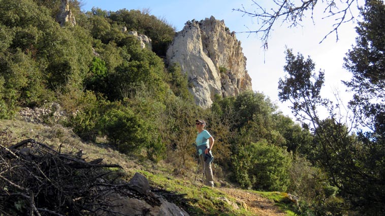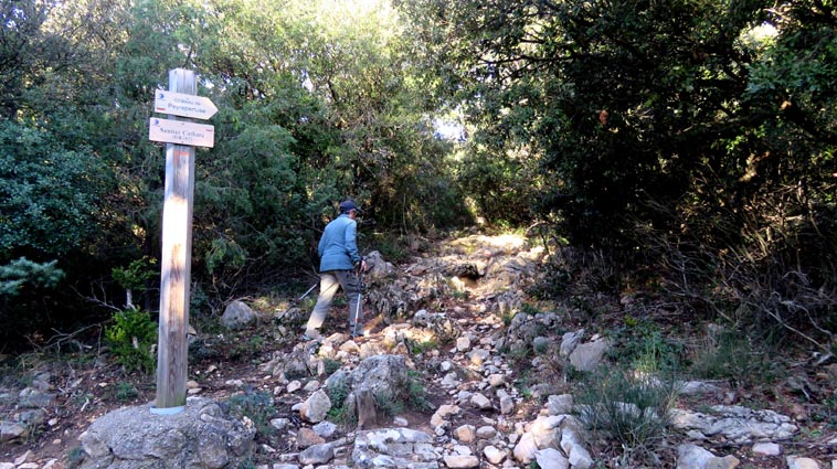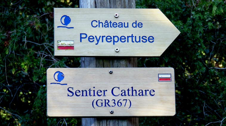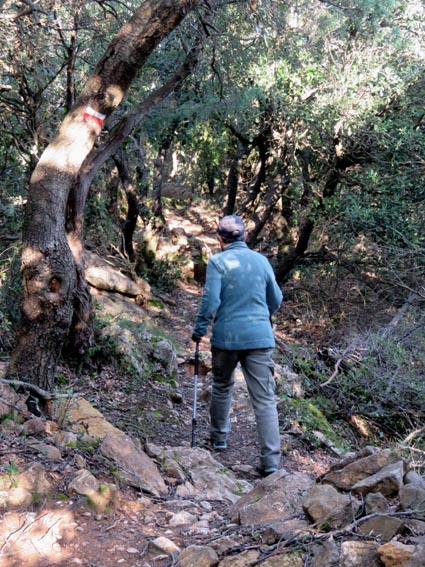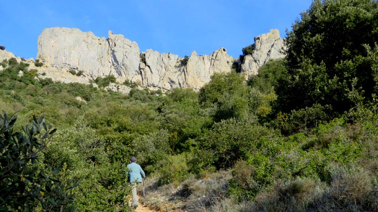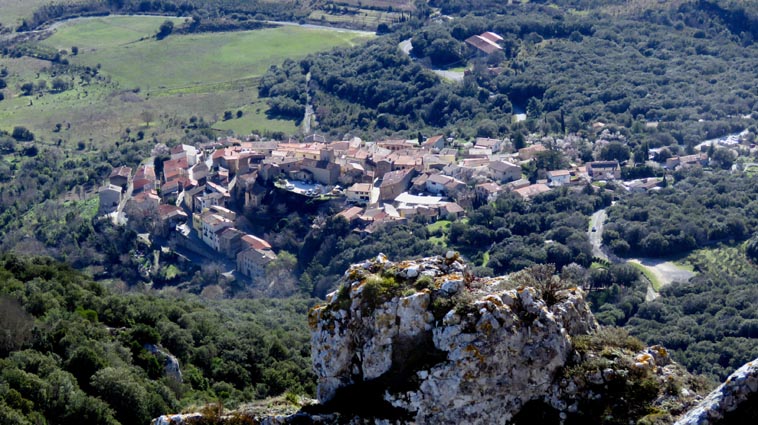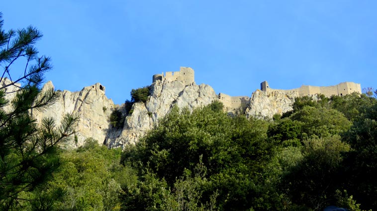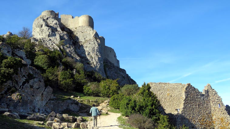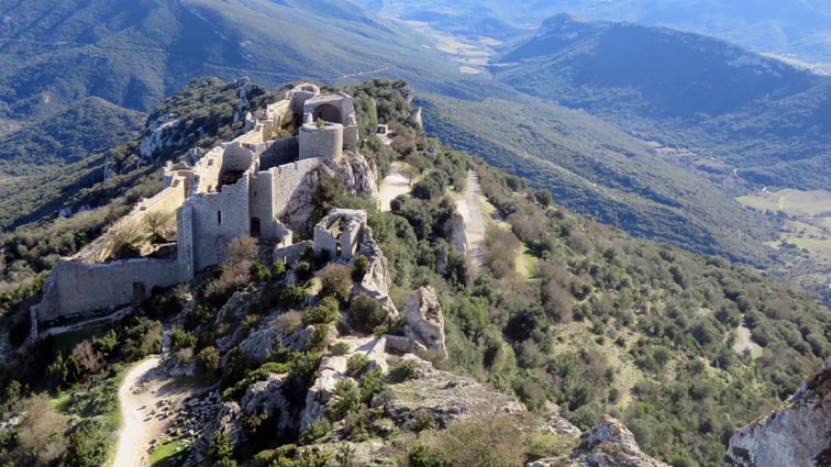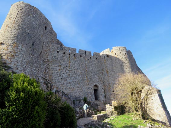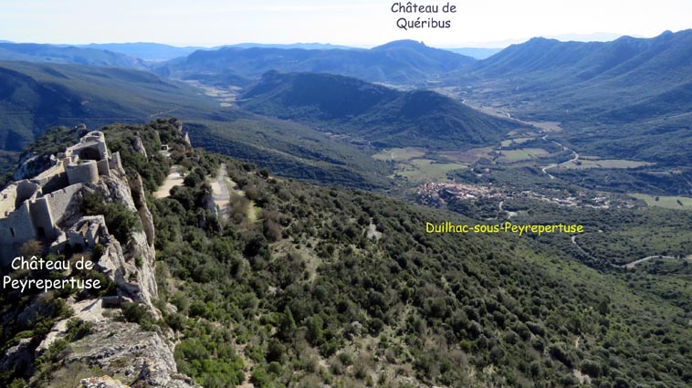Le château de Peyrepertuse se déploie sur 300m de longueur sur la ligne de crête rocheuse, au-dessus du village de Duilhac-sous-Peyrepertuse. Il s'organise en trois grands secteurs : la première enceinte, l'enceinte médiane et le donjon de San Jordi. Déjà cité au IXème siècle, au XIème le château de Peyrepertuse appartenait au comté de Besalu, une petite contrée catalane. Pendant la croisade contre les Albigeois, Guilhem de Peyrepertuse rend hommage à Simon de Montfort, mais continue de résister, notamment en occupant le château de Puilaurens. C'est en 1240 que le roi de France Louis IX (Saint-Louis) prend réellement possession de Peyrepertuse. Son objectif était de protéger les frontières du royaume face au roi d'Aragon. Le château de Peyrepertuse fait partie d'un ensemble nommé couramment "Les Citadelles du Vertige", mais ce n'est pas véritablement un château cathare, même si les cathares ont pu momentanément s'y réfugier. - 8H43 - 361m (PEYP01) Nous démarrons du parking autorisé pour les camping-cars, de Duilhac-sous-Peyrepertuse, en prenant la voie qui se situe derrière le local sanitaire. Nous remarquons la présence importante d'une fleur blanche : la Fausse Roquette (Diplotaxis fausse-Roquette). - 8H44 - 362m (PEYP02) Nous virons à gauche pour monter en direction du château qui se détache sur la ligne de crête rocheuse. Nous nous régalons de voir les Amandiers couverts de fleurs. - 8H46 - 372m (PEYP03) Nous prenons la rue sur la droite qui pénètre dans le village (Chemin de la Batteuse). - 8H47 - 371m (PEYP04) Nous croisons une rue (Route ancienne du château) et continuons en face (Rue du Faubourg). - 8H48 - 370m (PEYP05) Nous obliquons à gauche pour continuer dans une ruelle pavée. - 8H49 - 369m (PEYP06) Nous prenons le chemin balisé en jaune qui monte sur la gauche. Au bout d'une soixantaine de mètres, nous passons entre une aire de jeux pour enfants et un terrain de basquet. - 8H53 - 388m (PEYP07) Nous rejoignons la route au niveau du parking P2, et nous l'empruntons en montant sur la droite. - 8H57 - 406m (PEYP08) Nous prenons le chemin caillouteux qui monte sur la droite en direction du château de Peyrepertuse, par le sentier cathare GR367. Nous remarquons que certains passages de ce chemin ont été pavés. - 9H05 - 442m (PEYP09) Le sentier vire à droite sous les Chênes verts, juste en-dessous de la route. - 9H06 - 442m (PEYP10) Lorsque le sentier se divise en deux, nous prenons la branche de gauche, balisée en rouge et blanc. - 9H07 - 448m (PEYP11) Nous quittons le GR en empruntant le sentier balisé en jaune qui monte sur la droite en direction du château. - 9H31 - 580m (PEYP12) À la faveur d'une éclaircie de la végétation et de quelques mètres de chemin où la pente s'assagit, nous pouvons voir le château qui se détache en face de nous, mais il nous paraît encore bien loin et bien haut ! - 9H35 - 602m (PEYP13) Nous traversons la route, et prenons le chemin qui monte en face vers la gauche, malgré une croix rouge et blanche. - 9H37 - 604m (PEYP14) Nous prenons le sentier balisé en jaune qui monte sur la droite. - 9H42 - 639m (PEYP15) Nous avons encore un superbe point de vue sur le château. - 9H49 - 672m (PEYP16) Nous rejoignons la route, et nous l'empruntons en montant sur notre gauche. Nous voyons le château de Quéribus avec la Méditerranée en arrière plan, mais nous voyons aussi très bien le massif du Madrès qui est très enneigé (direction Sud-ouest), ainsi que le Carlit qui pointe sur la droite. - 10H05 - 694m (PEYP17) Nous passons au bâtiment d'accueil pour acheter les billets d'entrée et pour prendre des audio-guides. Nous suivons le sentier qui commence par descendre légèrement avant de virer à gauche pour monter versant Nord en direction du château. Le chemin est relativement escarpé, et légèrement glissant à cause des nombreuses pluies qui se sont abattues ces dernières semaines. Quelques passages sont aménagés avec des escaliers en pierres. Nous dominons le village de Rouffiac-des-Corbières. Nous passons une première porte qui donne accès à la loge du portier, puis nous observons la longue muraille de 120m de long qui ferme l'enceinte de la partie inférieure du château côté Nord. Nous accédons ensuite au donjon vieux, où nous voyons en particulier les restes de l'église Sainte-Marie, datée du XIème siècle. Nous passons la porte du donjon vieux pour rejoindre l'enceinte médiane. Le bâtiment polygonal comprenait deux niveaux, le rez-de-chaussée pour les animaux et l'étage pour le grain. On voit encore un orifice dans le sol pour accéder à une glacière naturelle où pouvaient être conservées les denrées alimentaires. - 10H54 - 755m (PEYP18) Nous voici au pied de l'escalier de Saint-Louis, qui va nous permettre d'accéder au donjon "San Jordi", un ensemble qui dote la forteresse de bâtiments modernes (en 1242) et lui confère un caractère puissant, véritable arme de dissuasion... - 11H06 - 782m (PEYP19) Nous voici au sommet du donjon de San Jordi où nous trouvons les vestiges d'une chapelle. Mais c'est le point de vue qui s'offre à nous qui récompense les efforts de notre ascension : château de Quéribus, Puig Neulós, Madrès, Pech de Bugarach, et même le Pic Saint-Loup au Nord-est. - 11H25 - 694m (PEYP17) Nous repassons au bâtiment d'accueil et descendons par le même itinéraire. Au cours de la descente nous trouvons des Hépatiques, des Véroniques petit-chêne, des Pâquerettes vivaces, de l'Euphorbe des bois et de l'Hellébore fétide. - 11H25 Nous voici de retour au point de départ. Nous repartons par Cucugnan, Padern, Tuchan, Villeneuve-les-Corbières, Durban-les-Corbières, Thézan-des-Corbières, Ferrals-les-Corbières, Foncouverte, Capendu, Marseillette, Aigues-Vives et Laure-Minervois pour rejoindre le gouffre géant de Cabrespine : 43°21'28.0'' Nord - 2°27'23.2'' Est. Nous nous installons sur le premier parking ombragé pour y passer la nu