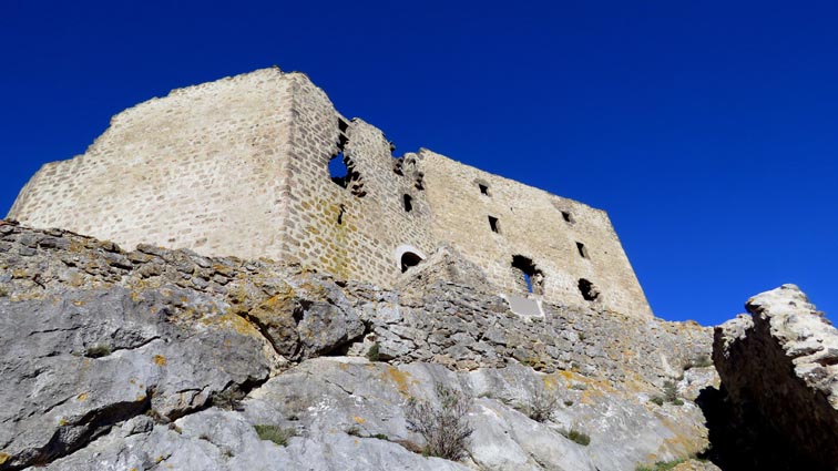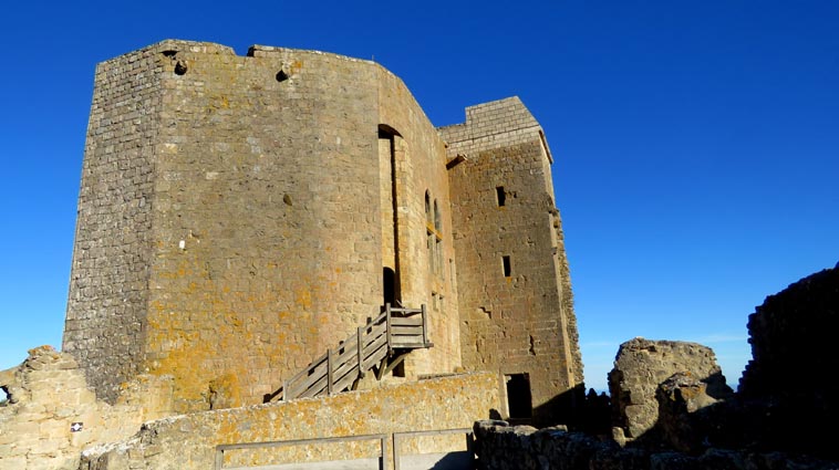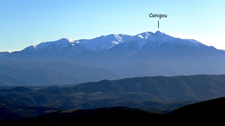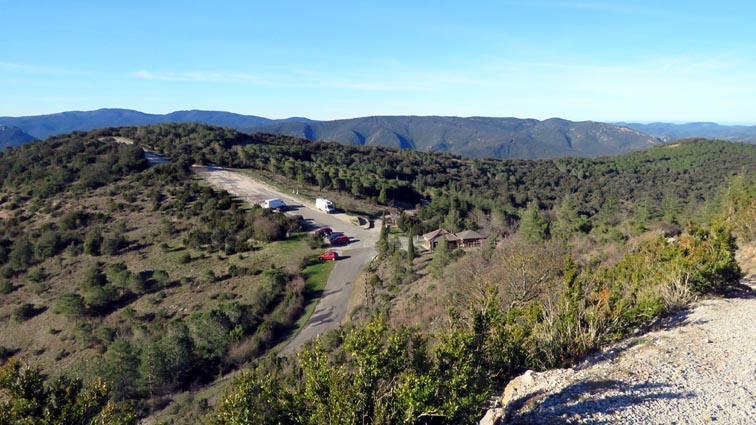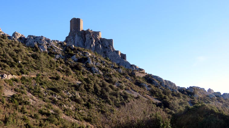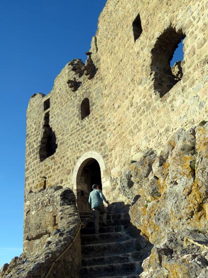 Après avoir visité le château de Montségur, nous sommes repartis en camping-car par Belosta, Puivert et Quillan. Nous sommes passés à Saint-Paul-de-Fenouillet pour rejoindre Maury où nous avons tourné à gauche en direction de Cucugnan et des Châteaux de Quéribus et de Peyrepertuse. Avant d'arriver à Cucugnan, nous avons tourné à droite au niveau du col, en direction du château de Quéribus. Nous avons pu nous garer sans problème sur le parking situé en-dessous du château, à proximité du bâtiment d'accueil : 42°50'20.7'' Nord - 2°37'16.5'' Est. Le château de Quéribus est implanté à un peu plus de 700m d'altitude, au sommet d'un piton rocheux. Quéribus est mentionné pour la première fois au XIème siècle. Après sa prise en 1255, il est intégré au dispositif de défense de la frontière de la France avec l'Aragon. Contrairement à ce que l'on pourrait penser, il n'a rien de cathare, malgré le fait qu'il en fut l'un des derniers refuges... L'annexion du Roussillon par la France en 1659, dans le cadre du traité des Pyrénées, a repoussé la frontière jusqu'aux Pyrénées, diminuant fortement son importance stratégique. Le château s'est dégradé jusqu'en 1951, date à partir de laquelle il a été progressivement restauré. D'une enceinte à l'autre, Quéribus dévoile l'organisation d'une forteresse importante. Les éléments du Moyen-âge s'enchevêtrent avec ceux de la Renaissance, formant un ensemble homogène garantissant l'efficacité des défenses et la qualité de vie pour ses occupants. - 16H07 - 606m (QUER01) Nous démarrons du bâtiment d'accueil sur un chemin parfaitement bien aménagé. - 16H08 - 610m (QUER02) Le chemin vire à droite en direction du château. En nous retournant, nous distinguons déjà très bien le château de Peyrepertuse, implanté sur une ligne de crête rocheuse, direction Nord-ouest. - 16H15 - 651m (QUER03) Nous voici déjà au pied de l'escalier d'accès au château. - 16H22 - 666m (QUER04) Nous franchissons la porte d'entrée de la première enceinte, et bénéficions déjà d'un splendide point de vue qui s'étend jusqu'à la Méditerranée. Nous repérons en particulier la Tour de Tautavel et le Puig Neulós. Il nous faut monter un escalier aux marches particulièrement hautes pour accéder à la troisième enceinte, où nous pénétrons par une porte surmontée d'une bretèche. Nous traversons une étonnante salle dont le plafond est constitué de quatre voutes en croisées d'ogive, réparties au sommet d'un imposant pilier central. Ce système architectural contribuait à rendre l'ouvrage quasi indestructible. - 16H40 - 706m (QUER05) Nous voici au sommet du donjon. Le point de vue sur les Pyrénées est splendide, avec en particulier le Canigou qui est particulièrement enneigé. Nous dominons le village de Cucugnan et apercevons Duilhac-sous-Peyrepertuse. - 16H54 Nous sommes de retour au parking. Nous redescendons jusqu'au col où nous tournons à droite pour rejoindre le village de Duilhac-sous-Peyrepertuse où nous allons nous installer sur un parking où les camping-cars ont le droit de rester pour la nuit (il y a même une aire de vidange et un point d'eau) : 42°51'41.8'' Nord - 2°33'54.4'' Est).