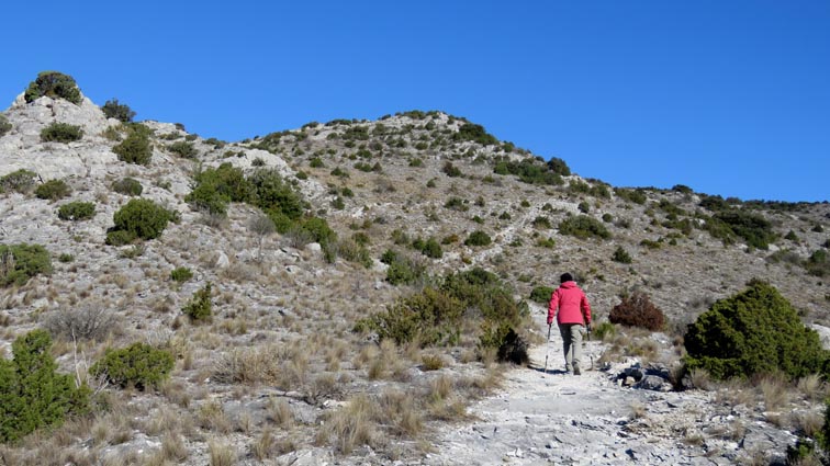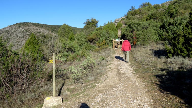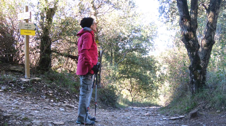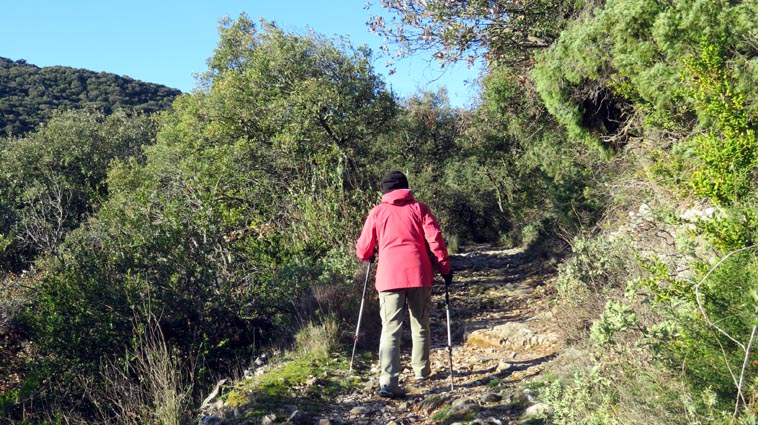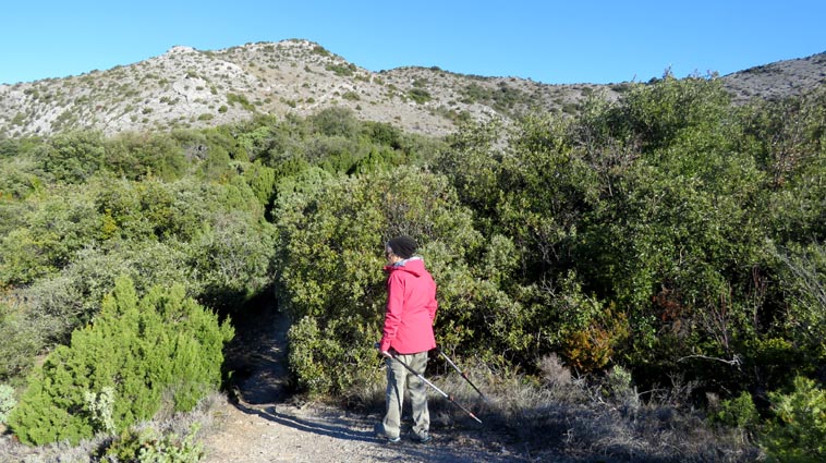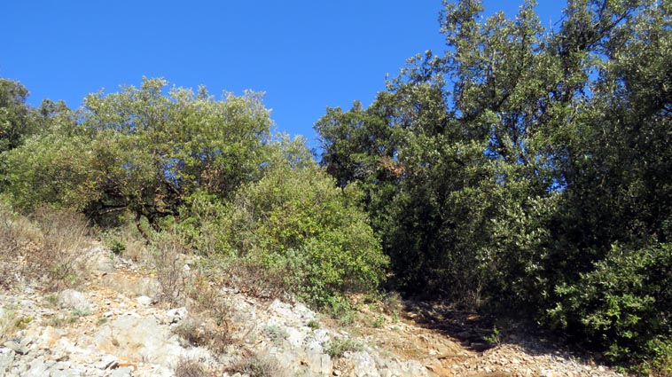 Après avoir visité le magnifique gouffre géant de Cabrespine, nous avons passé une nuit parfaitement calme sur le parking. - 9H08 - 416m (ROCA01) Nous démarrons du parking inférieur du gouffre géant de Cabrespine en montant sur la route. - 9H13 - 427m (ROCA02) Nous passons devant l'entrée du gouffre, et continuons en face, en longeant le mur parapet qui se trouve sur la droite. - 9H15 - 429m (ROCA03) Nous tournons à gauche pour emprunter la piste en béton qui monte en direction de l'arbre aux racines. - 9H17 - 433m (ROCA04) Nous prenons le chemin qui monte sur la droite. - 9H18 - 439m (ROCA05) Nous nous arrêtons pour lire les explications concernant l'arbre aux racines. Il s'agit d'un simple chêne vert, dont les racines plongent à 7m sous terre, et que nous avons pu voir lorsque nous avons visité le gouffre. Nous pouvons donc réaliser à quel point la couche de roche qui nous sépare du gouffre est mince... Quand on pense que la profondeur du gouffre est de l'ordre de 250m, on peut imaginer la chute que pourrait provoquer un effondrement de la voûte de cette spectaculaire cavité... Nous apprenons que nous sommes sur le chemin des "Escoles", et qu'avant 1850, c'était la seule voie qui permettait de rejoindre la plaine. Il reliait le village de Cabrespine à Tramassel. Des générations de Cabrespinois sont donc passées ici avec des chariots lourdement chargés, durant des siècles et des siècles, sans se douter de l'existence du gouffre. Nous découvrons aussi que nous sommes en Montagne Noire, au pays de la truffe. Ce fameux chêne aux racines est lui-même un chêne truffier. - 9H28 - 468m (ROCA06) Nous laissons une ruine de bergerie sur notre gauche, alors qu'un nouveau panneau d'information nous en apprend un peu plus sur la récolte de la truffe au mois de février, et sur l'élevage ovin qui fut important autrefois dans le secteur. - 9H32 - 489m (ROCA07) Lorsque le chemin se divise en deux branches, nous continuons sur celle de droite, bien balisée en jaune. - 9H38 - 518m (ROCA08) Nous arrivons à un carrefour, lieu dit : "Tressanel", et justement le sentier de la truffe nous y rejoint par la gauche. Nous continuons en descendant en face de nous en direction du Roc de l'Aigle. - 9H41 - 510m (ROCA09) Nous franchissons un portail qui nous permet de passer une clôture destinée à protéger les plantations des dégâts causés par les sangliers. - 9H46 - 503m (ROCA10) Le chemin vire à gauche après une grange. - 9H47 - 496m (ROCA11) Nous laissons un sentier qui descend sur la gauche en direction d'une grotte, et nous continuons à monter en face de nous, toujours en direction du Roc de l'Aigle. Nous laissons rapidement un second sentier sur la gauche et continuons notre progression sous les chênes verts. - 9H48 - 500m (ROCA12) Nous franchissons un second portail. - 9H52 - 516m (ROCA13) Et voici un troisième portail... - 9H54 - 516m (ROCA14) Nous laissons un sentier qui descend sur la gauche en direction de Trassanel, pour continuer en face de nous en franchissant une chicane en rondins. Nous accédons ainsi à une portion d'itinéraire où la pente est un peu plus sévère. - 9H58 - 546m (ROCA15) Le sentier vire à gauche au sommet d'une petite butte. - 10H04 - 576m (ROCA16) Au niveau d'un cairn, le sentier balisé en jaune se poursuit sur la gauche (une croix jaune interdit de monter sur la droite pour éviter d'amplifier l'érosion du terrain). - 10H10 - 605m (ROCA17) Un panneau nous renseigne sur l'évolution du paysage des Escoles depuis 1948. Il y avait peu de végétation au niveau où nous nous trouvons, et en contrebas, il y avait des terrasses cultivées. Progressivement abandonnées, ces terrasses furent colonisées, en particulier par les Genévriers de Phénicie. Le sentier que nous avons parcouru s'est divisé en plusieurs branches sur certains tronçons, et l'érosion a progressé en même temps que la fréquentation du massif. C'est pour cette raison qu'il est recommandé de ne pas sortir des itinéraires balisés. - 10H15 - 631m (ROCA18) Le chemin se poursuit sur la ligne de crête en direction du Roc de l'Aigle. - 10H21 - 657m (ROCA19) Un panneau nous dirige vers la droite, en direction du "Point 700" et du Roc de l'Aigle. - 10H26 - 670m (ROCA20) Un alignement de cairns attire notre attention. Un panneau nous indique qu'ils ont été ainsi placés pour protéger une station de Minuartie à fleurs de Lin. Bien évidemment, elles ne sont pas en fleurs actuellement... Nous continuons en suivant la ligne de crête direction Est, accompagnés d'un rougequeue noir. - 10H32 - 681m (ROCA21) Nous voici au sommet du Roc de l'Aigle, d'où nous dominons le village de Cabrespine. Au Nord, la Montagne Noire est en majorité couverte de forêt, alors qu'au Sud, le Canigou est très enneigé. Plus à droite se détachent le Madrès et le Tarbésou, puis le Pic de Soularac et le Saint-Barthélemy. Viennent ensuite le massif du Montcalm, le Mont Valier, et nous apercevons même tout au bout de la chaîne, le Pic du Midi de Bigorre. Ce petit sommet est véritablement un beau belvédère sur les Pyrénées. Nous redescendons par le même itinéraire, et en arrivant à proximité de notre lieu de bivouac, nous trouvons de l'Erodium à feuilles de Cigüe, du Romarin et des Soucis des champs. Nous observons également un très beau papillon aux ailes colorées : le Paon du jour. - 11H37 Nous voici de retour au point de départ. Nous mangeons dans le camping-car avant de reprendre la route, pour arriver en fin d'après-midi à Itxassou.