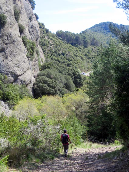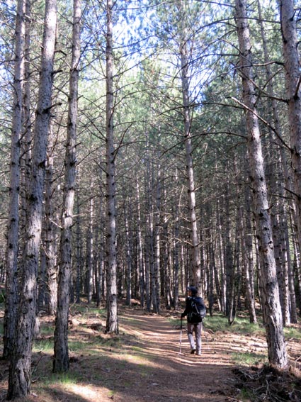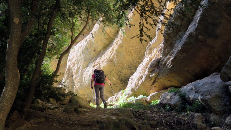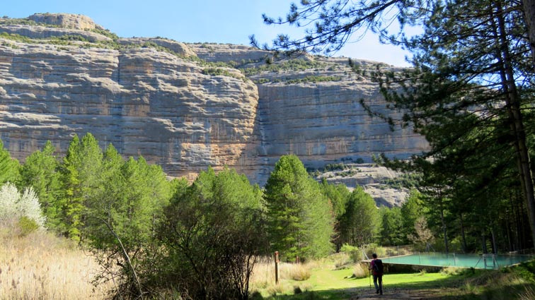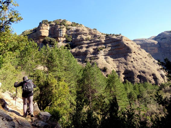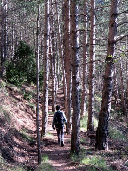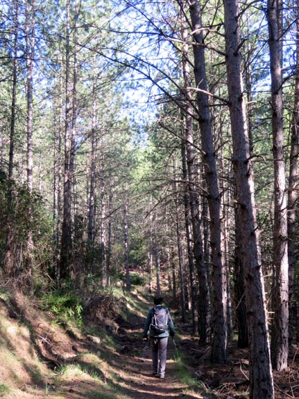 - 9H25 - 717m (ESCH01) Nous démarrons du "parking del Canal del Palomo", en empruntant un sentier en direction de Santa Eulalia la Mayor. Au départ du sentier, un panneau donne des explications sur l'ermitage San Chinés et son environnement. Il nous indique que cet ermitage d'origine hispano-wisigothique est situé au pied de Peña Foratata, sous une impressionnante paroi rocheuse. Ce fut un lieu de pèlerinage pour les fidèles jusqu'au XIXème siècle. Il y a des Pâquerettes vivaces, du Muscari en grappe, des Asphodèles, du Genêt scorpion, des Violettes des bois et du Romarin. Nous prenons le temps d'observer des chèvres qui escaladent les parois rocheuses. - 9H31 - 713m (ESCH02) Nous tournons à gauche en direction de Santa Eulalia la Mayor et nous traversons le barranco de Vadiello. Nous franchissons quelques marches d'escalier avant de poursuivre sur un chemin qui monte assez raide sous le couvert de la forêt. Nous observons des chenilles processionnaires qui se déplacent à la queue leu leu sur un rondin couché sur le sol. - 9H41 - 745m (ESCH03) Après une portion de chemin relativement horizontale, nous virons à gauche, toujours en direction du village de Santa Eulalia la Mayor annoncé à 6,200km. Nous trouvons maintenant des Hépatiques trilobées, des Primevères vraies et de l'Hellébore fétide. - 9H50 - 768m (ESCH04) Nous cheminons sur un sentier très agréable en forêt, et franchissons encore quelques marches d'escalier. - 9H53 - 775m (ESCH05) Nous tournons à gauche sur une piste, toujours en direction du village de Santa Eulalia la Mayor annoncé maintenant à 5,600km. - 9H58 - 780m (ESCH06) Après une zone humide, nous trouvons enfin un panneau annonçant la direction de San Chinés en face de nous. Nous remarquons que les Prunelliers sont en fleurs. - 10H01 - 785m (ESCH07) Un abreuvoir adossé à une réserve d'eau se trouve sur la gauche de notre chemin. Un panneau d'information nous renseigne sur la formation des roches conglomératiques qui caractérisent l'environnement qui nous entoure. - 10H04 - 797m (ESCH08) Nous passons devant une prise d'eau, et la piste se poursuit à l'horizontale. - 10H10 - 815m (ESCH09) Un panneau nous invite à emprunter le chemin qui part sur notre droite, en direction de l'ermitage San Chinés annoncé à 1,400km. Nous passons sous des Merisiers qui sont en pleine floraison. Le sentier se poursuit à l'ombre de la forêt, ce que nous apprécions beaucoup car il fait déjà chaud. Nous constatons que tout le secteur a été labouré par les sangliers, à l'exception du sentier qui étonnamment n'a absolument pas été dégradé... - 10H26 - 874m (ESCH10) Au niveau d'un cairn, nous laissons un sentier qui part sur la gauche, pour continuer sur celui qui descend en face de nous (direction Nord-ouest). Quelques mètres plus loin, nous remarquons que le panneau indicateur qui devait se trouver sur un piquet a disparu. C'est bien dommage car c'est un des rares points où la direction à prendre n'est pas forcément évidente (à moins d'avoir préparé comme nous l'itinéraire sur un GPS). Cependant, très vite, nous trouvons quelques cairns. - 10H34 - 844m (ESCH11) Nous franchissons un passage un petit peu escarpé, sur des rochers à découvert. Nous avons ainsi un beau point de vue sur les falaises qui se dressent en face de nous. Mais, rapidement, le sentier redevient confortable sous le couvert de la forêt. - 10H40 - 806m (ESCH12) Nous traversons le lit du "Barranco de Vadiello" qui est à sec. Juste après, le sentier remonte assez sévèrement. Nous trouvons quelques pieds de Crépide de Nîmes. - 10H46 - 840m (ESCH13) Nous nous retrouvons dans un décor minéral somptueux au sommet d'un raidillon. Un percnoptère d'Egypte et quelques vautours fauves passent au-dessus de nos têtes. C'est l'occasion de faire une courte pause pour les observer, avant de continuer sur le sentier qui descend sur la gauche, au pied d'une immense paroi rocheuse. - 11H00 - 807m (ESCH14) Le GPS a des difficultés à définir notre position, mais l'itinéraire en pied de paroi est évident. Nous arrivons ainsi à l'ermitage San Chinés, niché en pied de falaise sous un surplomb, et dont il ne reste qu'un seul mur. L'ermitage San Chinés et le ravin de Vadiello forment un ensemble d'un grand intérêt, grâce à la beauté spectaculaire du ravin et au charme patrimonial de l'ermitage, empreint d'un sentiment d'isolement et de recueillement. - 11H18 Nous nous remettons en route pour revenir par le même itinéraire. - 12H20 Nous voici de retour au point de départ. Nous prenons le temps de manger dans le camping-car avant de repartir en direction de Castilsabás. Mais nous nous arrêtons un peu avant le village pour aller voir la Piedra de los Moros. |